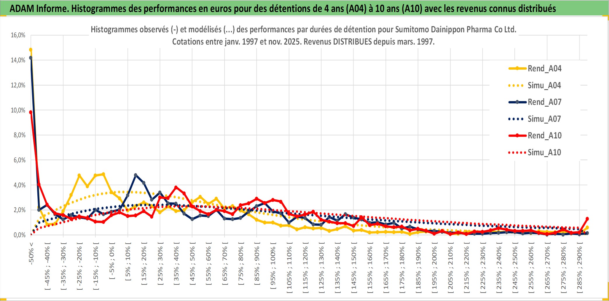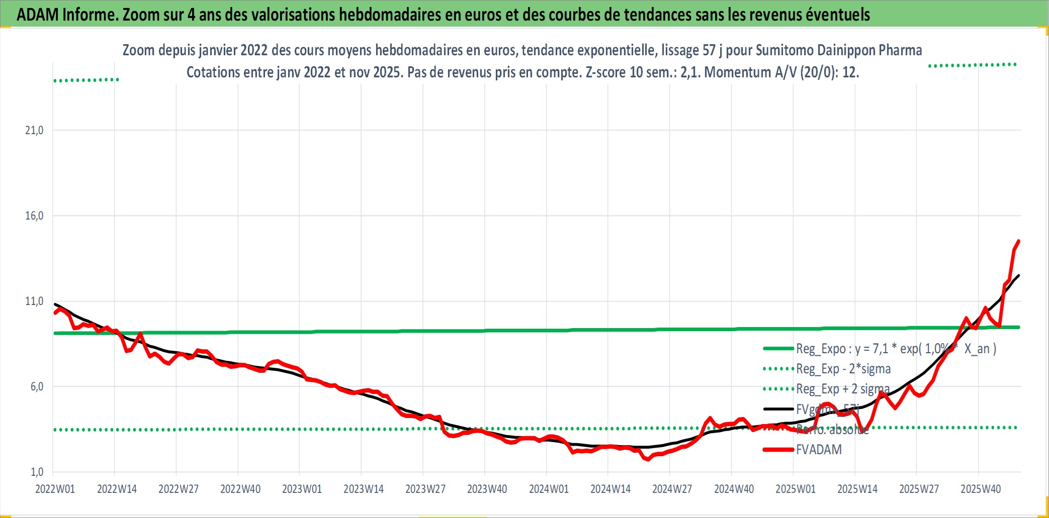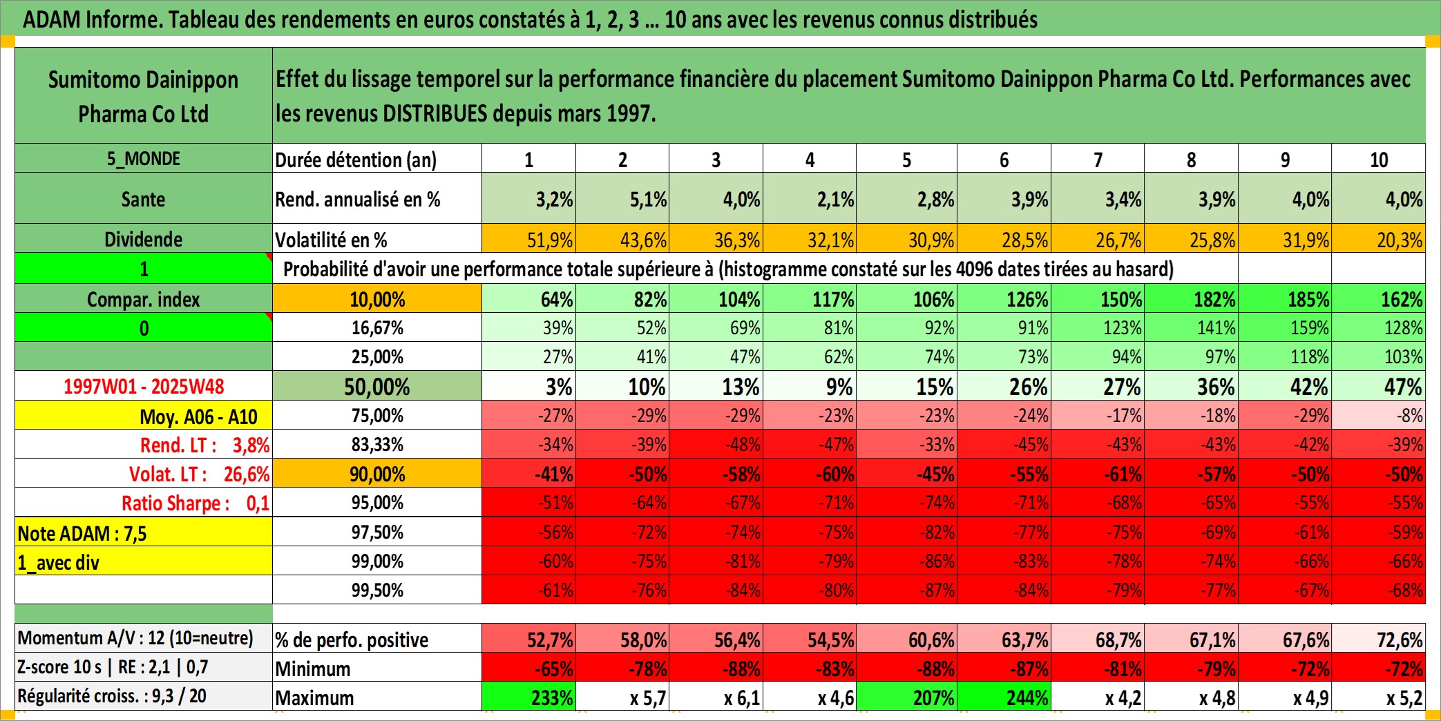 Site dédié aux investisseursPage dédiée sur site financeAnalyse des valorisations hebdomadaires de l'action Sumitomo Dainippon Pharma Co Ltd. Cet actif est cote en JPY. Les valorisations sont en contrevaleur EURO et couvrent les semaines 1997W01 a 2025W48. Les revenus de cet actif financier sont pris en compte depuis la semaine 1997W13. La note globale ESG de cet actif est estimee a 6.0 (apres rebasage entre 0 et 20).