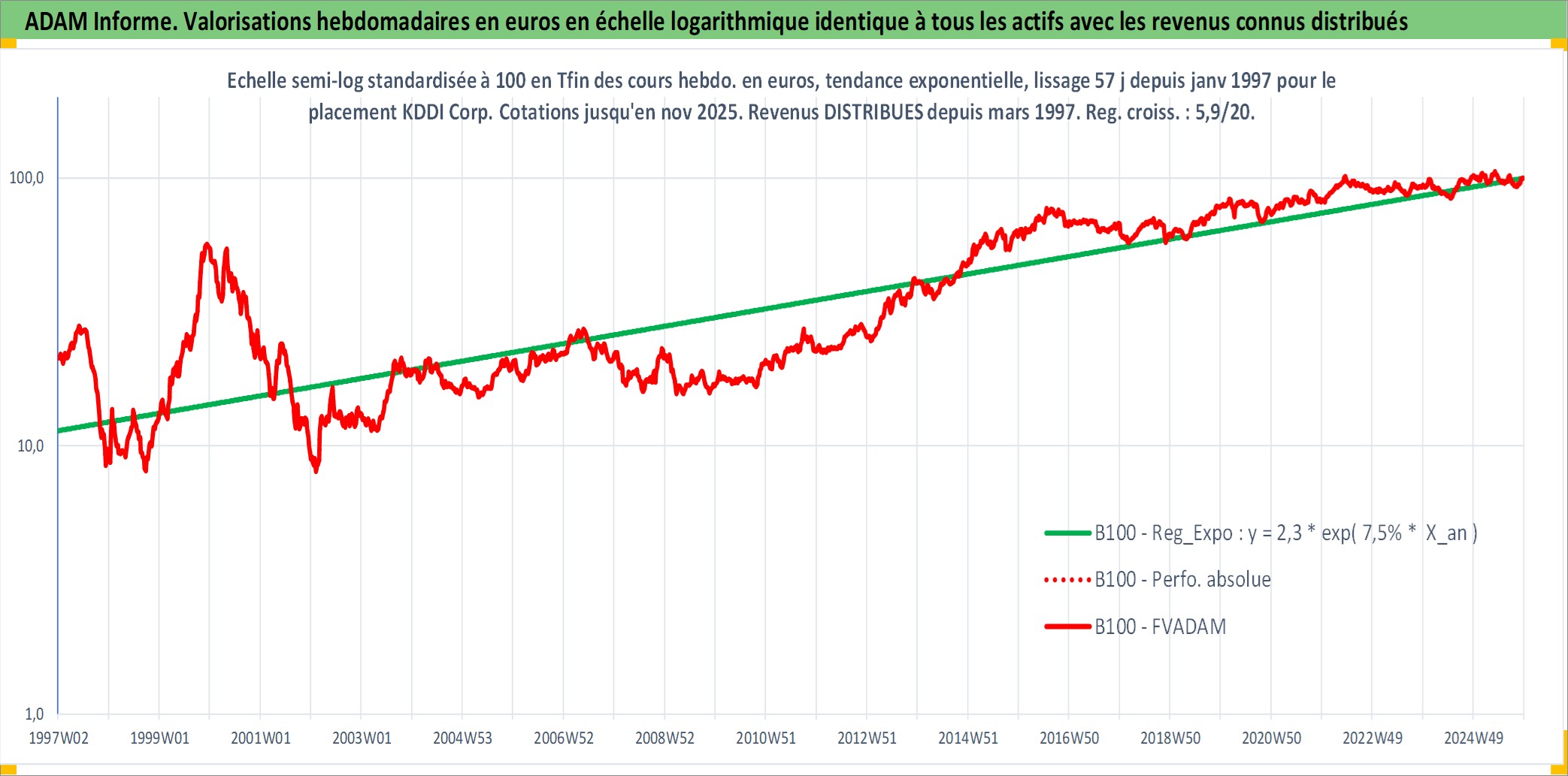 Site dédié aux investisseursPage dédiée sur site financeAnalyse des valorisations hebdomadaires de l'action KDDI Corp. Cet actif est cote en JPY. Les valorisations sont en contrevaleur EURO et couvrent les semaines 1997W01 a 2025W48. Les revenus de cet actif financier sont pris en compte depuis la semaine 1997W13. La note globale ESG de cet actif est estimee a 10.0 (apres rebasage entre 0 et 20).