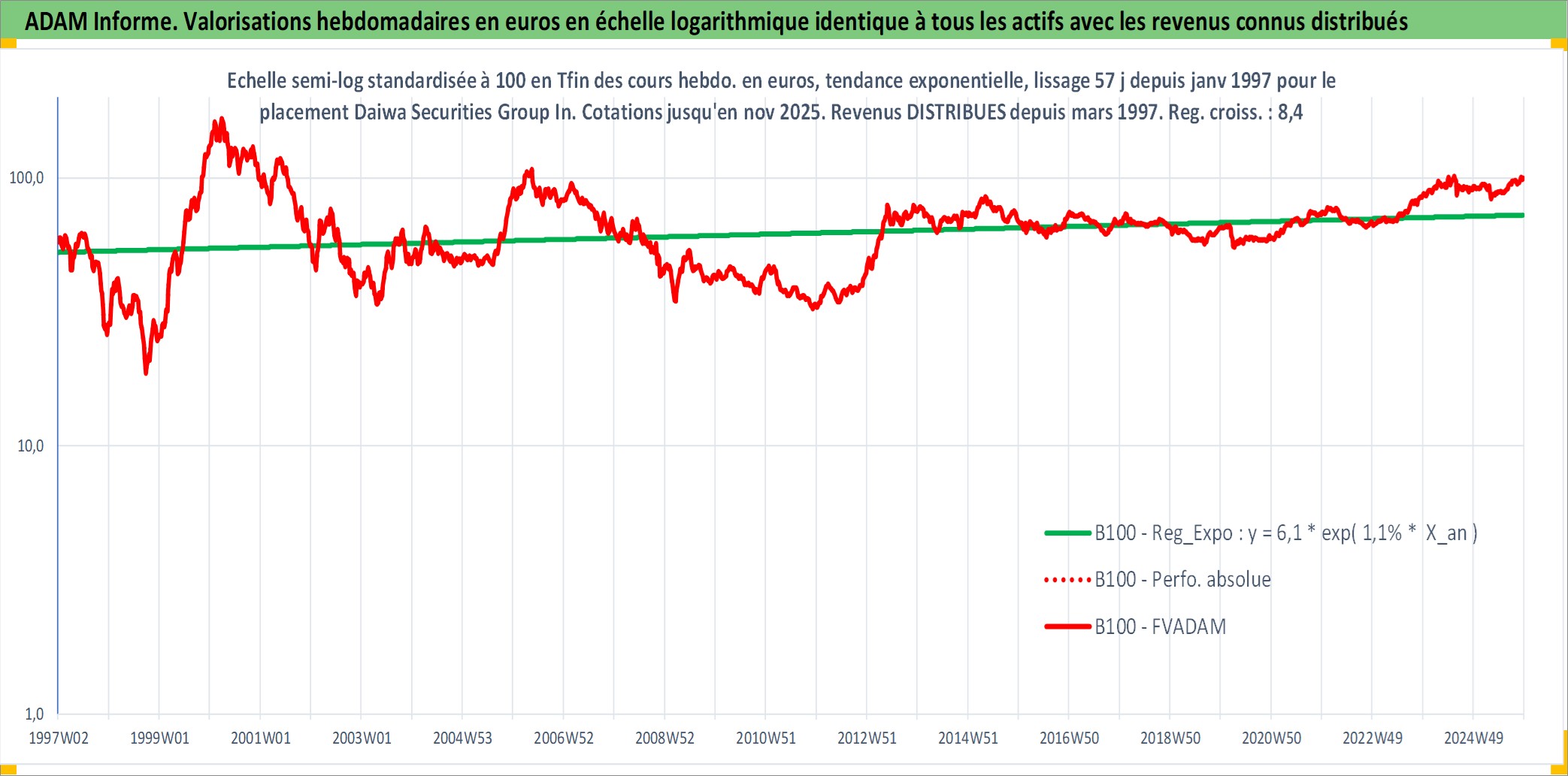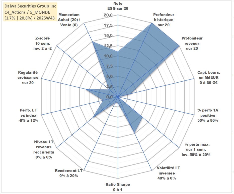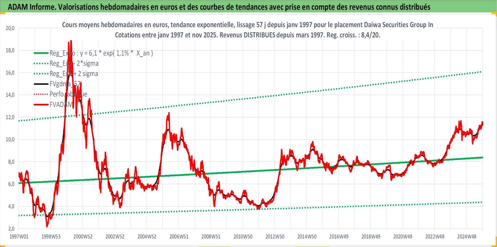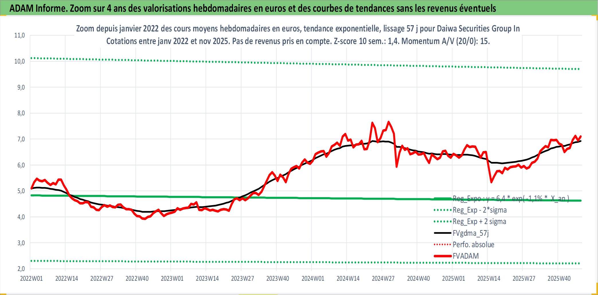 Site dédié aux investisseursPage dédiée sur site financeAnalyse des valorisations hebdomadaires de l'action Daiwa Securities Group Inc. Cet actif est cote en JPY. Les valorisations sont en contrevaleur EURO et couvrent les semaines 1997W01 a 2025W48. Les revenus de cet actif financier sont pris en compte depuis la semaine 1997W13. La note globale ESG de cet actif est estimee a 11.0 (apres rebasage entre 0 et 20).
