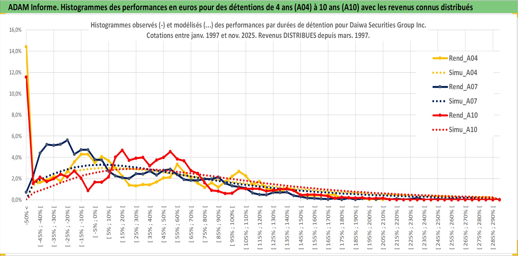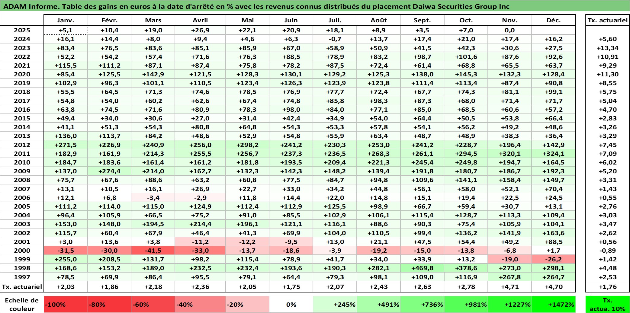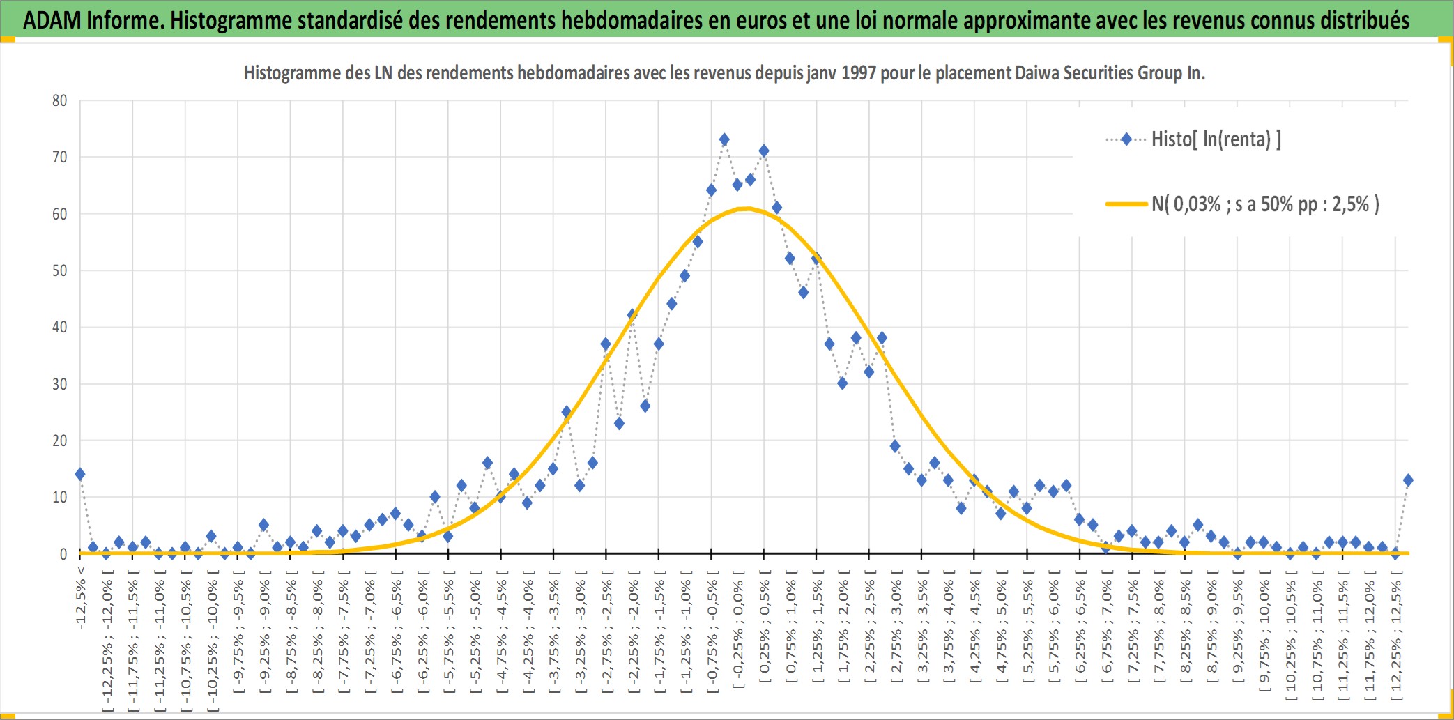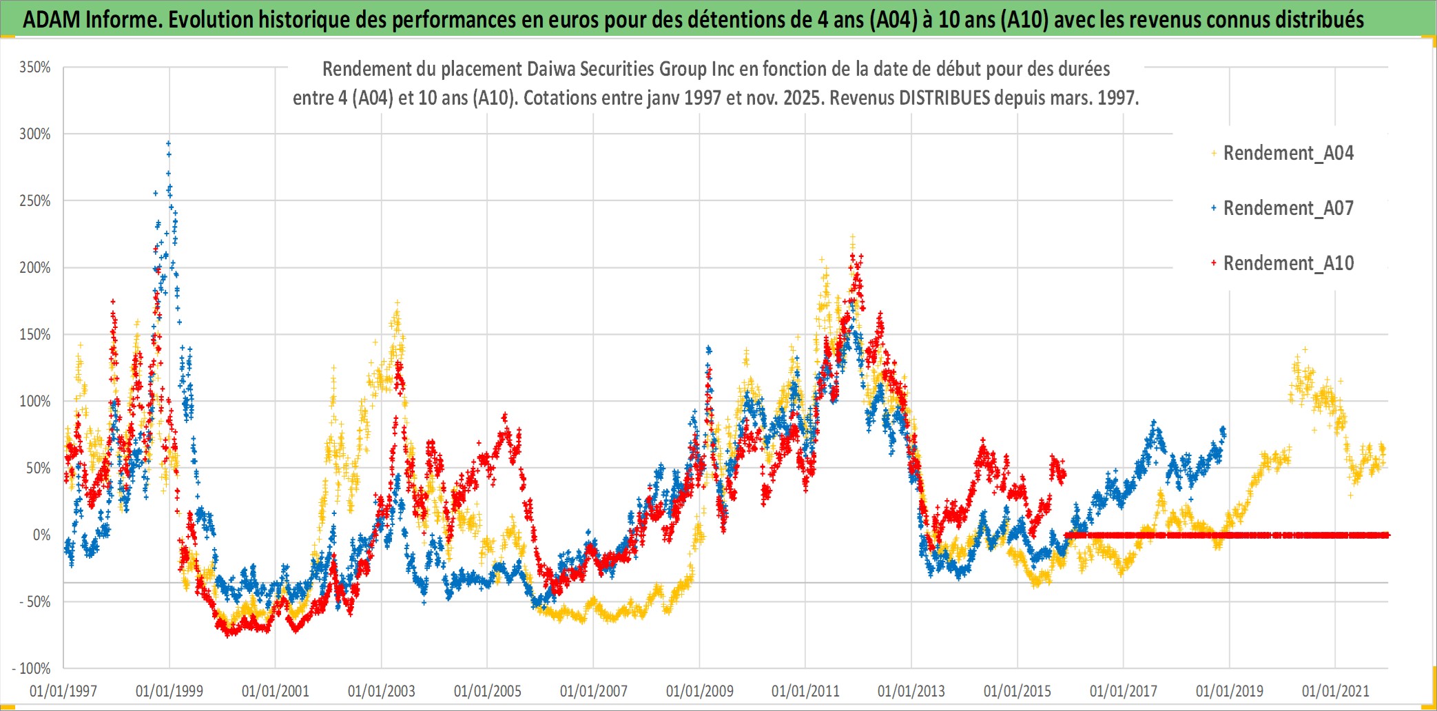 Site dédié aux investisseursPage dédiée sur site financeAnalyse des valorisations hebdomadaires de l'action Daiwa Securities Group Inc. Cet actif est cote en JPY. Les valorisations sont en contrevaleur EURO et couvrent les semaines 1997W01 a 2025W48. Les revenus de cet actif financier sont pris en compte depuis la semaine 1997W13. La note globale ESG de cet actif est estimee a 11.0 (apres rebasage entre 0 et 20).
