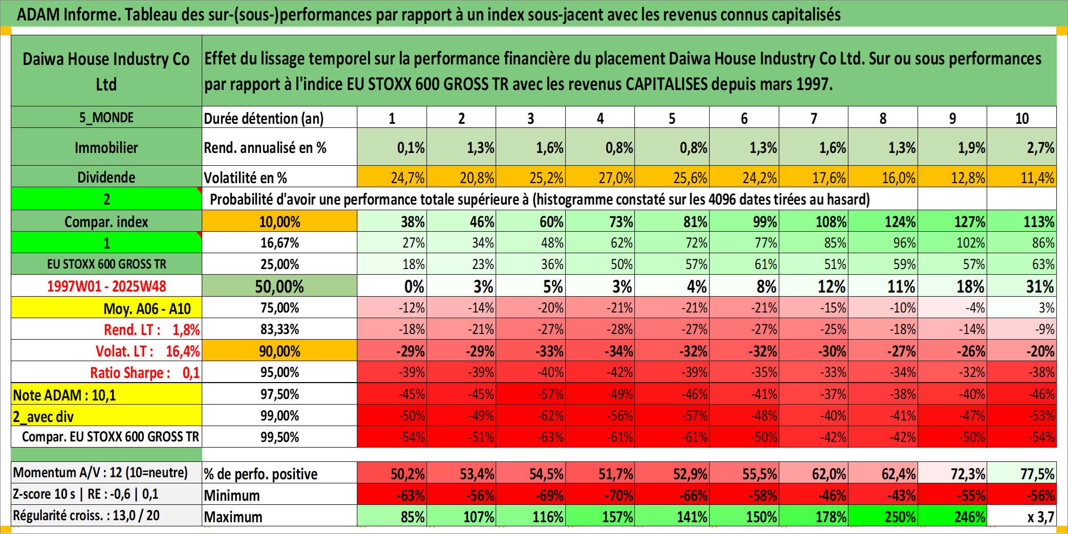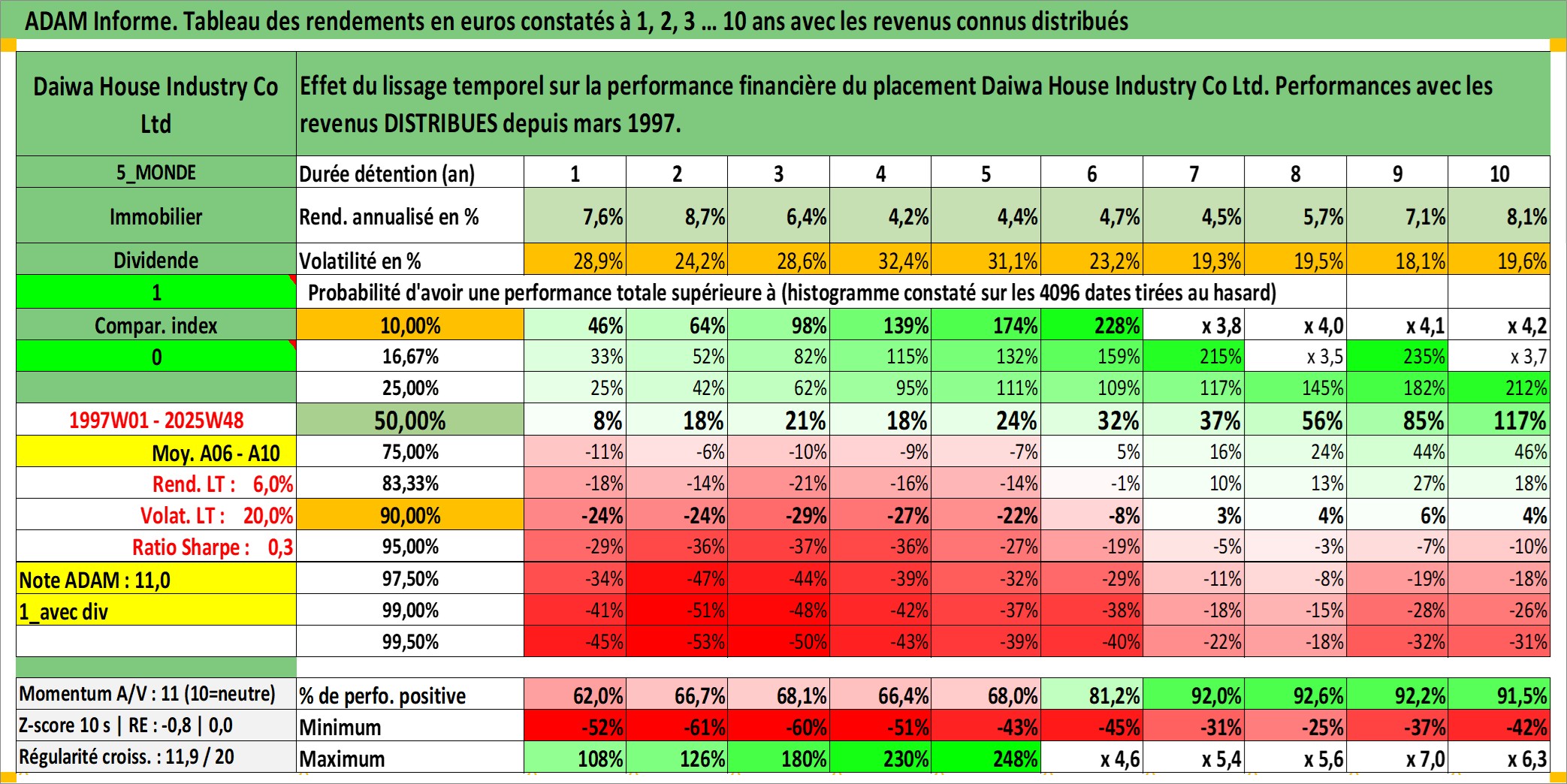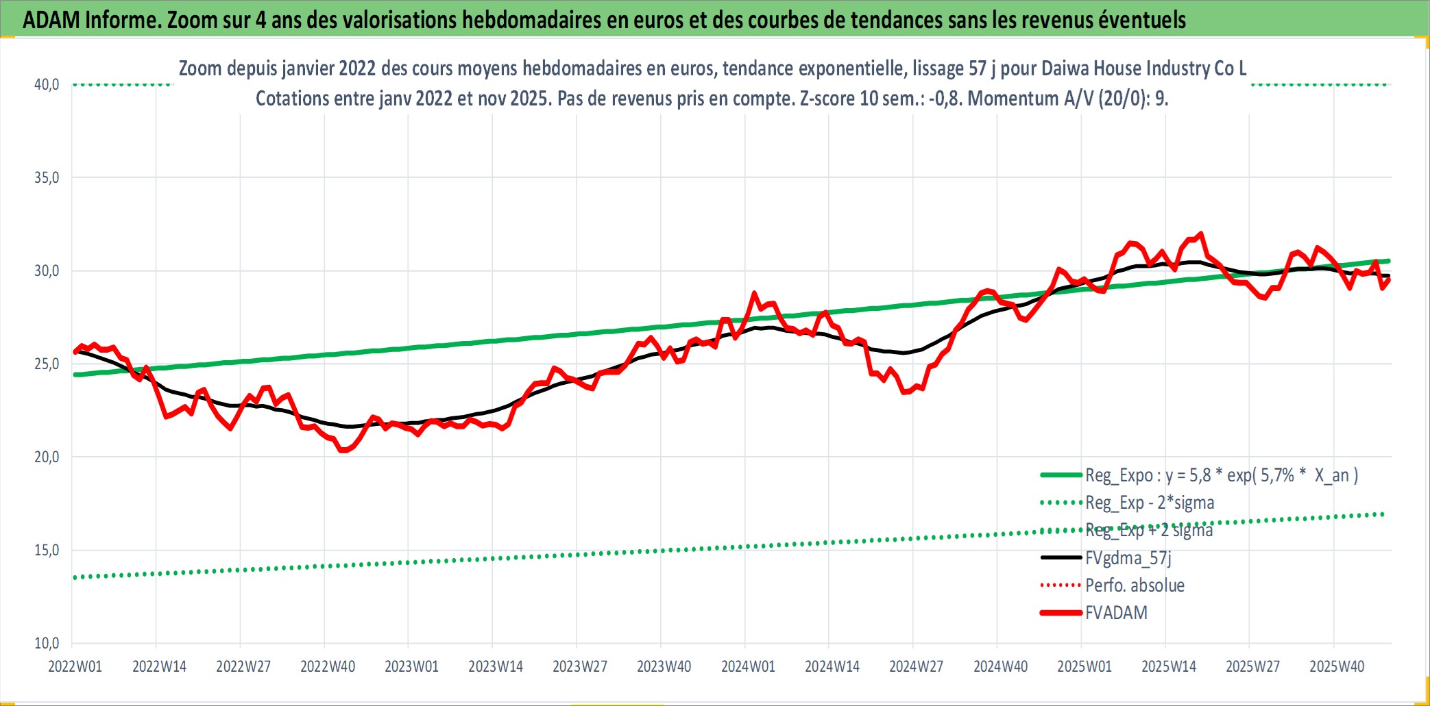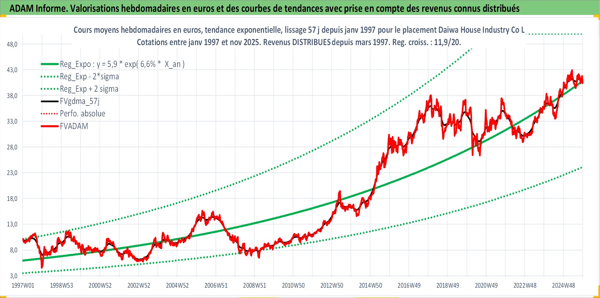 Site dédié aux investisseursPage dédiée sur site financeAnalyse des valorisations hebdomadaires de l'action Daiwa House Industry Co Ltd. Cet actif est cote en JPY. Les valorisations sont en contrevaleur EURO et couvrent les semaines 1997W01 a 2025W48. Les revenus de cet actif financier sont pris en compte depuis la semaine 1997W13. La note globale ESG de cet actif est estimee a 13.0 (apres rebasage entre 0 et 20).