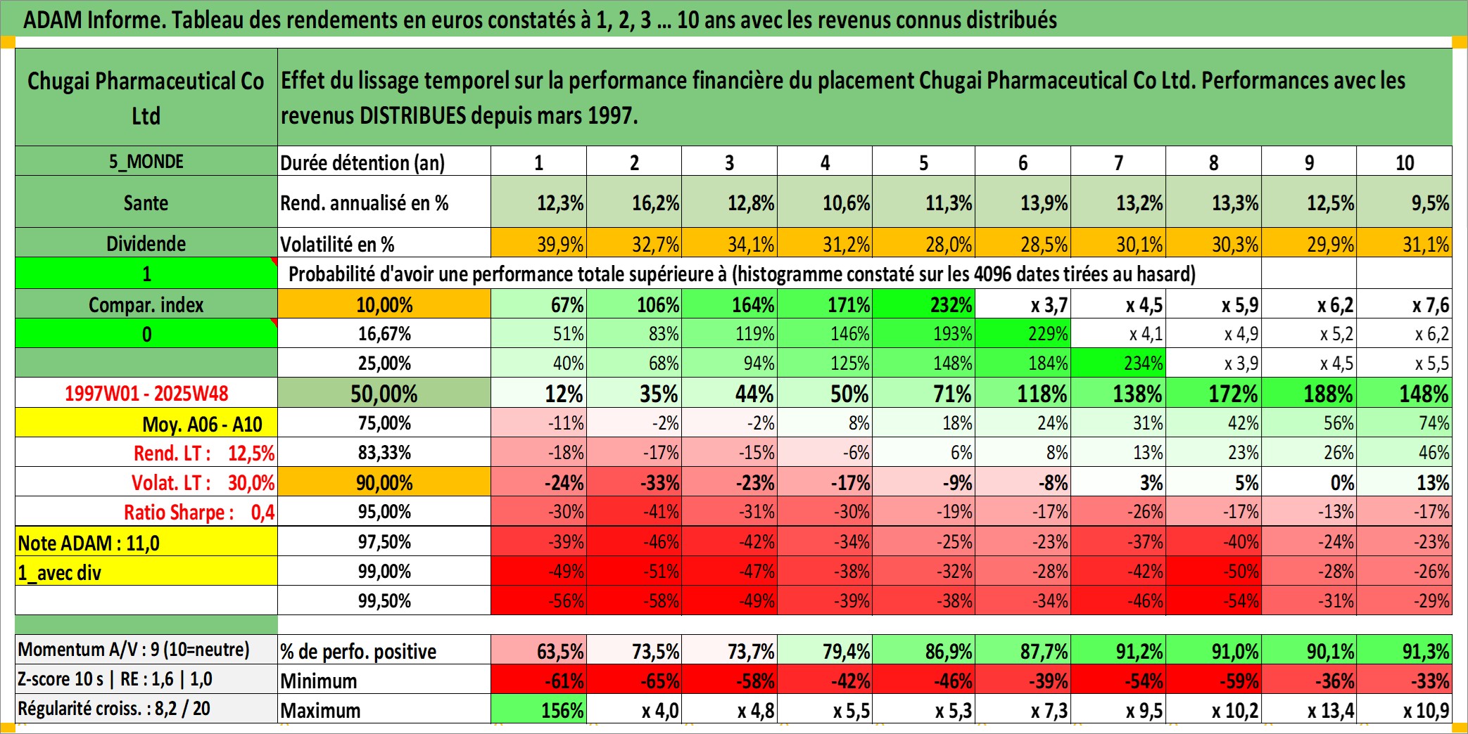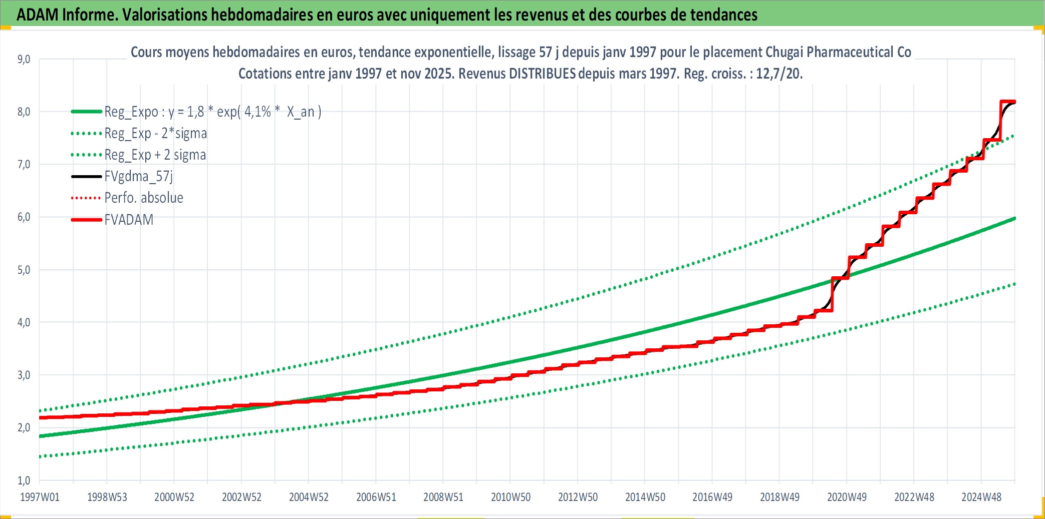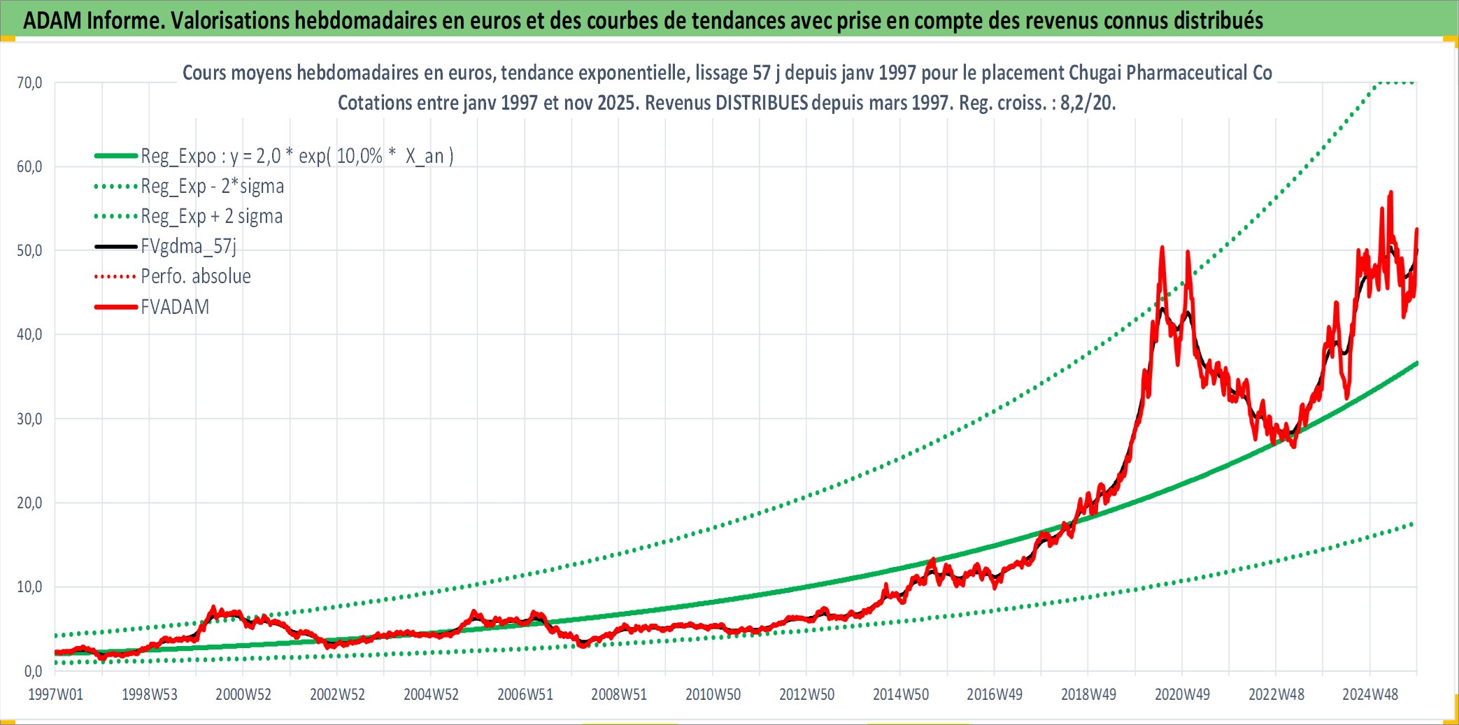 Site dédié aux investisseursPage dédiée sur site financeAnalyse des valorisations hebdomadaires de l'action Chugai Pharmaceutical Co Ltd. Cet actif est cote en JPY. Les valorisations sont en contrevaleur EURO et couvrent les semaines 1997W01 a 2025W48. Les revenus de cet actif financier sont pris en compte depuis la semaine 1997W13. La note globale ESG de cet actif est estimee a 6.0 (apres rebasage entre 0 et 20).