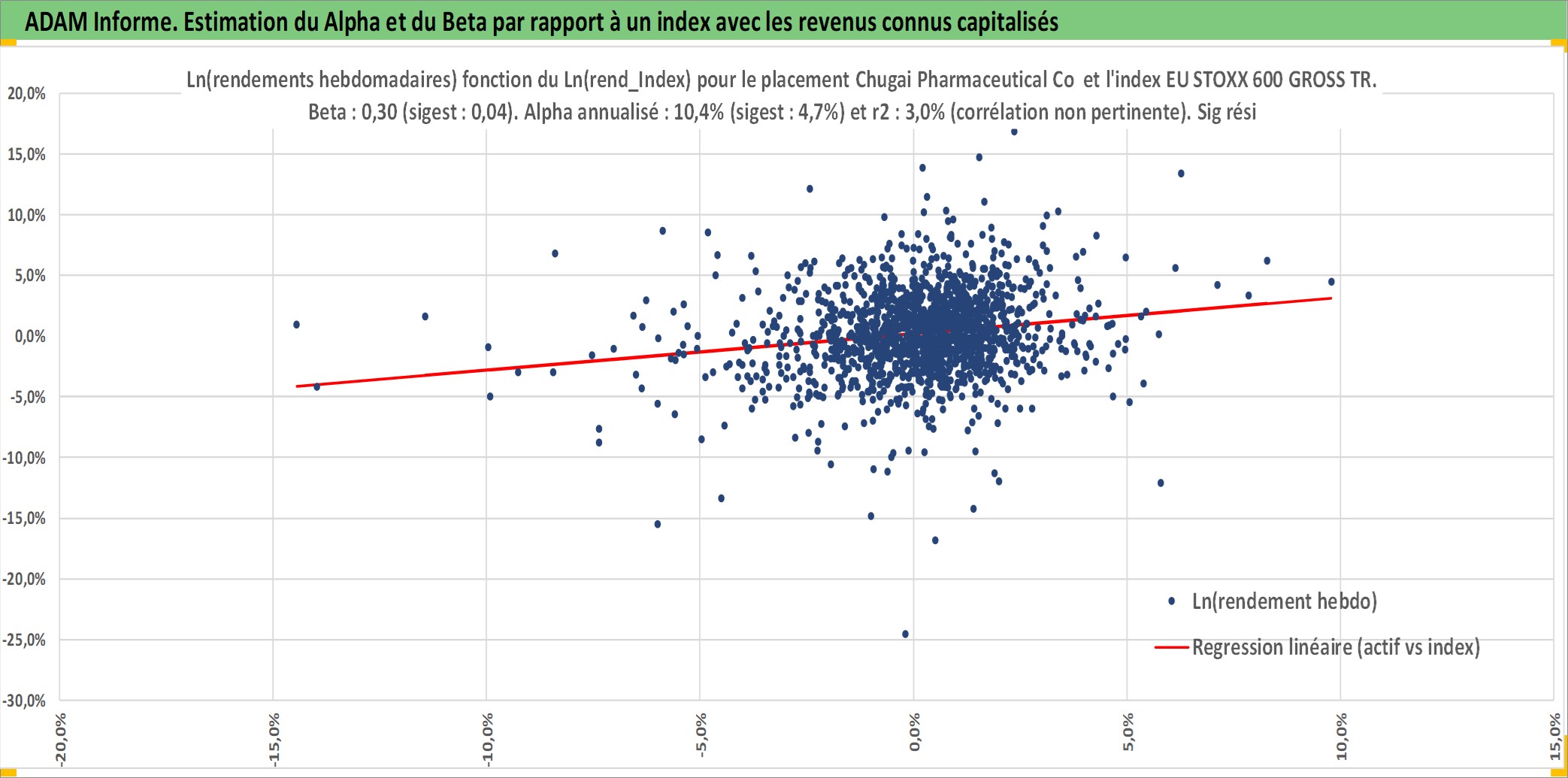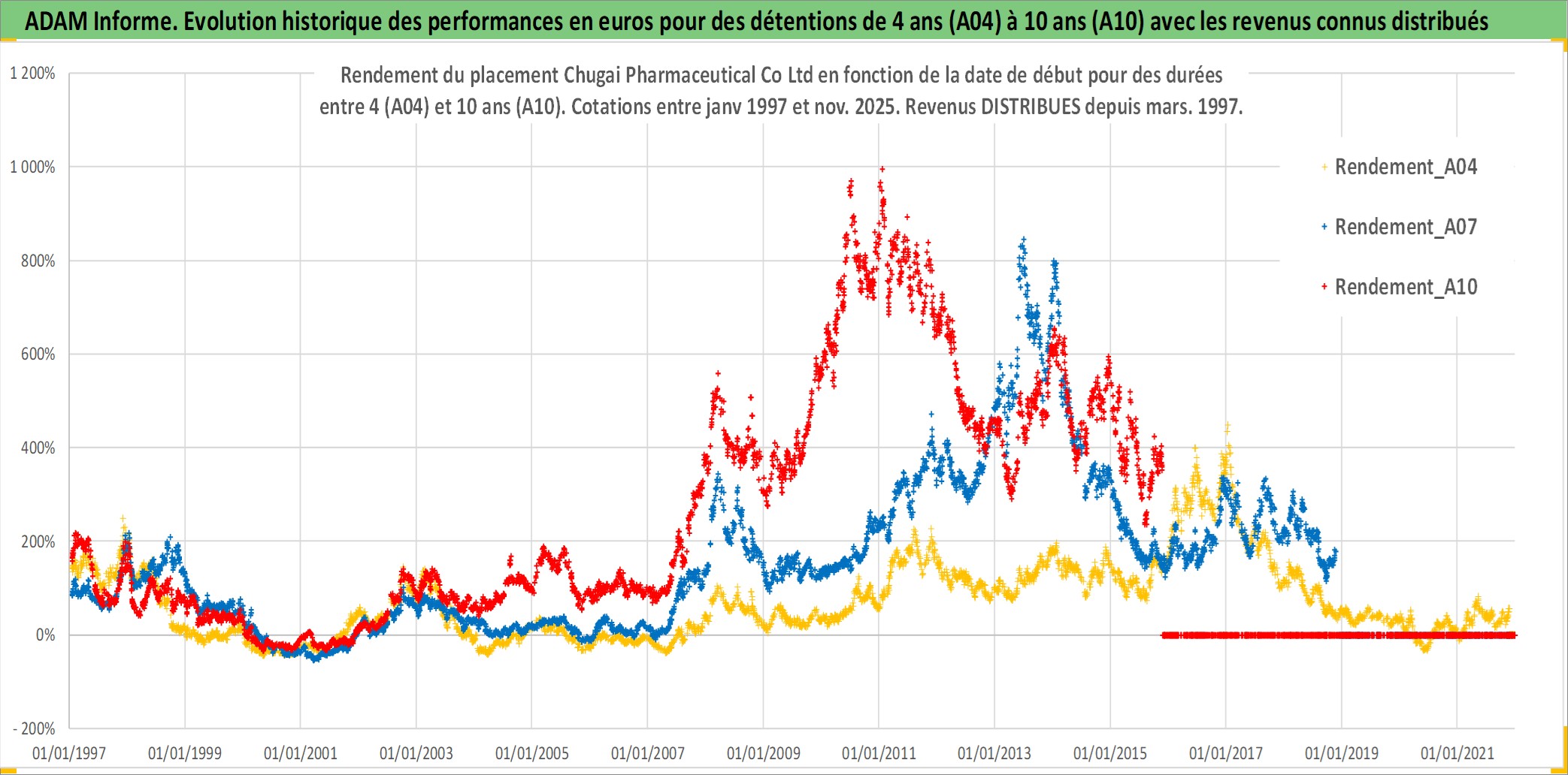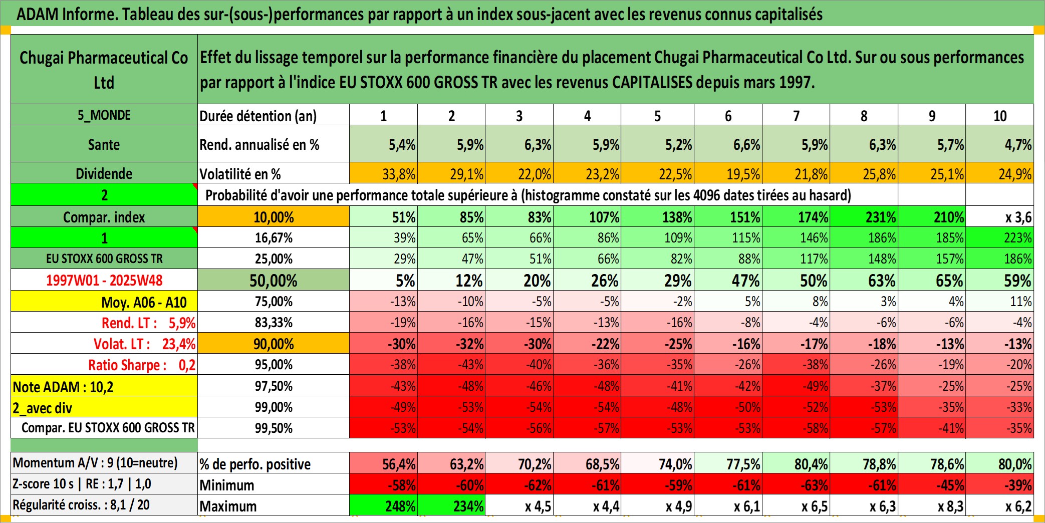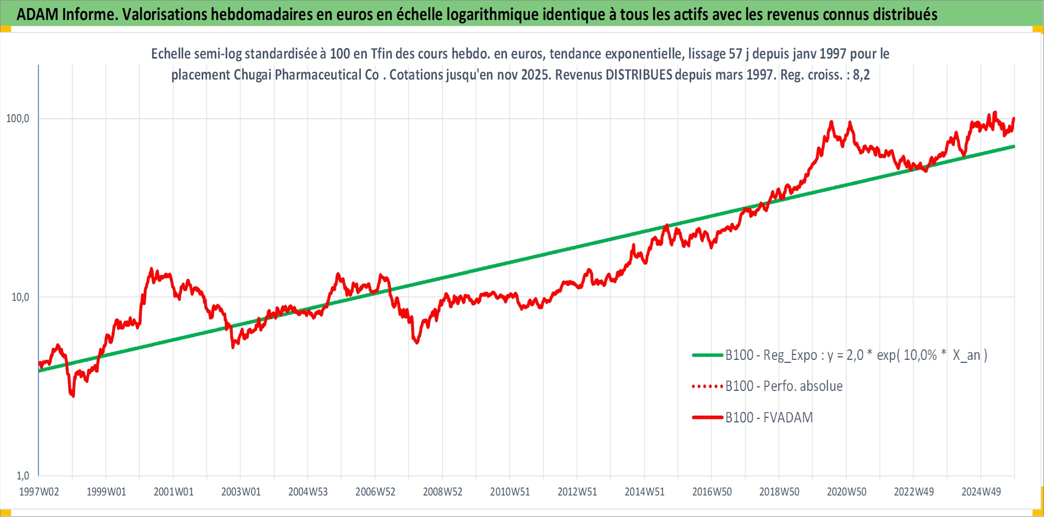 Site dédié aux investisseursPage dédiée sur site financeAnalyse des valorisations hebdomadaires de l'action Chugai Pharmaceutical Co Ltd. Cet actif est cote en JPY. Les valorisations sont en contrevaleur EURO et couvrent les semaines 1997W01 a 2025W48. Les revenus de cet actif financier sont pris en compte depuis la semaine 1997W13. La note globale ESG de cet actif est estimee a 6.0 (apres rebasage entre 0 et 20).