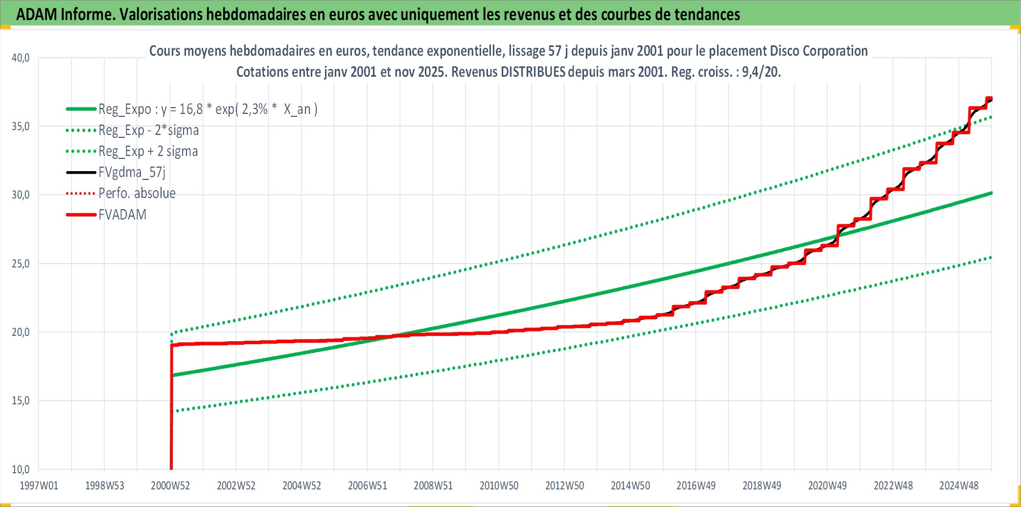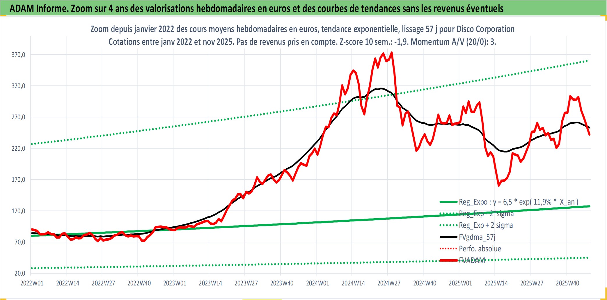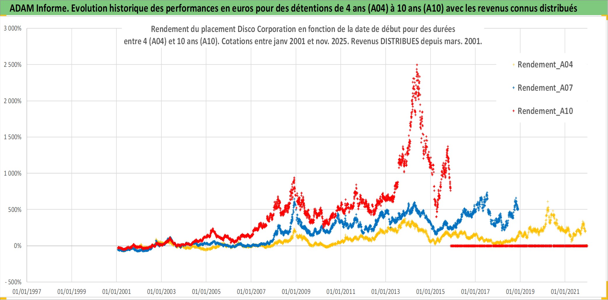 Site dédié aux investisseursPage dédiée sur site financeAnalyse des valorisations hebdomadaires de l'action Disco Corporation. Cet actif est cote en JPY. Les valorisations sont en contrevaleur EURO et couvrent les semaines 2001W02 a 2025W48. Les revenus de cet actif financier sont pris en compte depuis la semaine 2001W13. La note globale ESG de cet actif est estimee a 10.0 (apres rebasage entre 0 et 20).