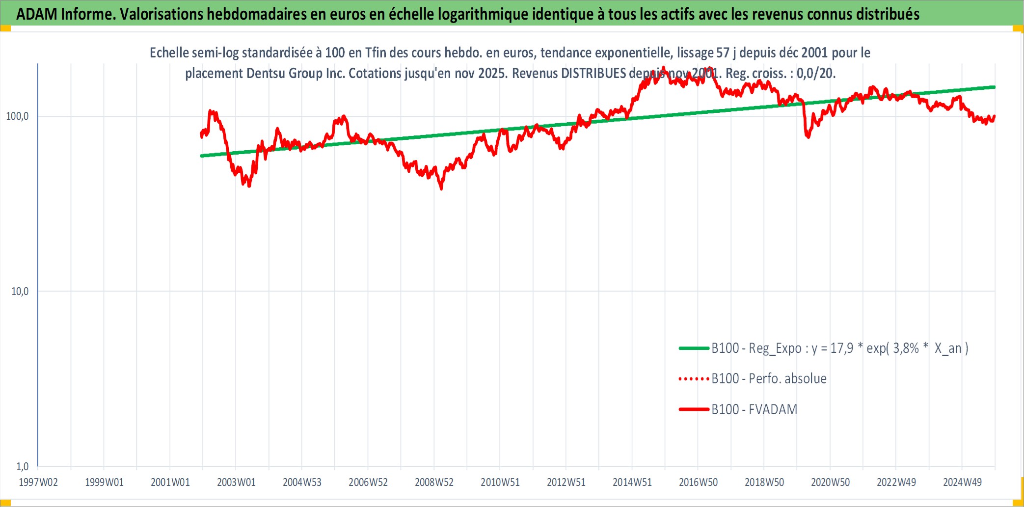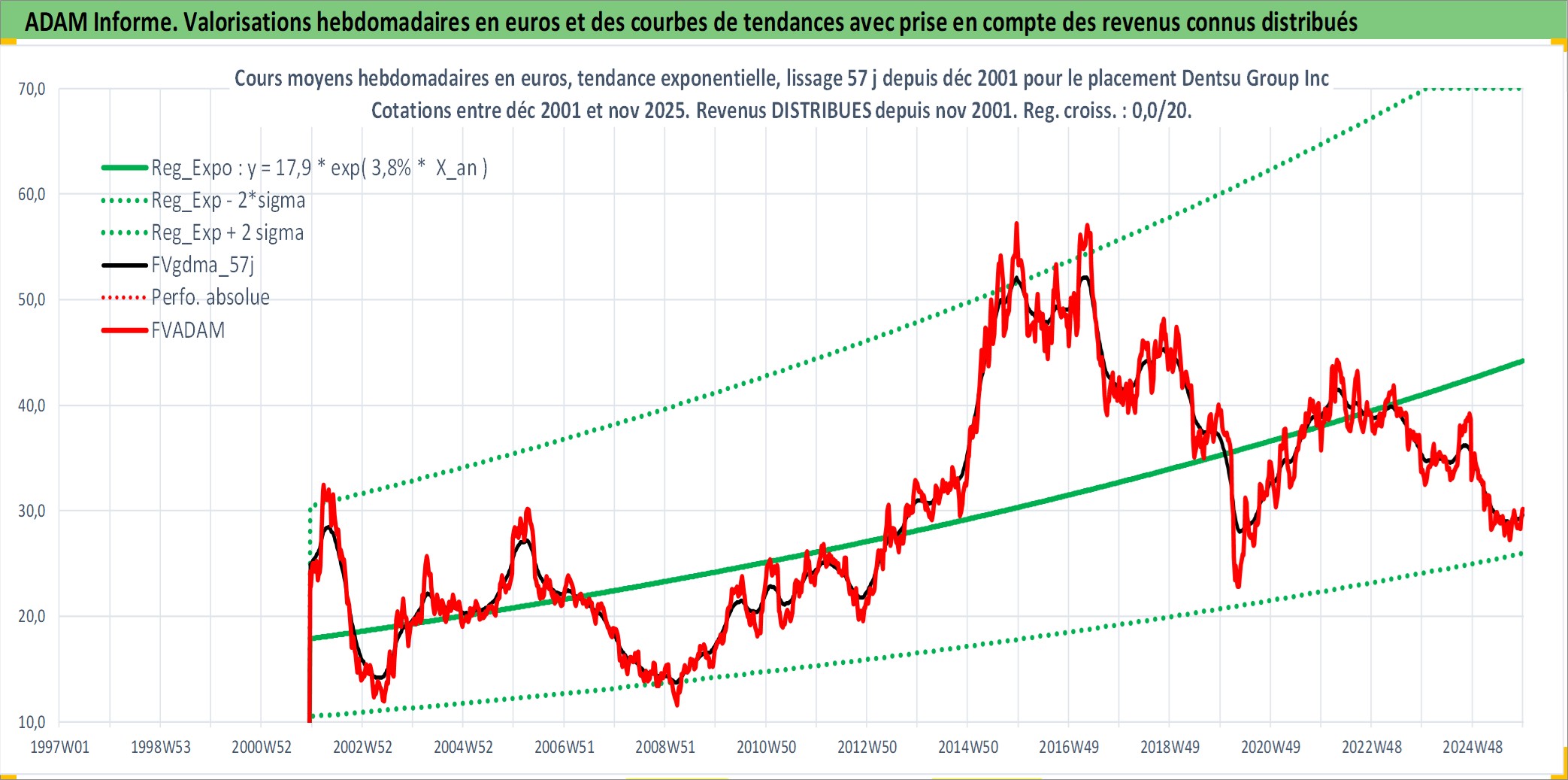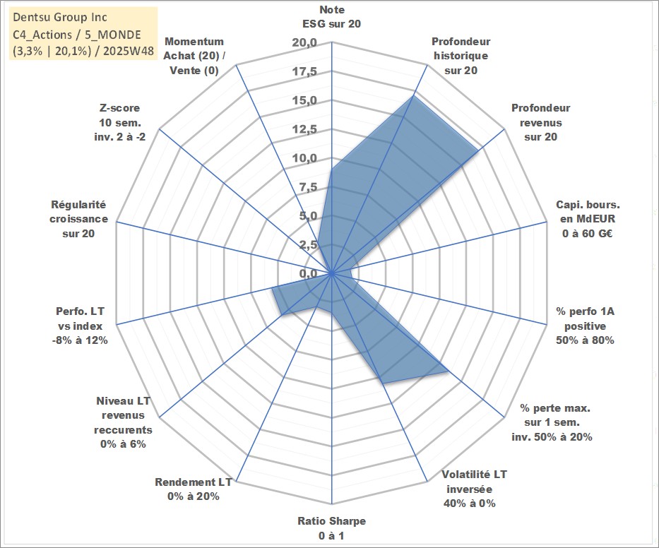 Site dédié aux investisseursPage dédiée sur site financeAnalyse des valorisations hebdomadaires de l'action Dentsu Group Inc. Cet actif est cote en JPY. Les valorisations sont en contrevaleur EURO et couvrent les semaines 2001W50 a 2025W48. Les revenus de cet actif financier sont pris en compte depuis la semaine 2001W48. La note globale ESG de cet actif est estimee a 9.0 (apres rebasage entre 0 et 20).