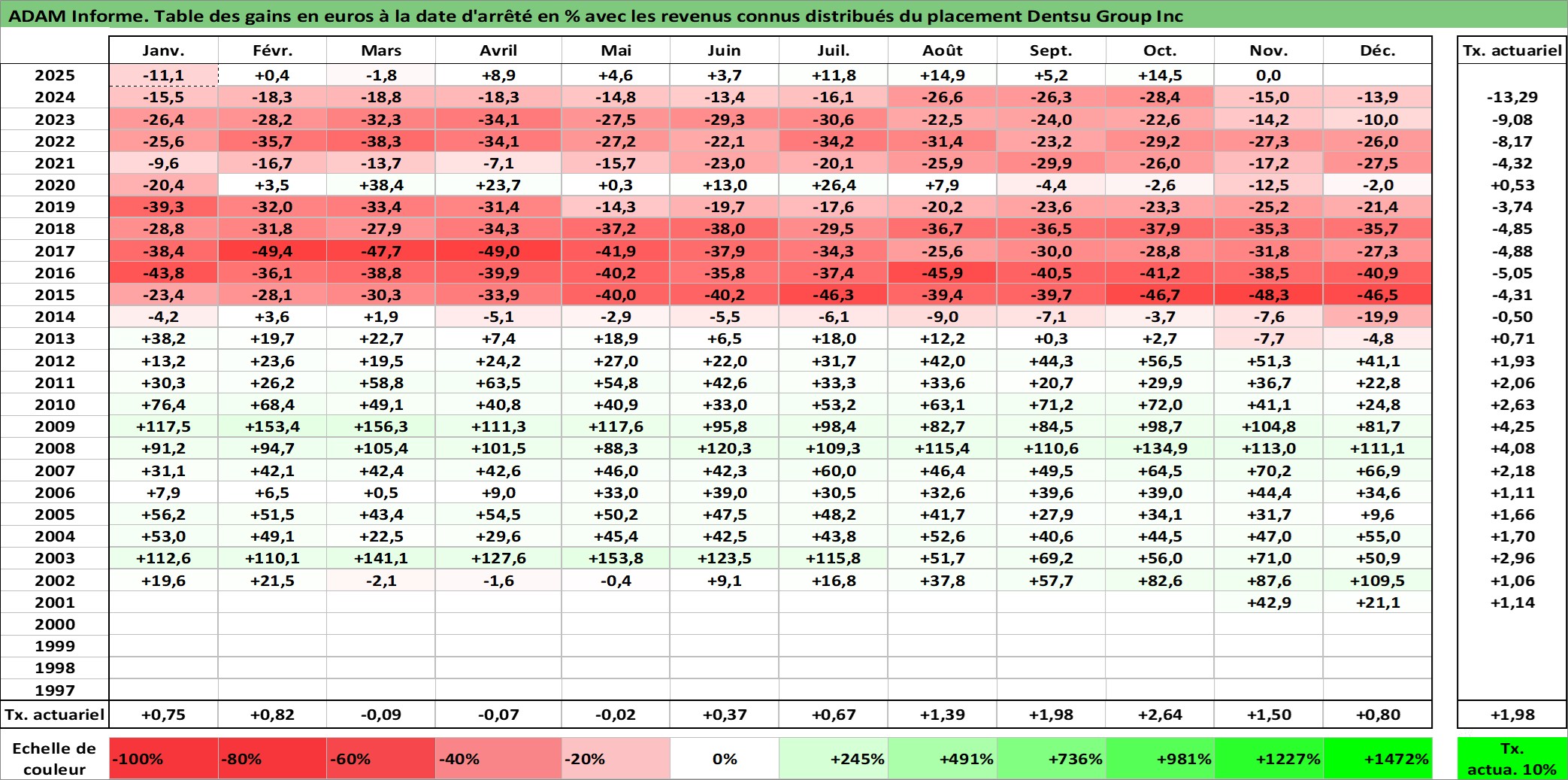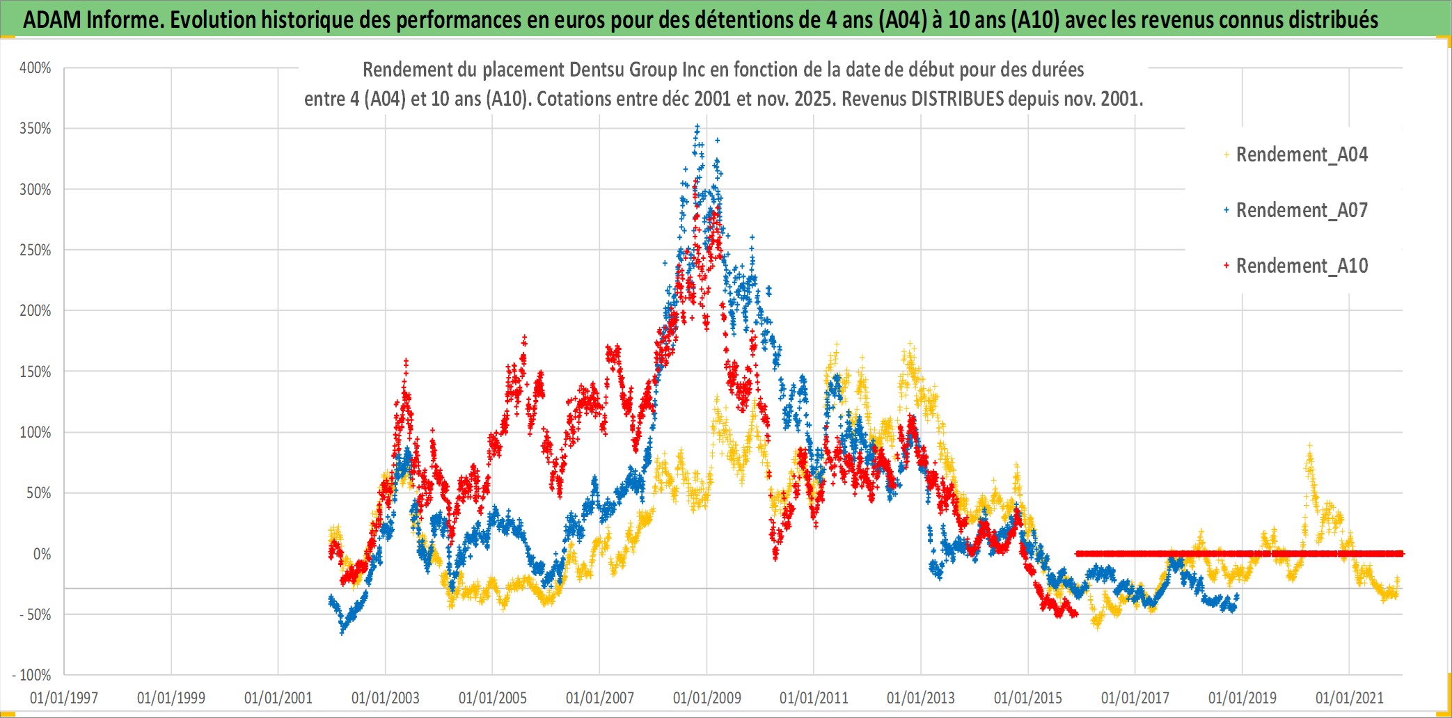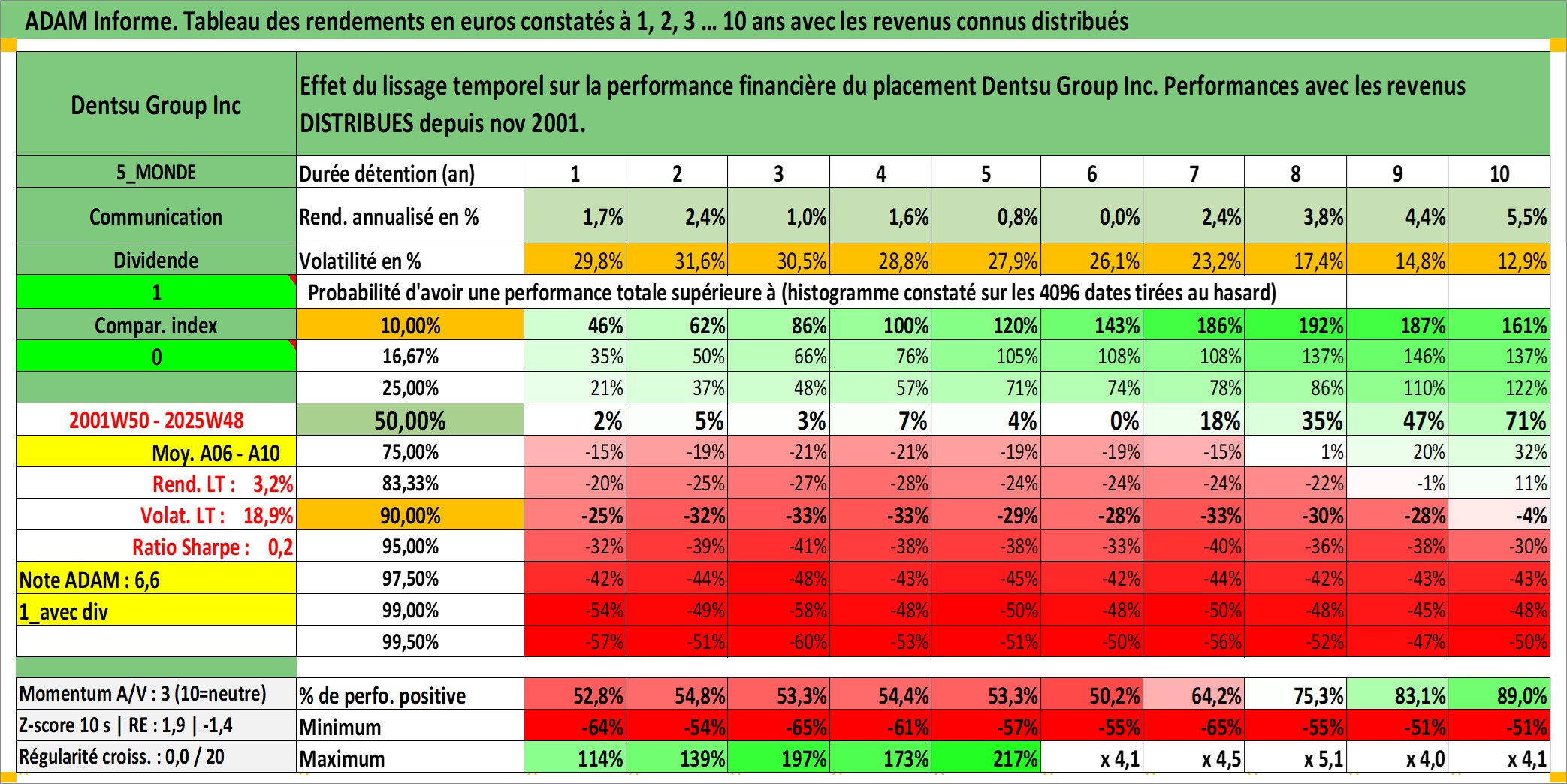 Site dédié aux investisseursPage dédiée sur site financeAnalyse des valorisations hebdomadaires de l'action Dentsu Group Inc. Cet actif est cote en JPY. Les valorisations sont en contrevaleur EURO et couvrent les semaines 2001W50 a 2025W48. Les revenus de cet actif financier sont pris en compte depuis la semaine 2001W48. La note globale ESG de cet actif est estimee a 9.0 (apres rebasage entre 0 et 20).