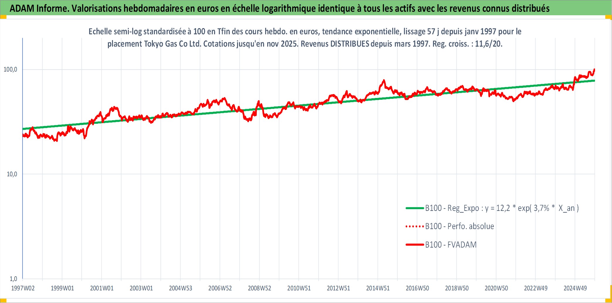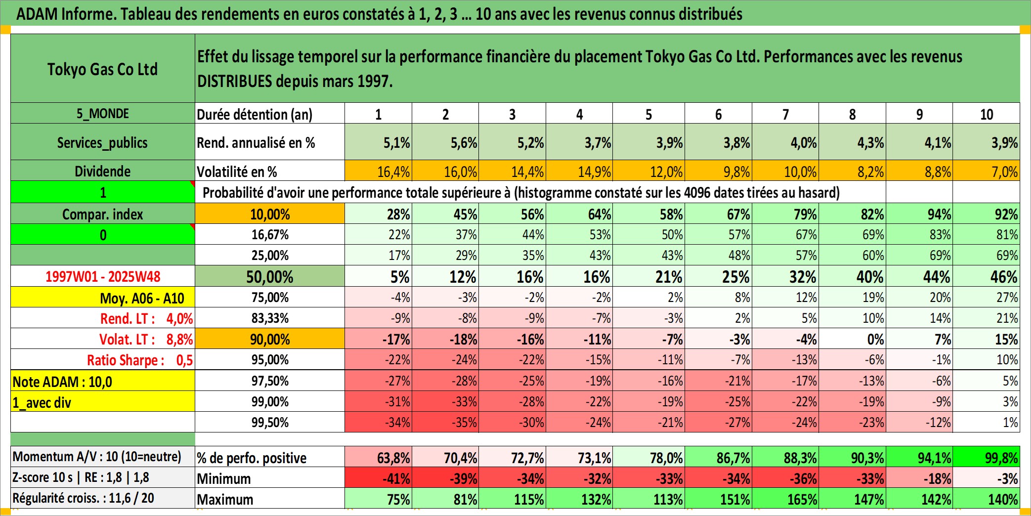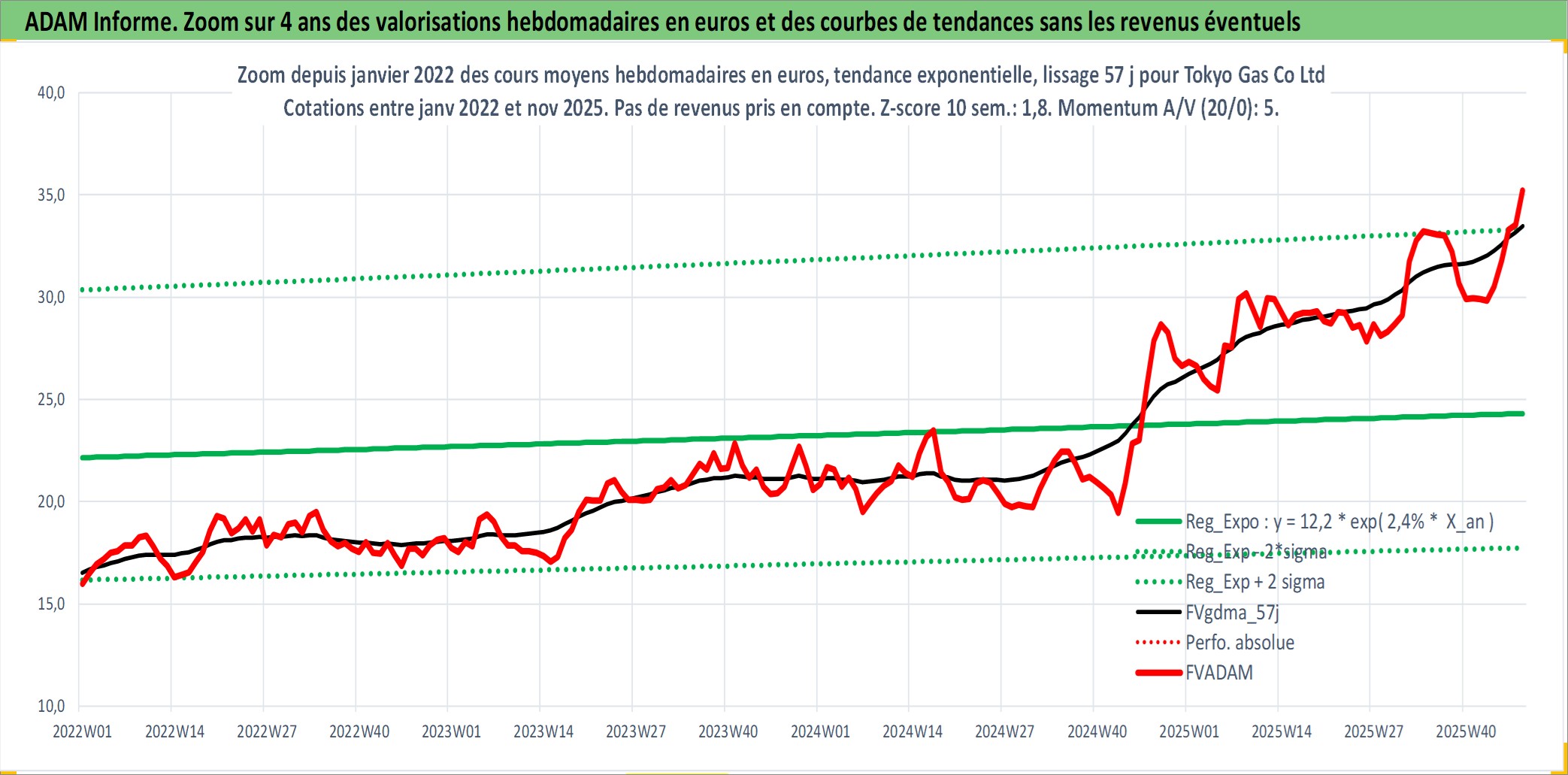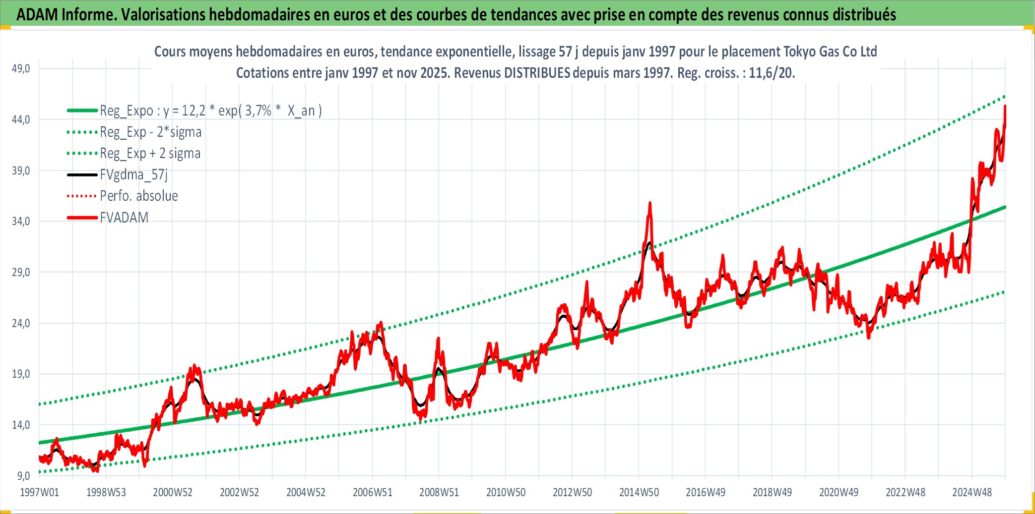 Site dédié aux investisseursPage dédiée sur site financeAnalyse des valorisations hebdomadaires de l'action Tokyo Gas Co Ltd. Cet actif est cote en JPY. Les valorisations sont en contrevaleur EURO et couvrent les semaines 1997W01 a 2025W48. Les revenus de cet actif financier sont pris en compte depuis la semaine 1997W13. La note globale ESG de cet actif est estimee a 4.0 (apres rebasage entre 0 et 20).