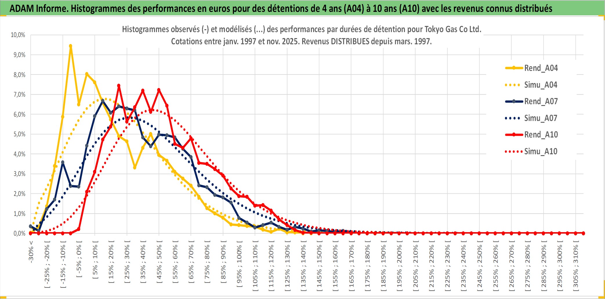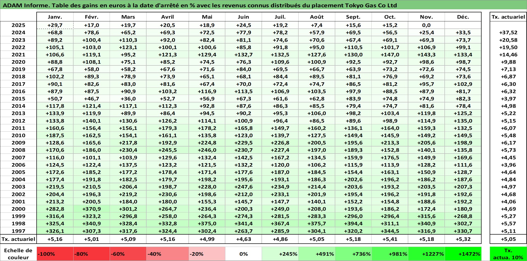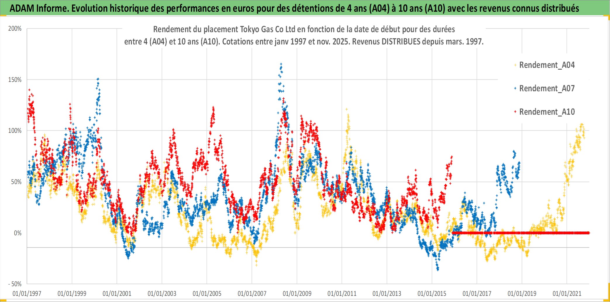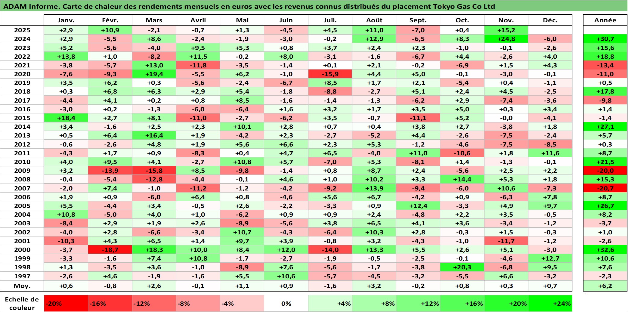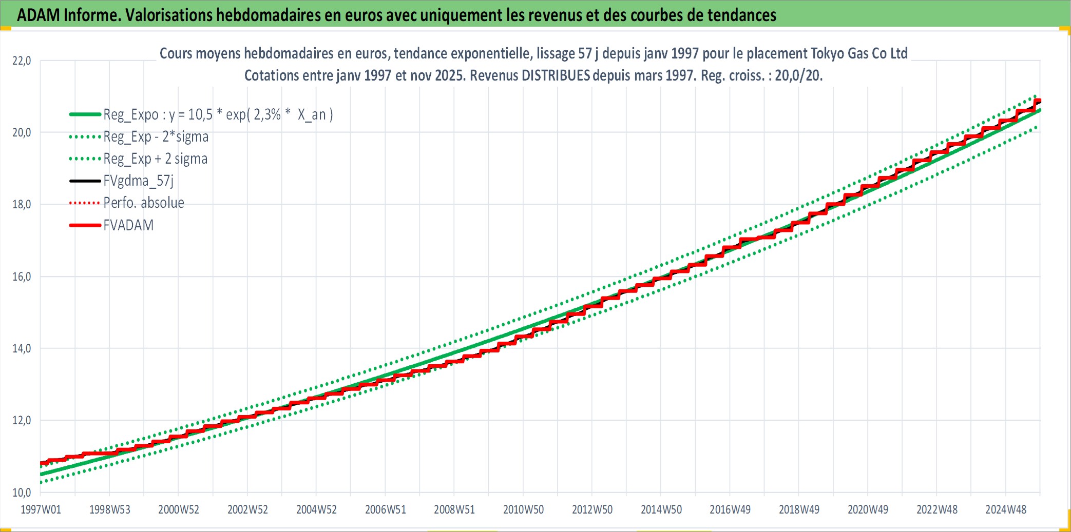 Site dédié aux investisseursPage dédiée sur site financeAnalyse des valorisations hebdomadaires de l'action Tokyo Gas Co Ltd. Cet actif est cote en JPY. Les valorisations sont en contrevaleur EURO et couvrent les semaines 1997W01 a 2025W48. Les revenus de cet actif financier sont pris en compte depuis la semaine 1997W13. La note globale ESG de cet actif est estimee a 4.0 (apres rebasage entre 0 et 20).