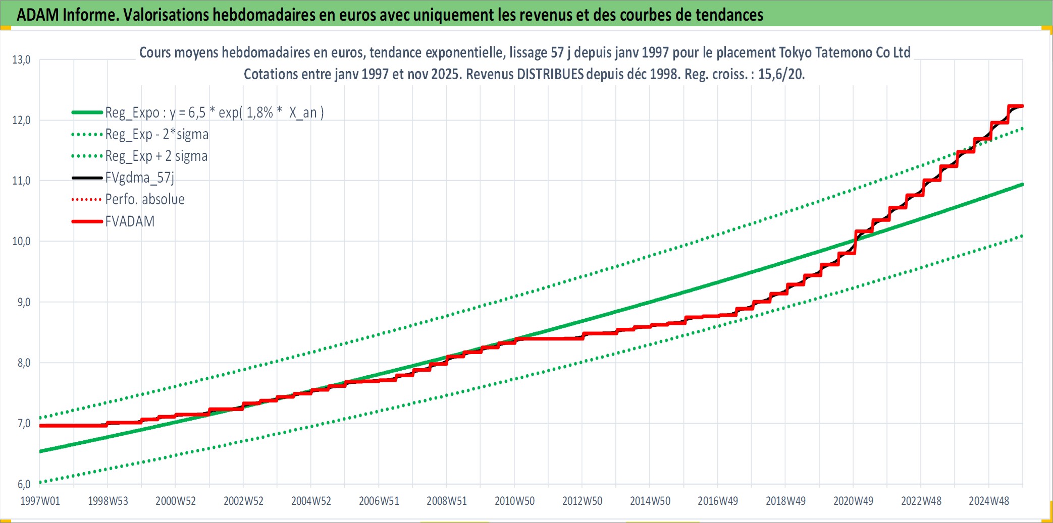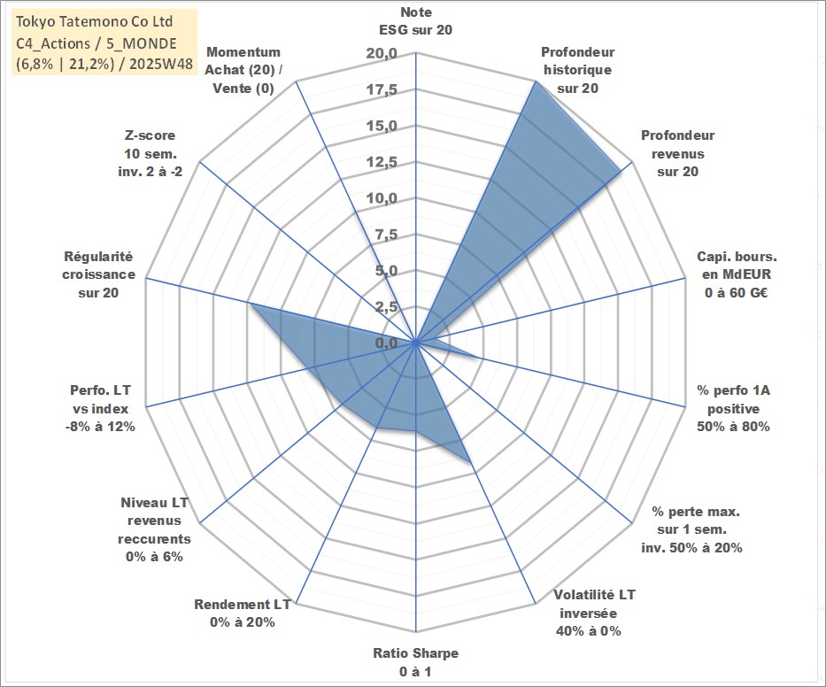 Site dédié aux investisseursPage dédiée sur site financeAnalyse des valorisations hebdomadaires de l'action Tokyo Tatemono Co Ltd. Cet actif est cote en JPY. Les valorisations sont en contrevaleur EURO et couvrent les semaines 1997W01 a 2025W48. Les revenus de cet actif financier sont pris en compte depuis la semaine 1998W52. La note ESG de cet actif n'est pas connue.