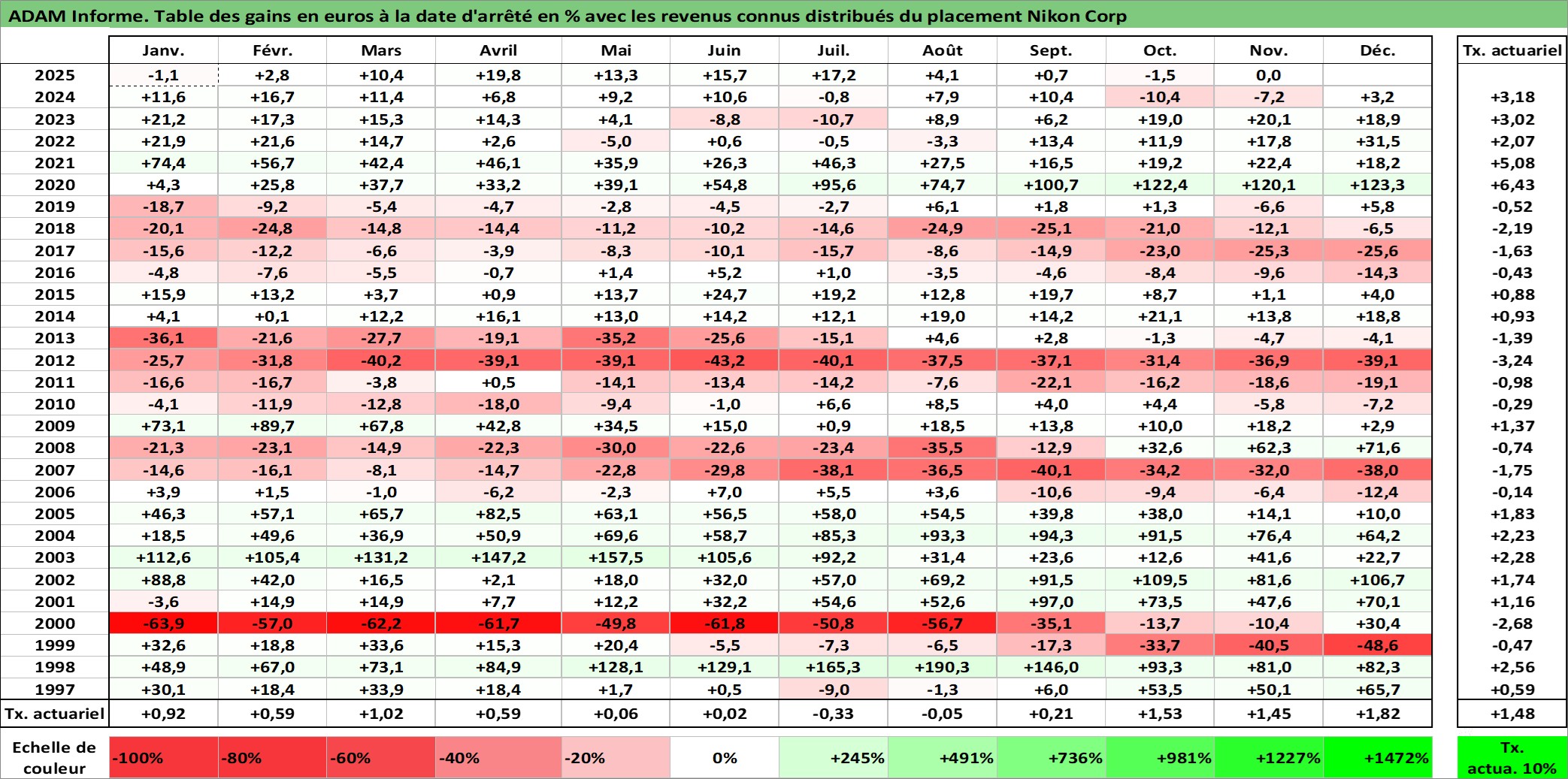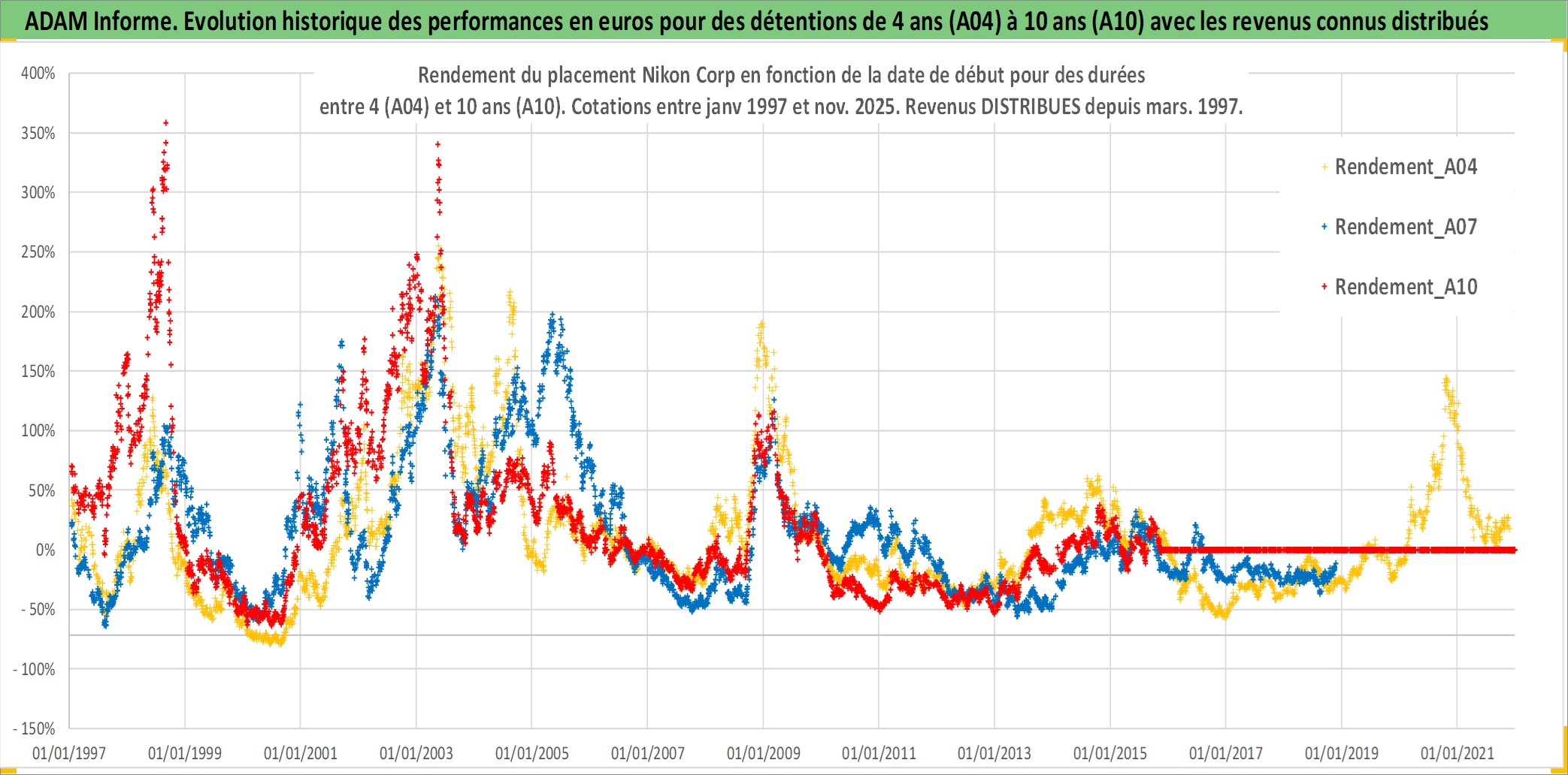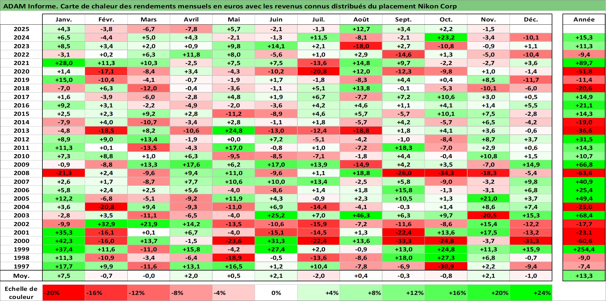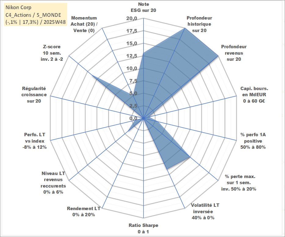Site dédié aux investisseursPage dédiée sur site financeAnalyse des valorisations hebdomadaires de l'action Nikon Corp. Cet actif est cote en JPY. Les valorisations sont en contrevaleur EURO et couvrent les semaines 1997W01 a 2025W48. Les revenus de cet actif financier sont pris en compte depuis la semaine 1997W13. La note globale ESG de cet actif est estimee a 13.0 (apres rebasage entre 0 et 20).