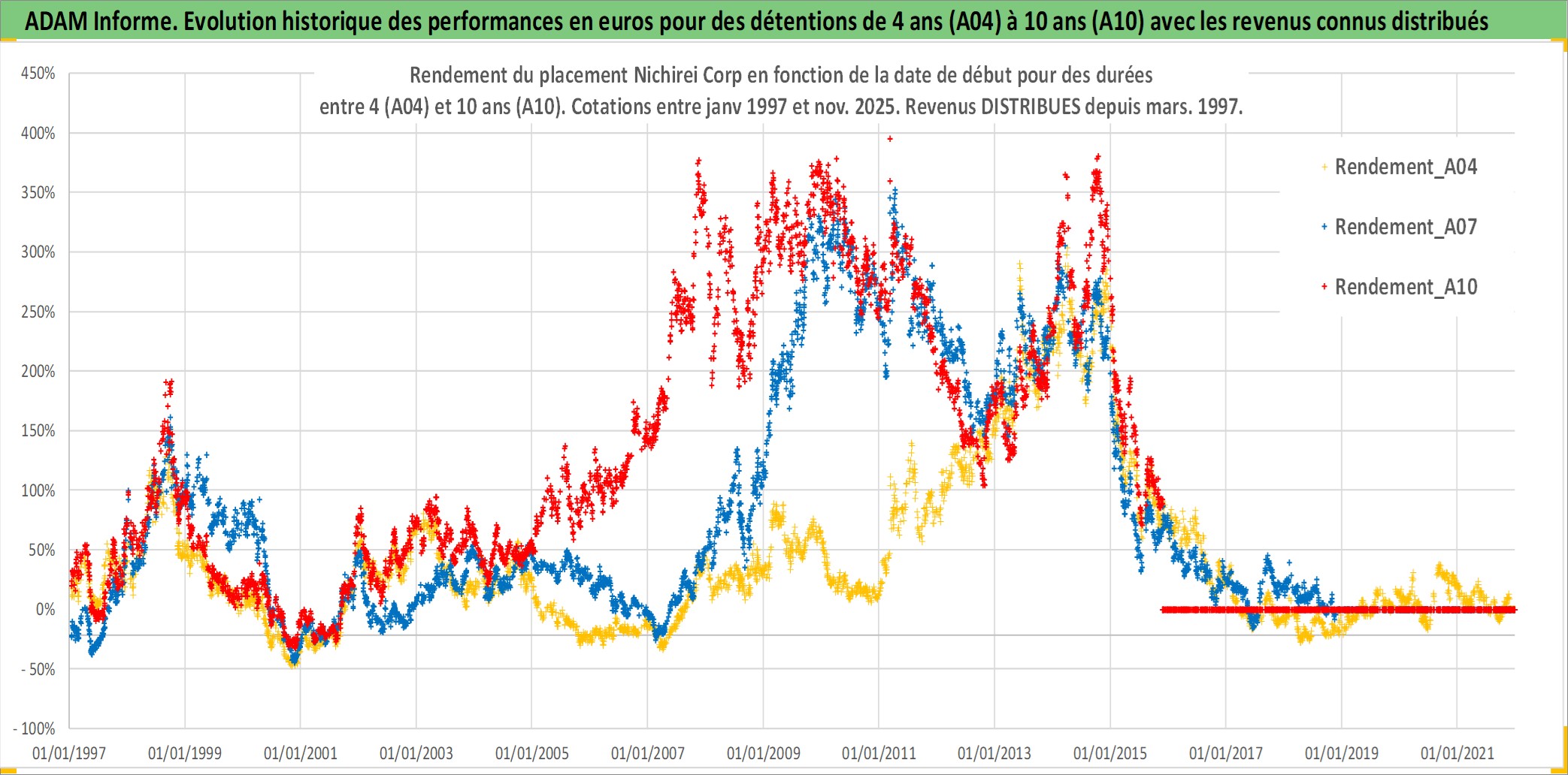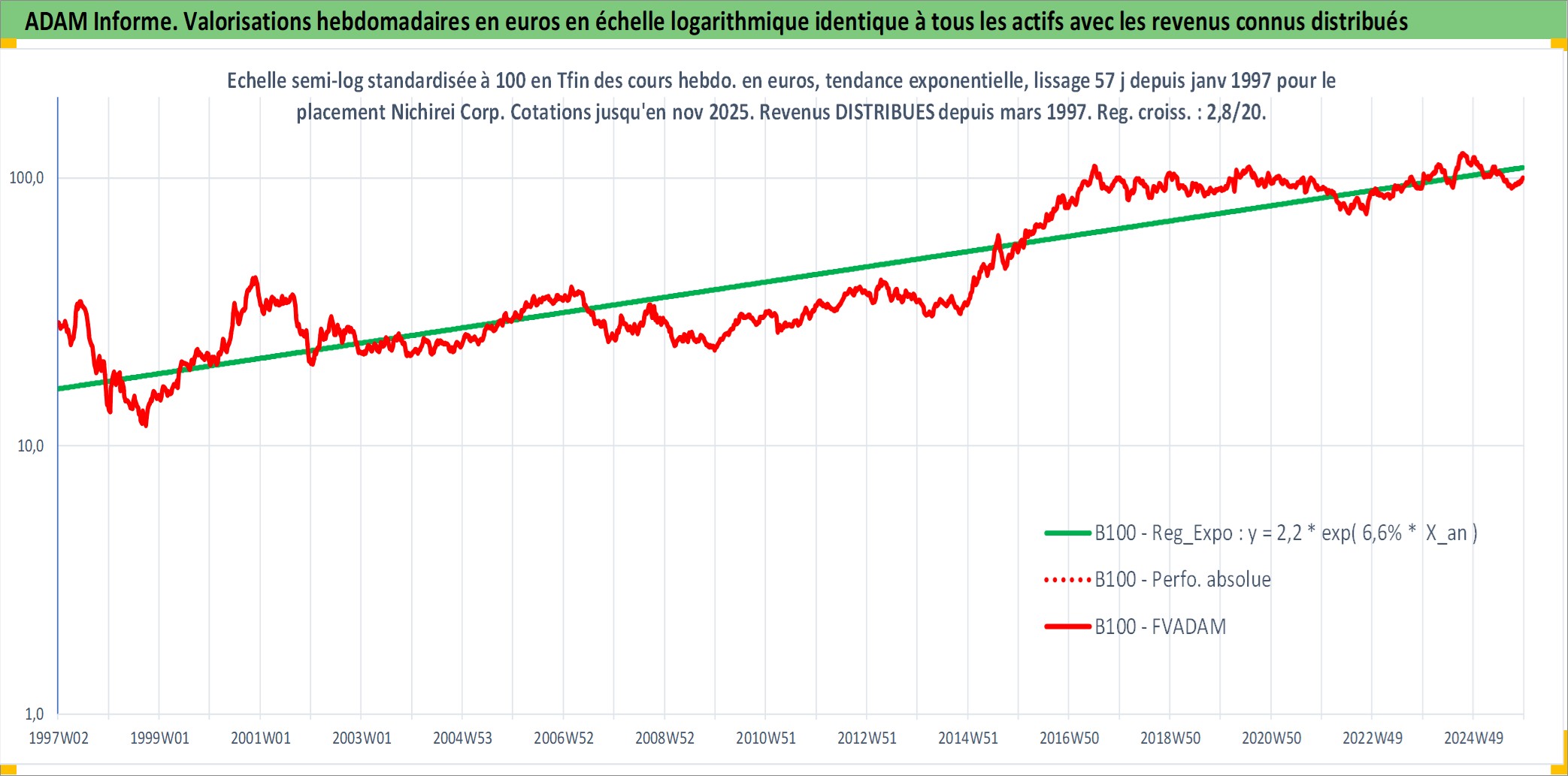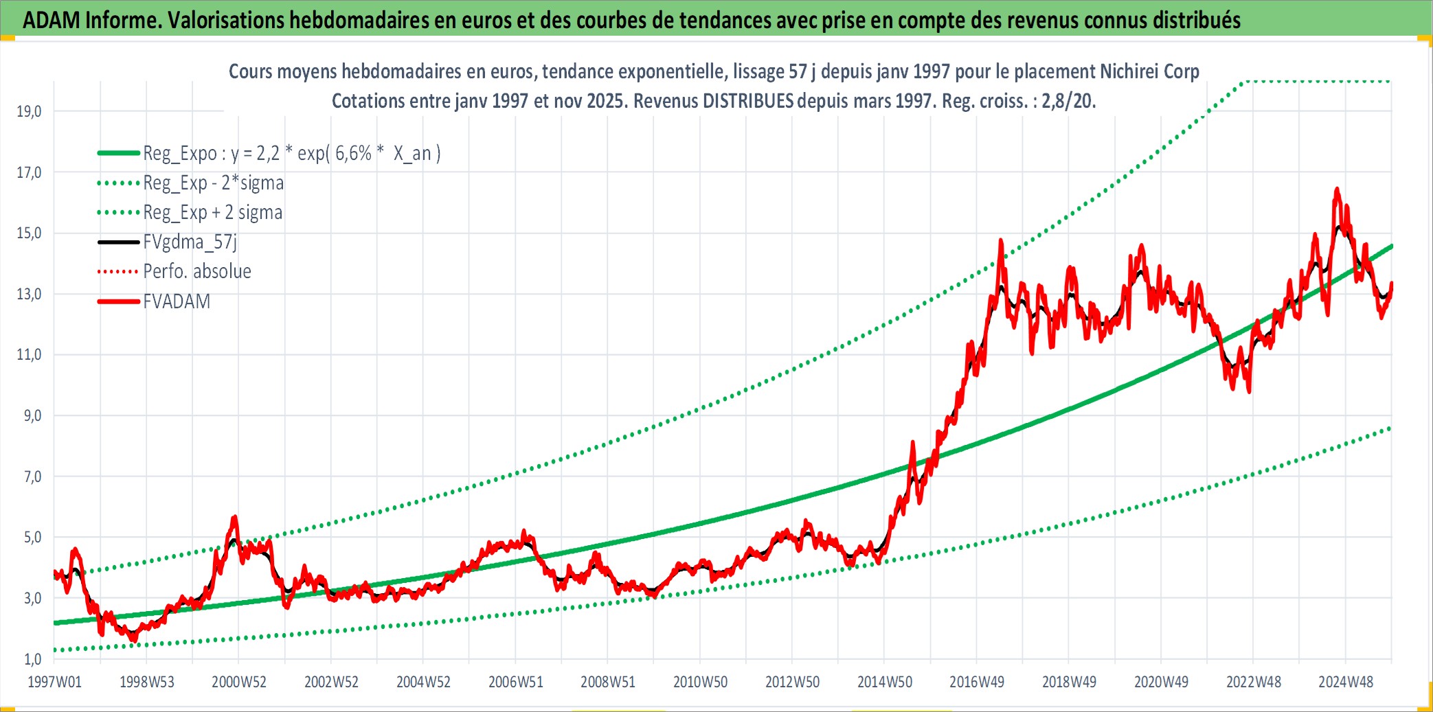 Site dédié aux investisseursPage dédiée sur site financeAnalyse des valorisations hebdomadaires de l'action Nichirei Corp. Cet actif est cote en JPY. Les valorisations sont en contrevaleur EURO et couvrent les semaines 1997W01 a 2025W48. Les revenus de cet actif financier sont pris en compte depuis la semaine 1997W13. La note ESG de cet actif n'est pas connue.