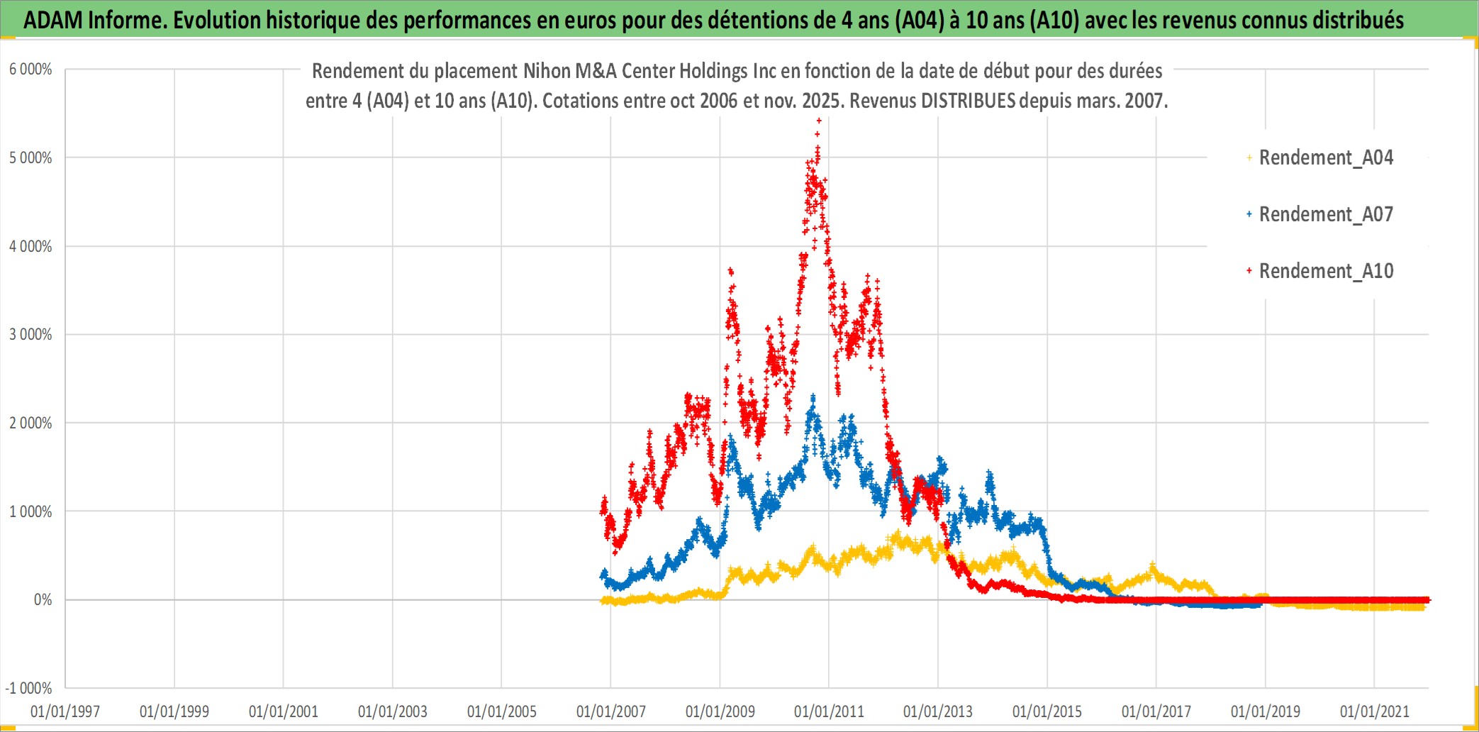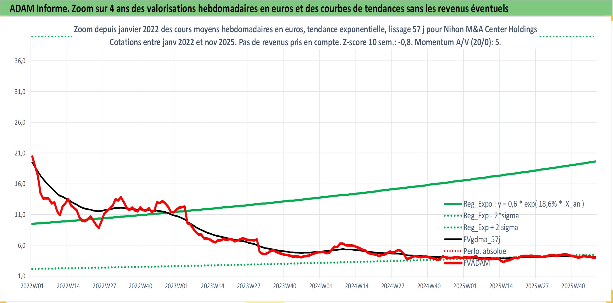 Site dédié aux investisseursPage dédiée sur site financeAnalyse des valorisations hebdomadaires de l'action Nihon M&A Center Holdings Inc. Cet actif est cote en JPY. Les valorisations sont en contrevaleur EURO et couvrent les semaines 2006W42 a 2025W48. Les revenus de cet actif financier sont pris en compte depuis la semaine 2007W13. La note ESG de cet actif n'est pas connue.
