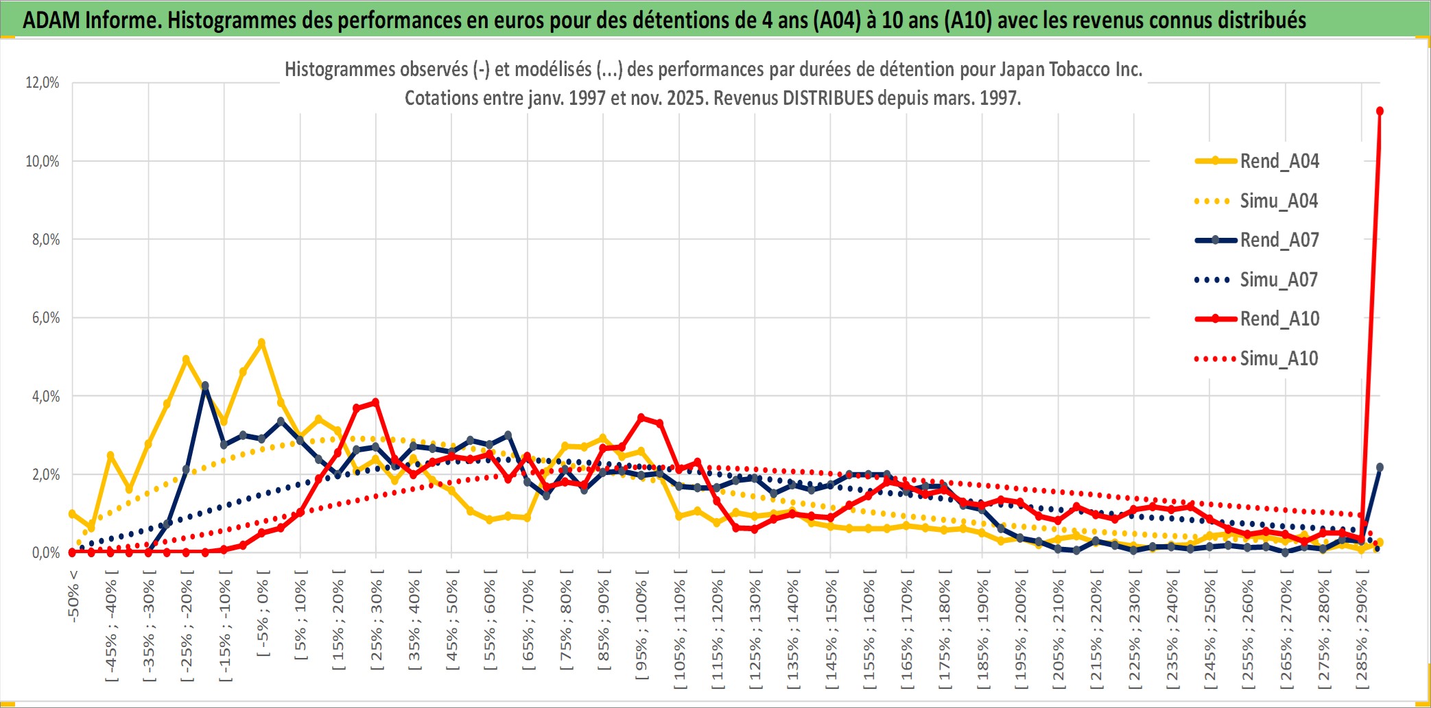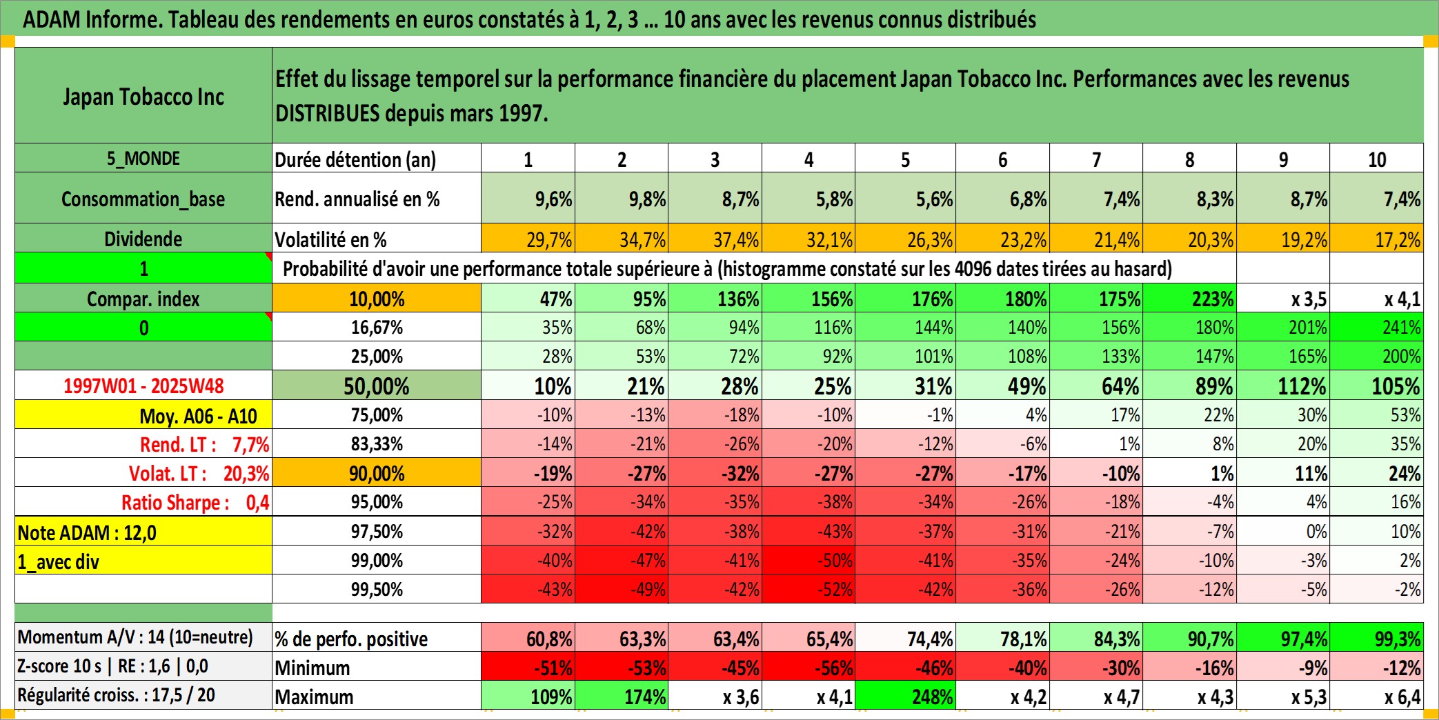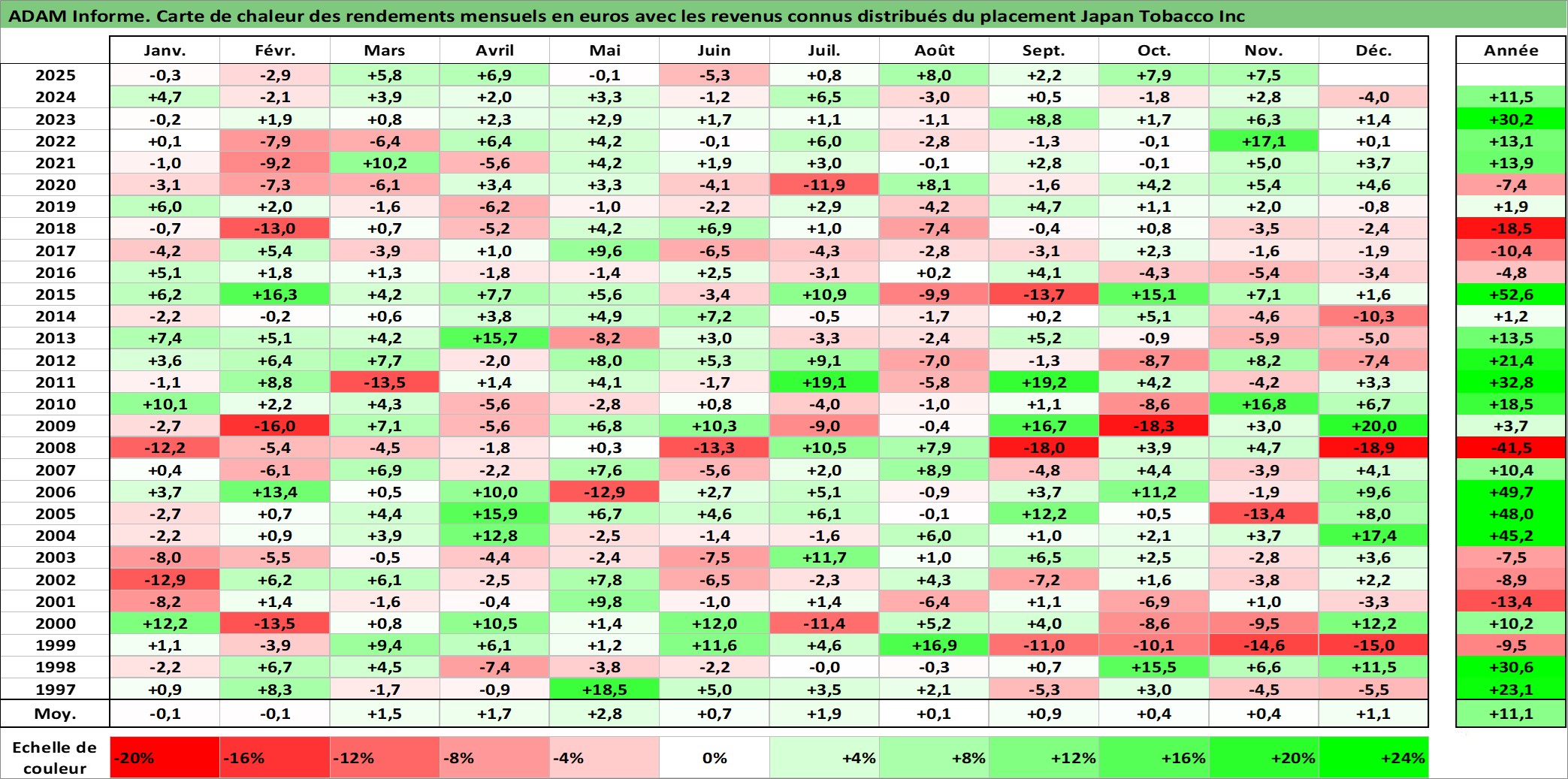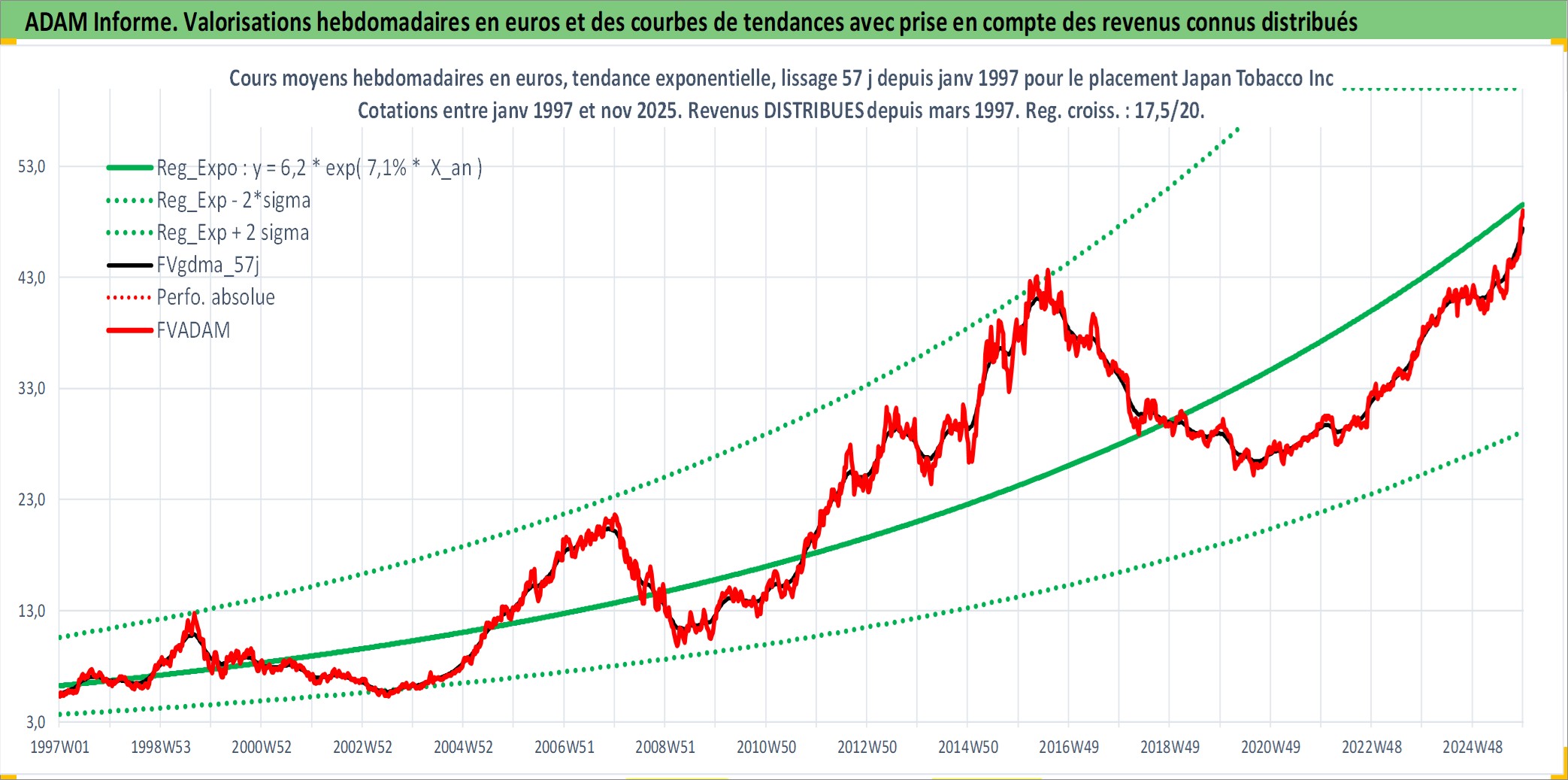 Site dédié aux investisseursPage dédiée sur site financeAnalyse des valorisations hebdomadaires de l'action Japan Tobacco Inc. Cet actif est cote en JPY. Les valorisations sont en contrevaleur EURO et couvrent les semaines 1997W01 a 2025W48. Les revenus de cet actif financier sont pris en compte depuis la semaine 1997W13. La note globale ESG de cet actif est estimee a 7.0 (apres rebasage entre 0 et 20).