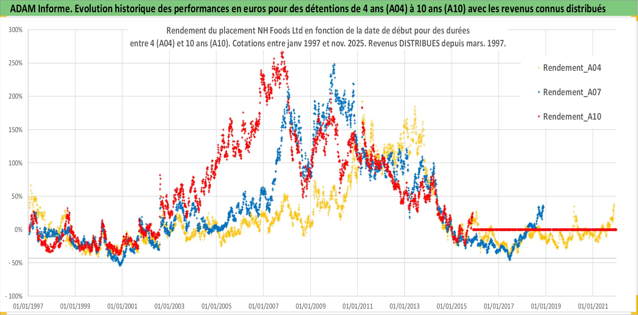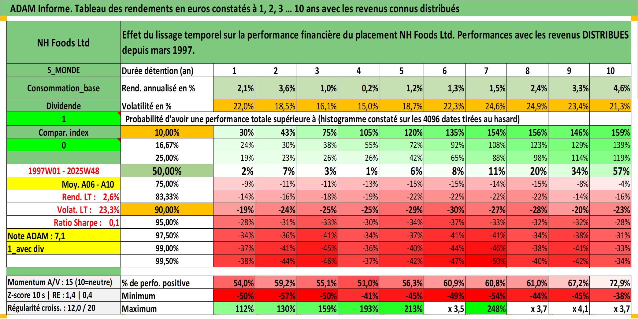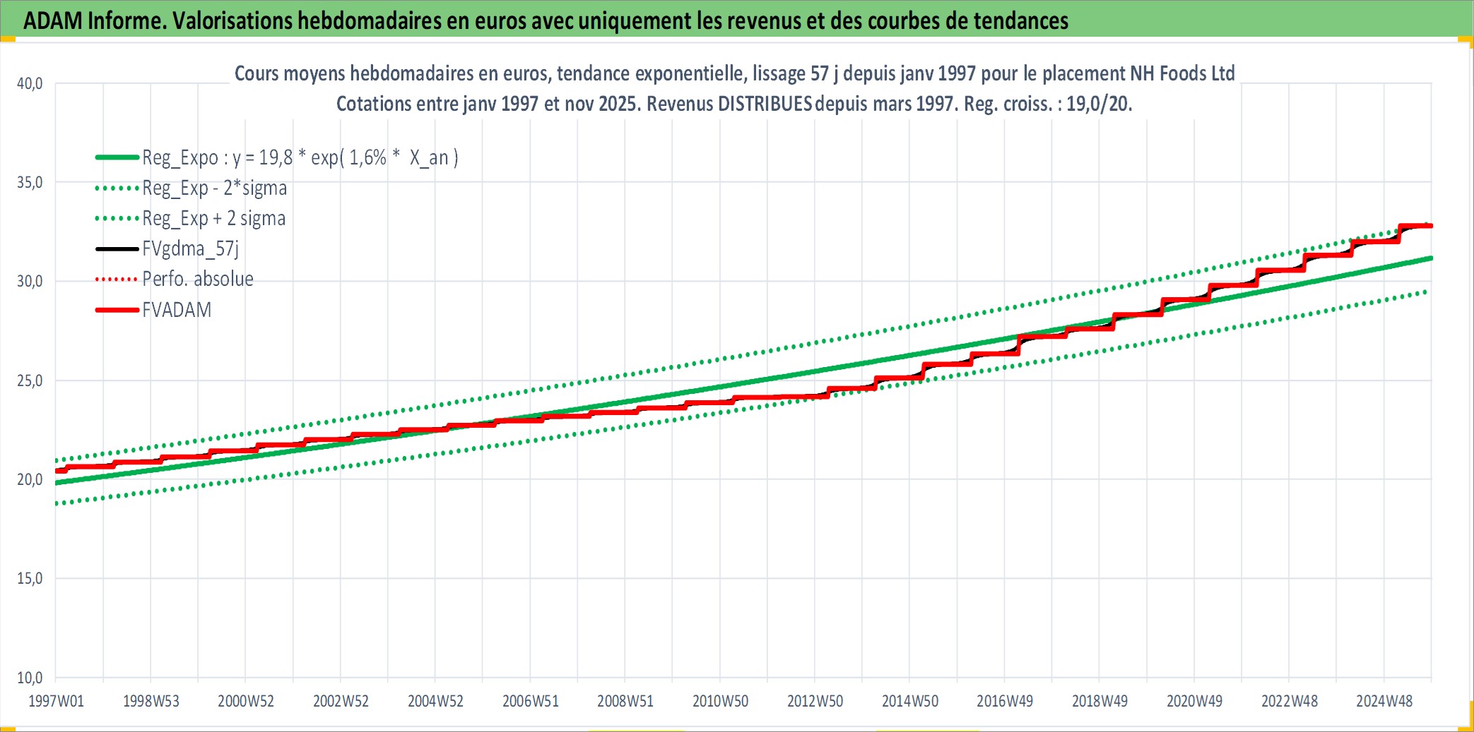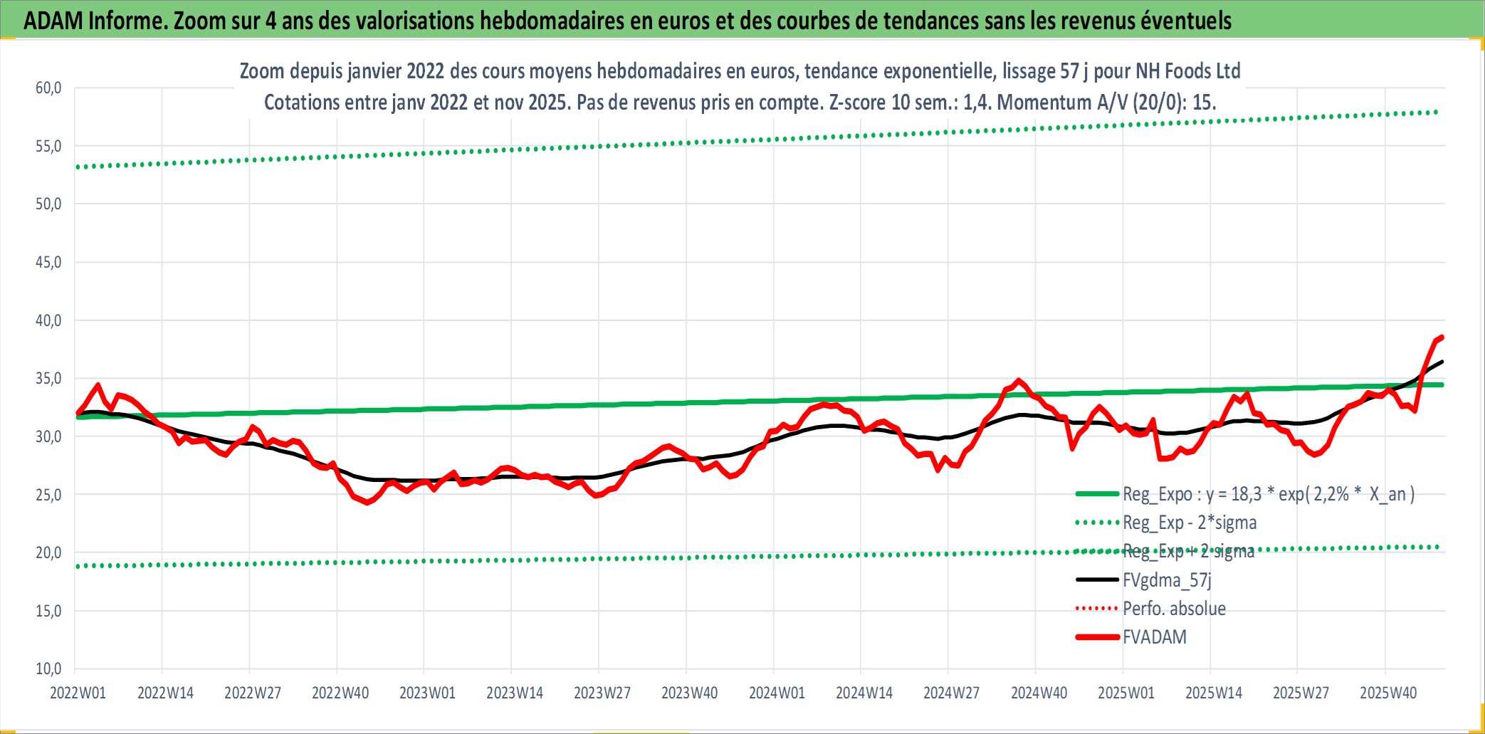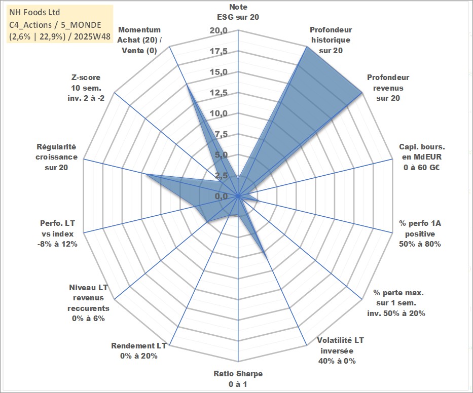 Site dédié aux investisseursPage dédiée sur site financeAnalyse des valorisations hebdomadaires de l'action NH Foods Ltd. Cet actif est cote en JPY. Les valorisations sont en contrevaleur EURO et couvrent les semaines 1997W01 a 2025W48. Les revenus de cet actif financier sont pris en compte depuis la semaine 1997W13. La note globale ESG de cet actif est estimee a 2.0 (apres rebasage entre 0 et 20).