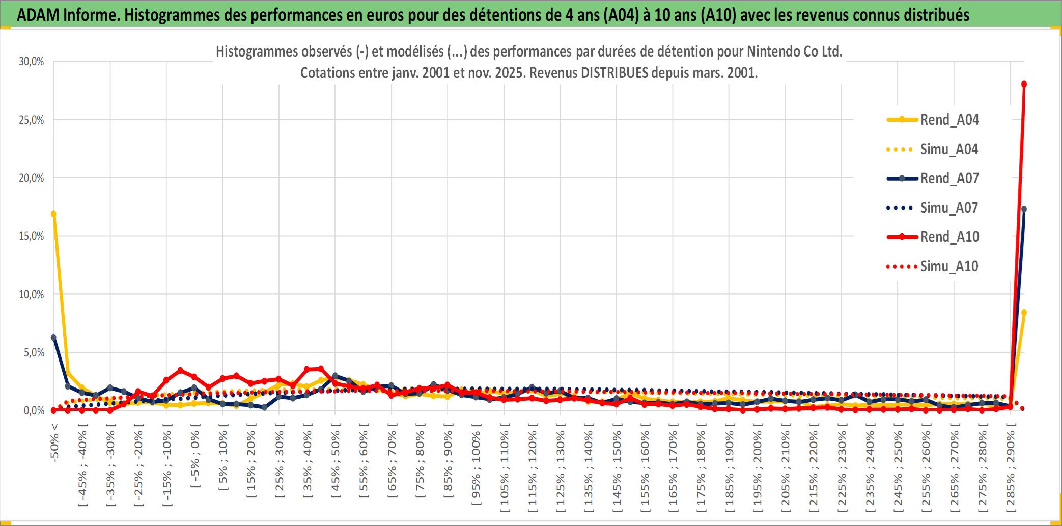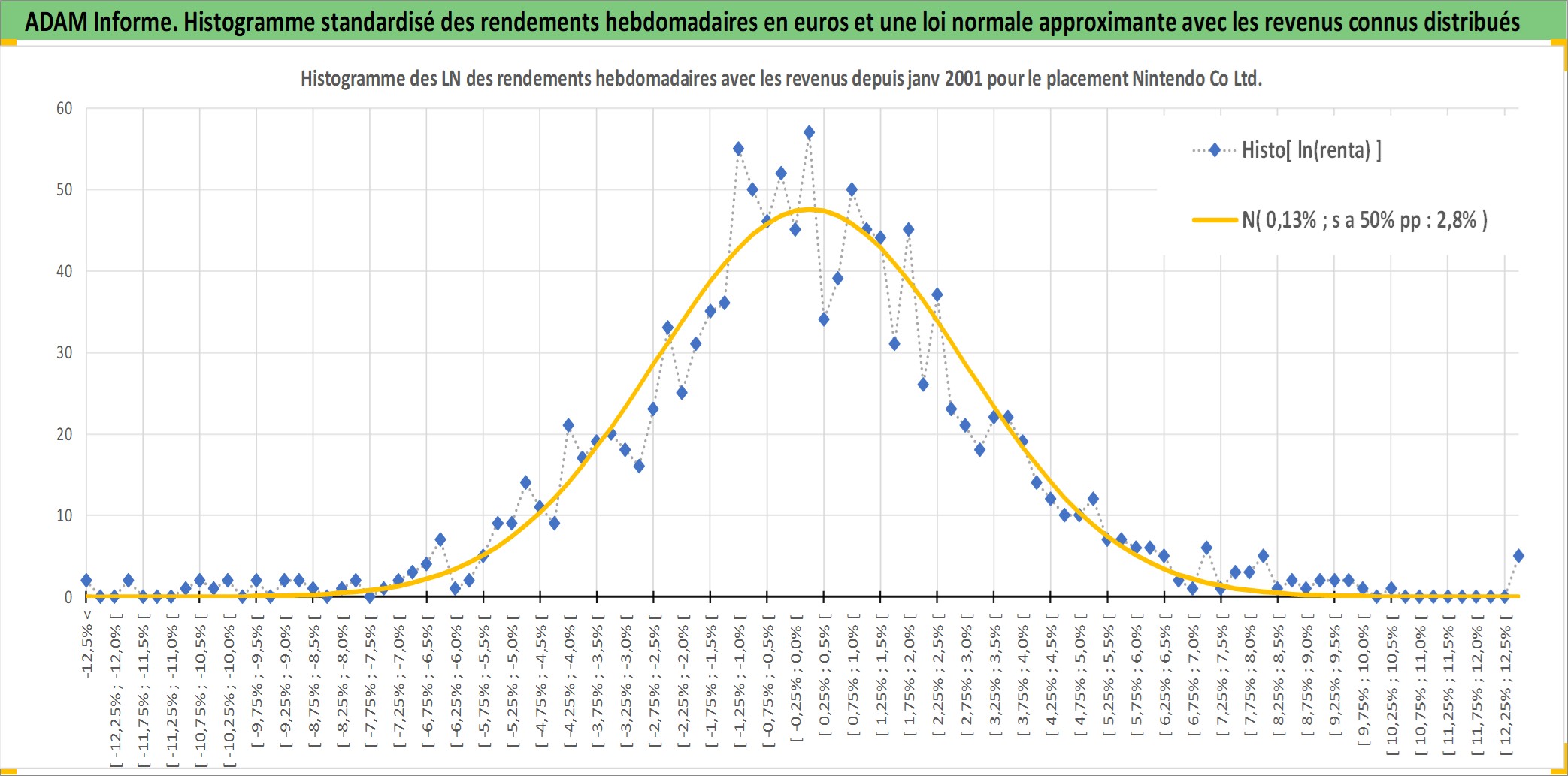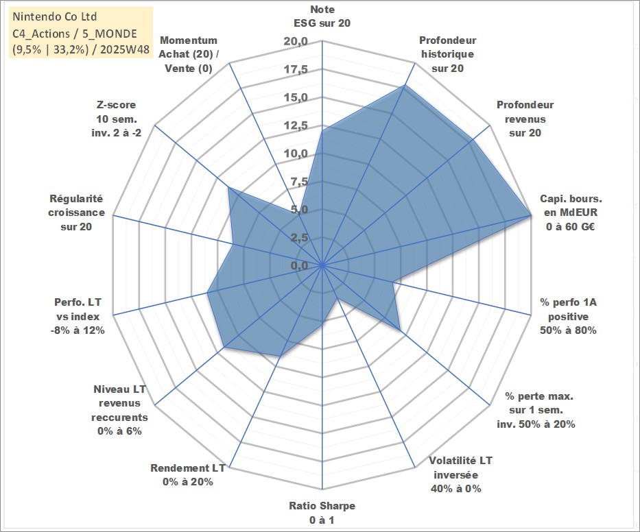Site dédié aux investisseursPage dédiée sur site financeAnalyse des valorisations hebdomadaires de l'action Nintendo Co Ltd. Cet actif est cote en JPY. Les valorisations sont en contrevaleur EURO et couvrent les semaines 2001W01 a 2025W48. Les revenus de cet actif financier sont pris en compte depuis la semaine 2001W13. La note globale ESG de cet actif est estimee a 12.0 (apres rebasage entre 0 et 20).