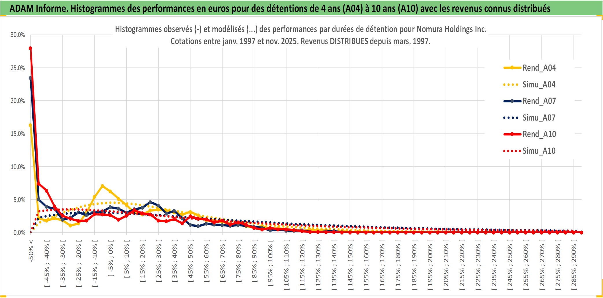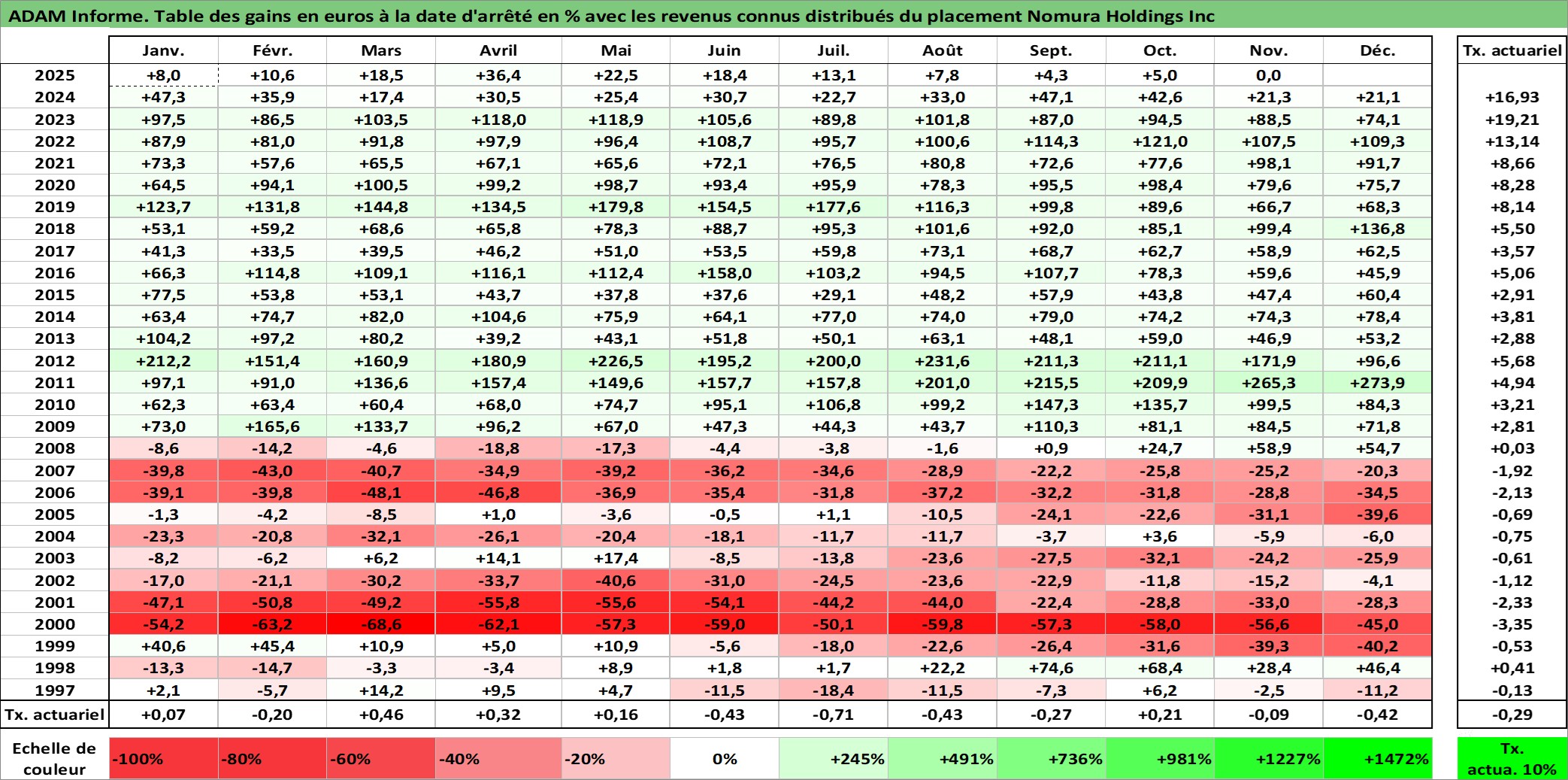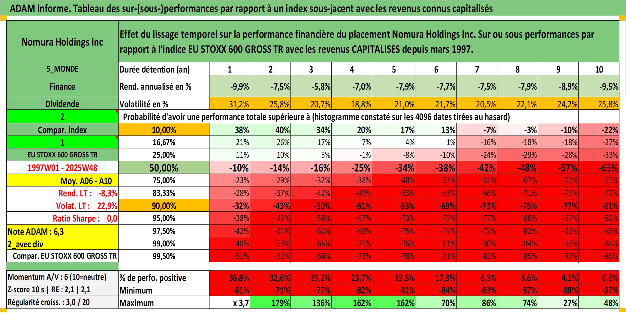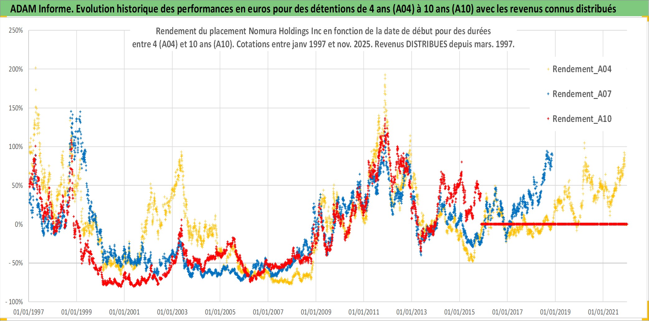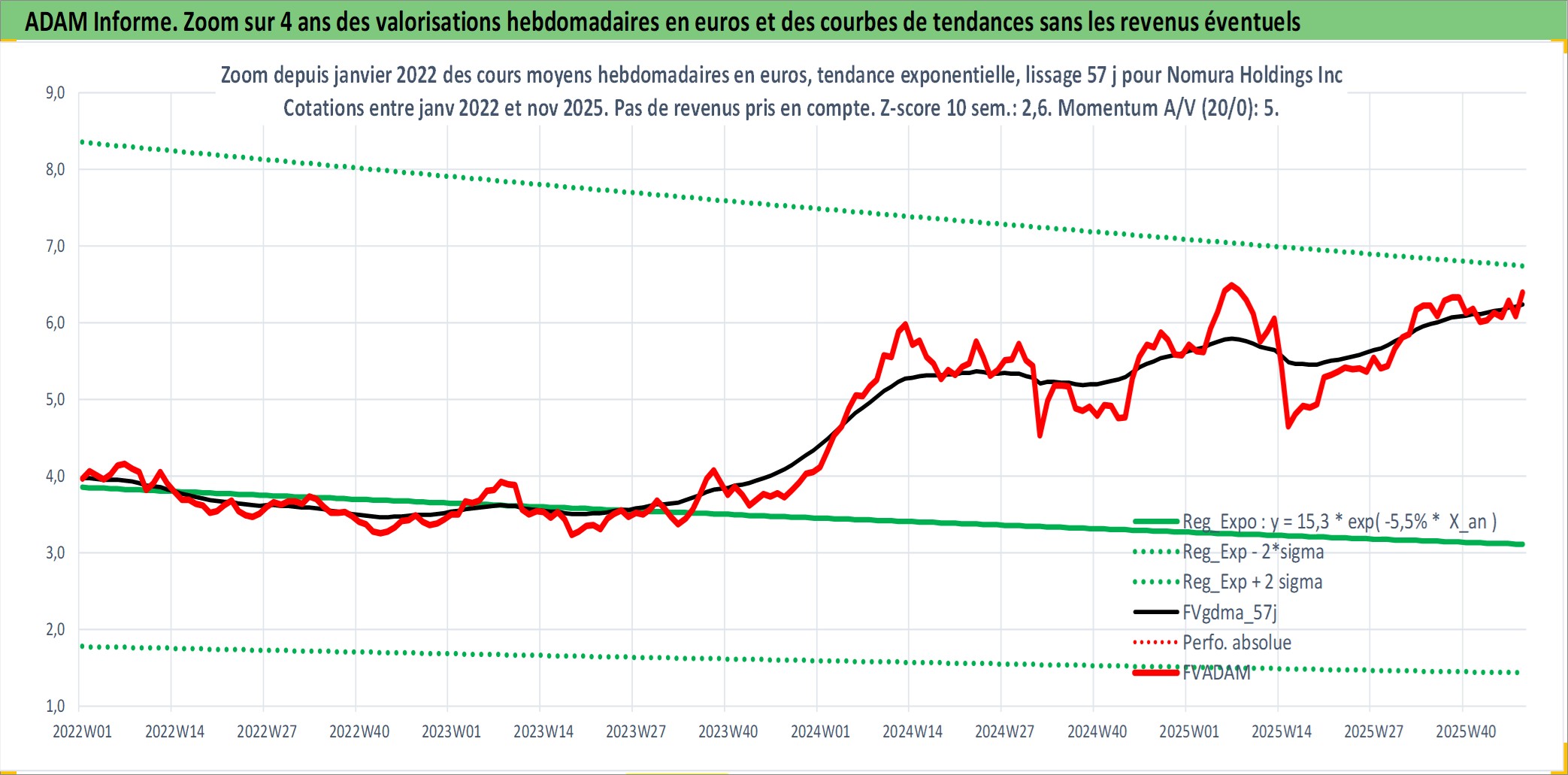 Site dédié aux investisseursPage dédiée sur site financeAnalyse des valorisations hebdomadaires de l'action Nomura Holdings Inc. Cet actif est cote en JPY. Les valorisations sont en contrevaleur EURO et couvrent les semaines 1997W01 a 2025W48. Les revenus de cet actif financier sont pris en compte depuis la semaine 1997W13. La note globale ESG de cet actif est estimee a 10.0 (apres rebasage entre 0 et 20).