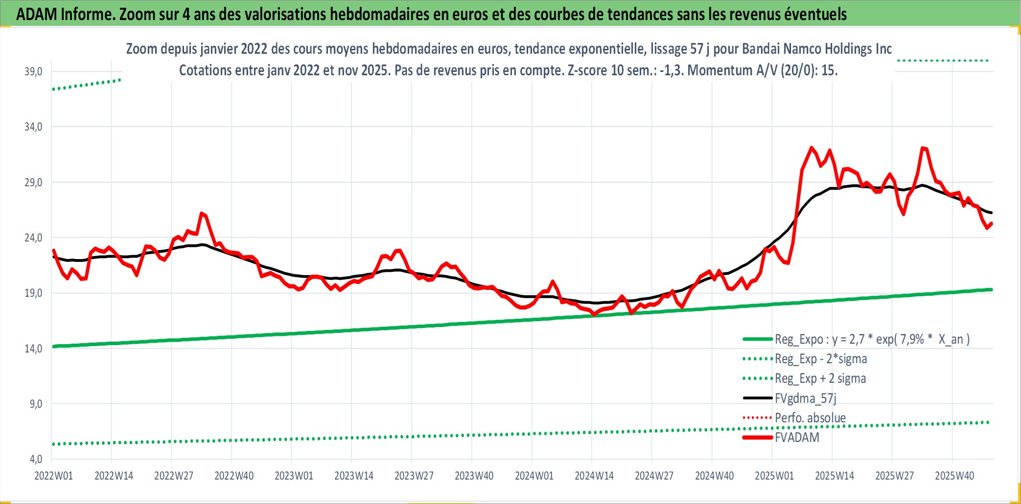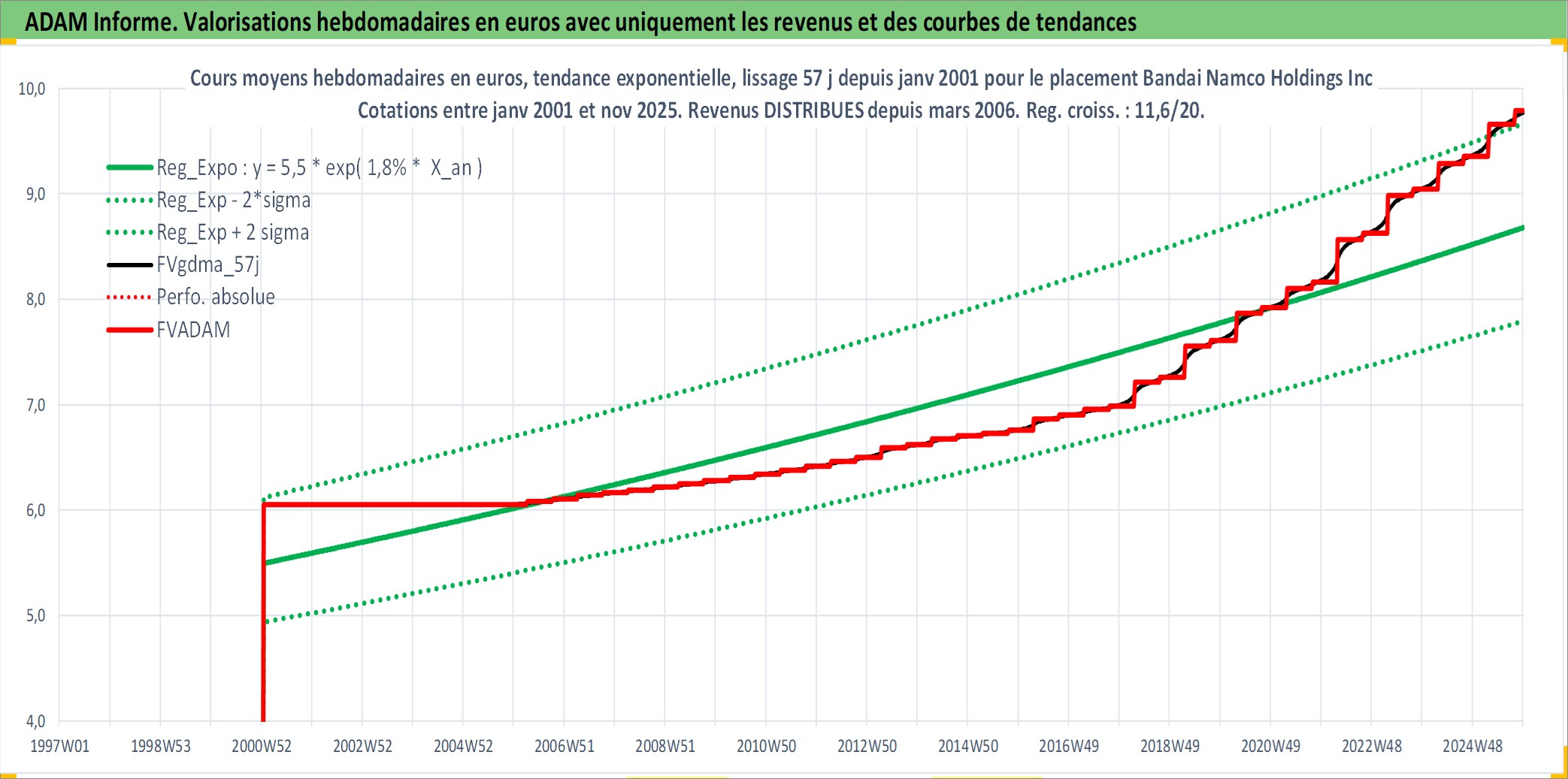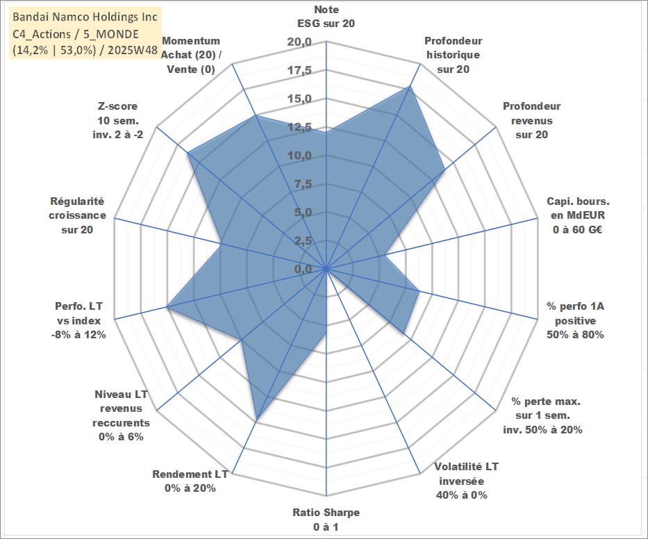 Site dédié aux investisseursPage dédiée sur site financeAnalyse des valorisations hebdomadaires de l'action Bandai Namco Holdings Inc. Cet actif est cote en JPY. Les valorisations sont en contrevaleur EURO et couvrent les semaines 2001W02 a 2025W48. Les revenus de cet actif financier sont pris en compte depuis la semaine 2006W13. La note globale ESG de cet actif est estimee a 12.0 (apres rebasage entre 0 et 20).