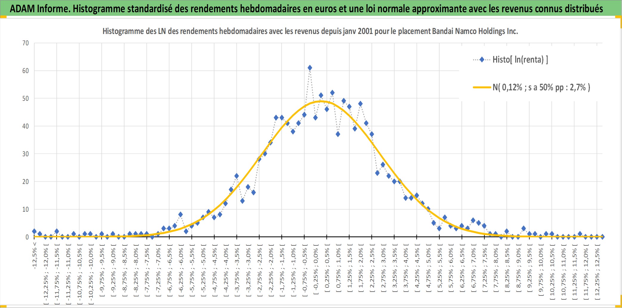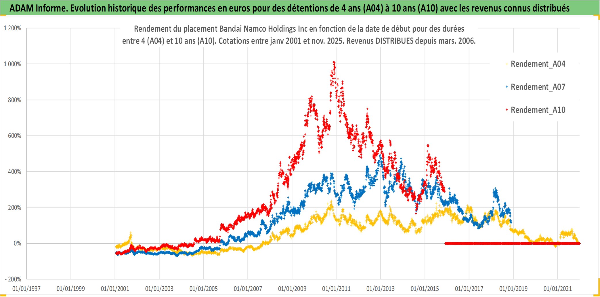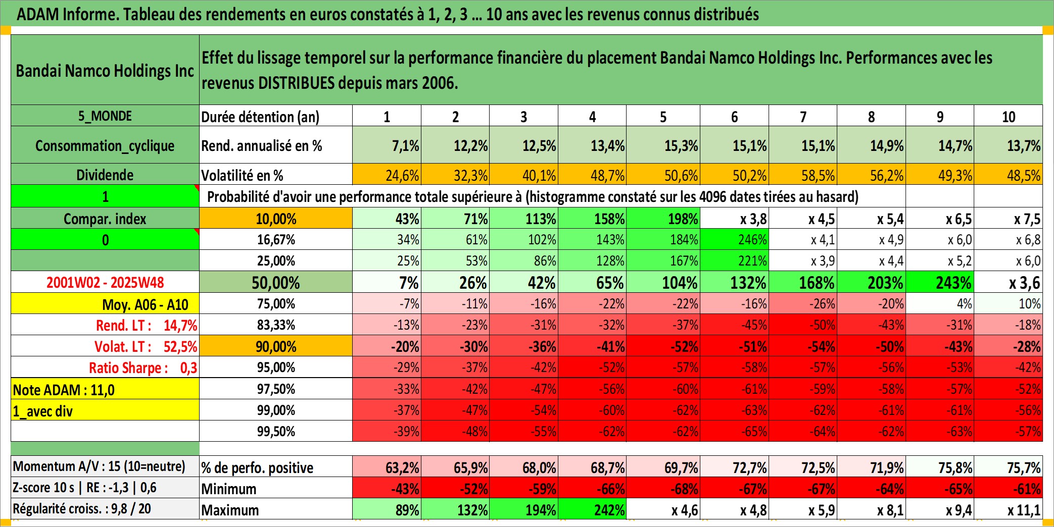 Site dédié aux investisseursPage dédiée sur site financeAnalyse des valorisations hebdomadaires de l'action Bandai Namco Holdings Inc. Cet actif est cote en JPY. Les valorisations sont en contrevaleur EURO et couvrent les semaines 2001W02 a 2025W48. Les revenus de cet actif financier sont pris en compte depuis la semaine 2006W13. La note globale ESG de cet actif est estimee a 12.0 (apres rebasage entre 0 et 20).