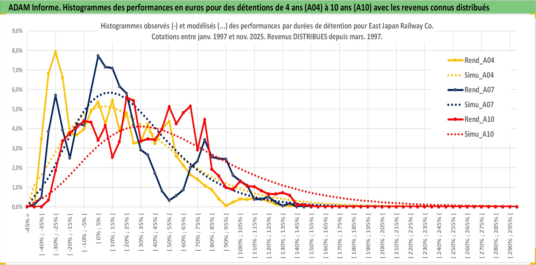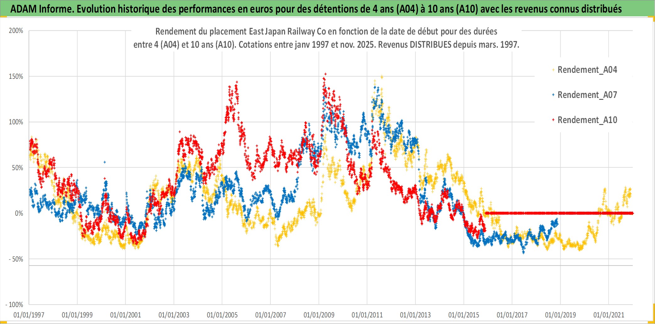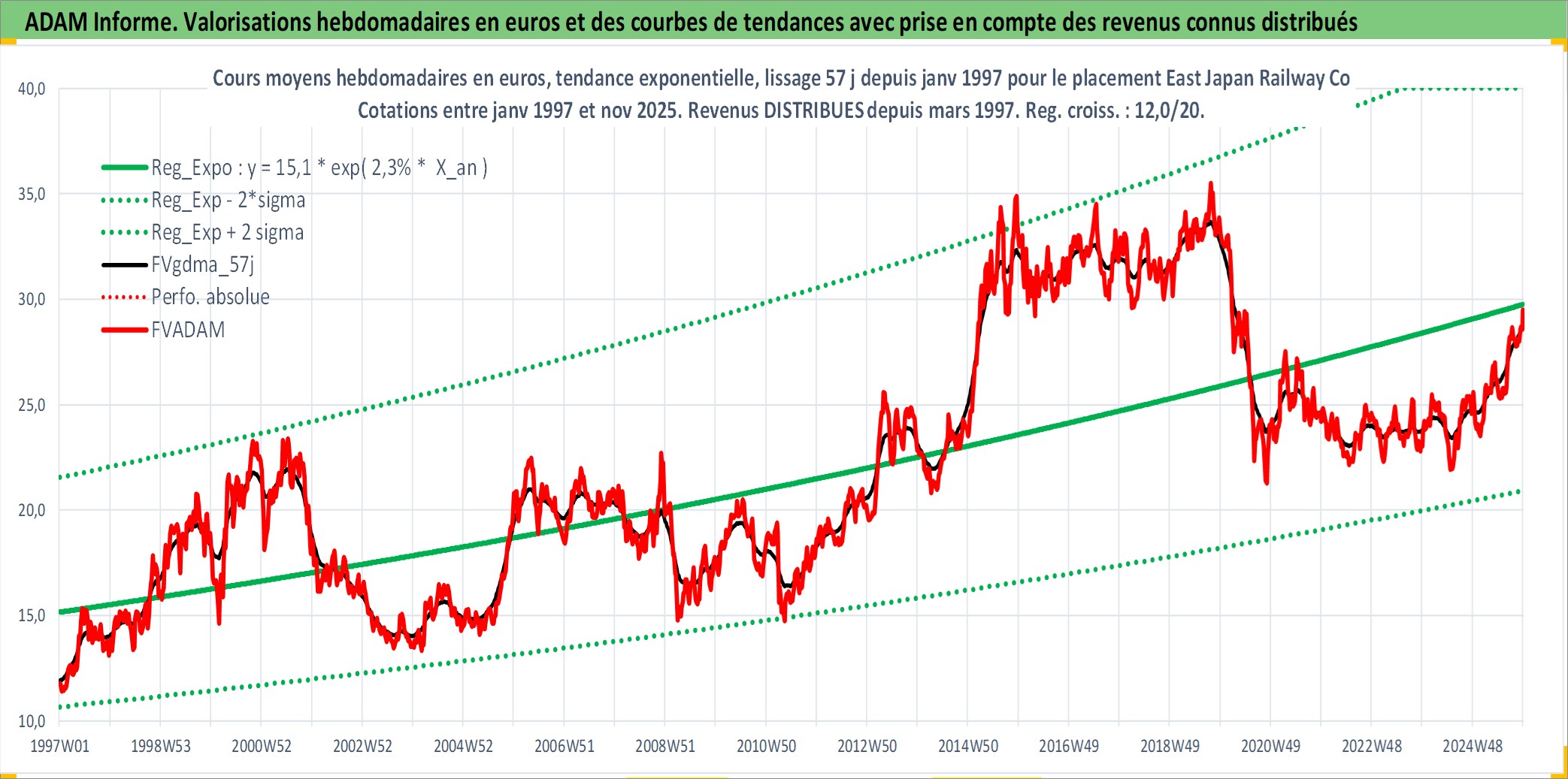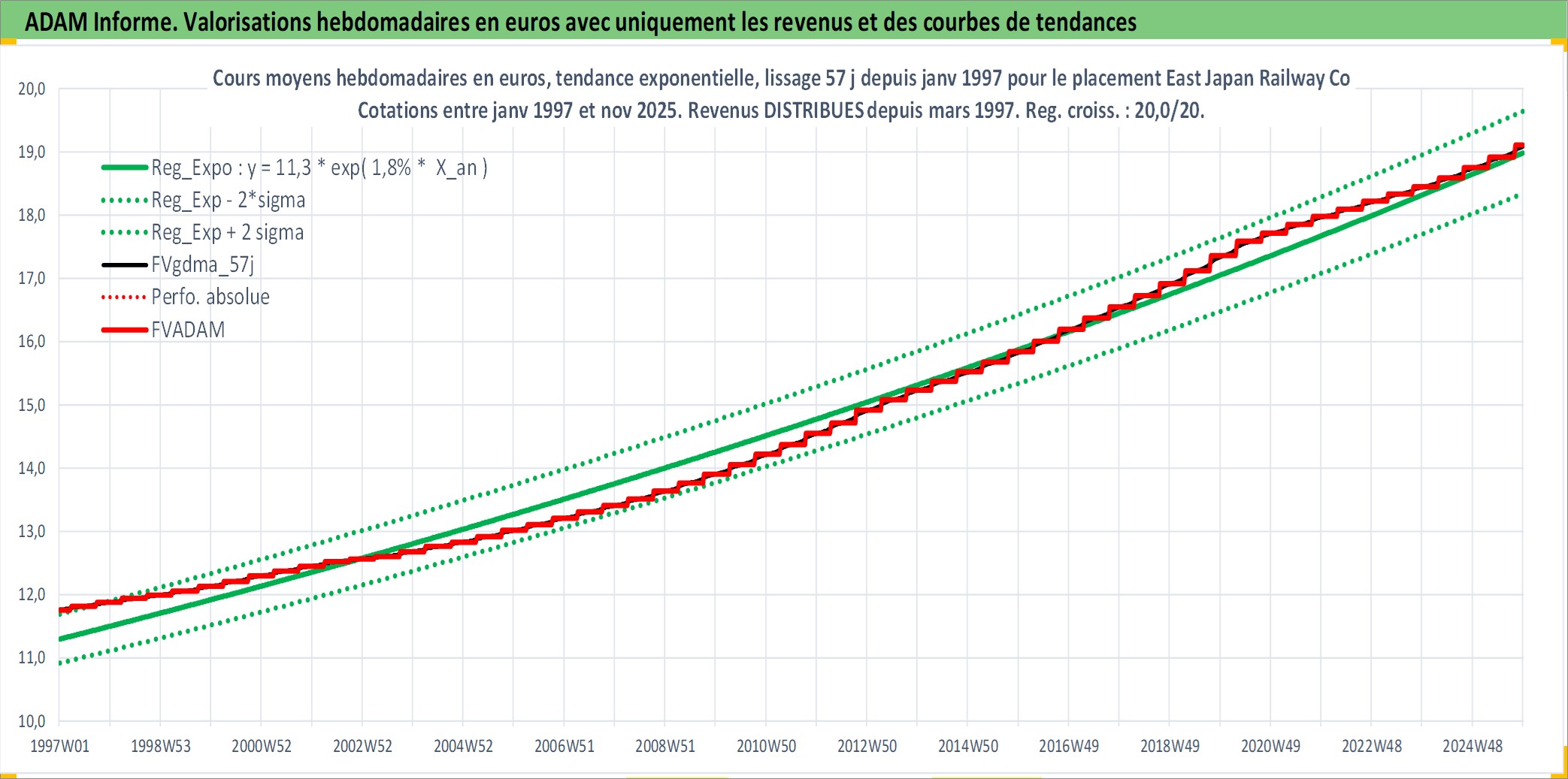 Site dédié aux investisseursPage dédiée sur site financeAnalyse des valorisations hebdomadaires de l'action East Japan Railway Co. Cet actif est cote en JPY. Les valorisations sont en contrevaleur EURO et couvrent les semaines 1997W01 a 2025W48. Les revenus de cet actif financier sont pris en compte depuis la semaine 1997W13. La note globale ESG de cet actif est estimee a 7.0 (apres rebasage entre 0 et 20).