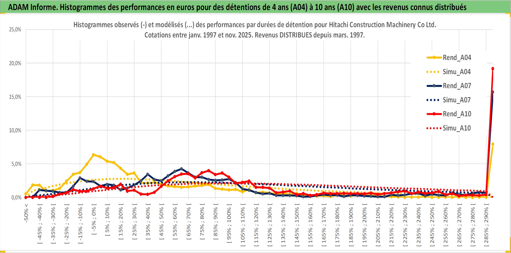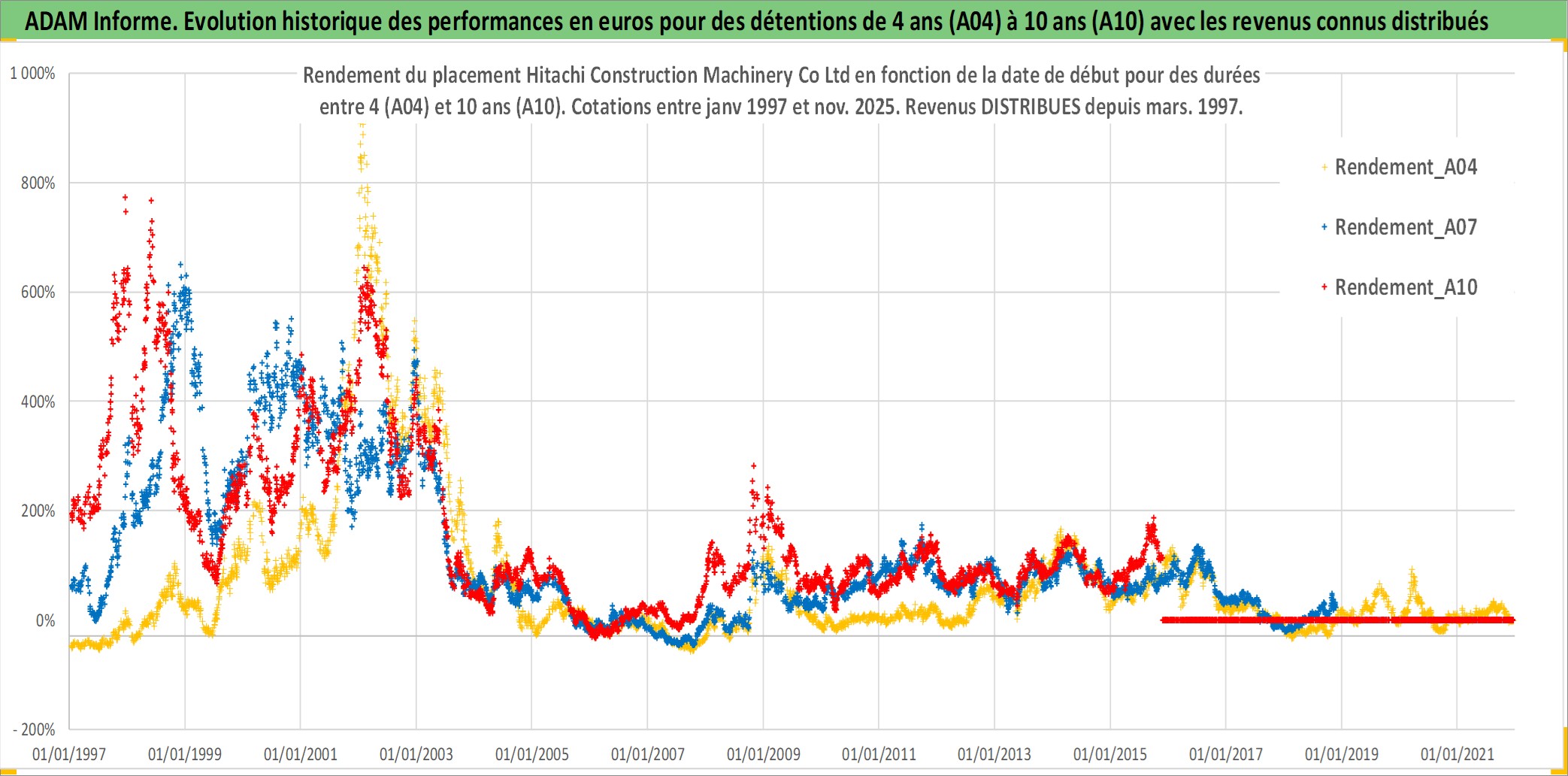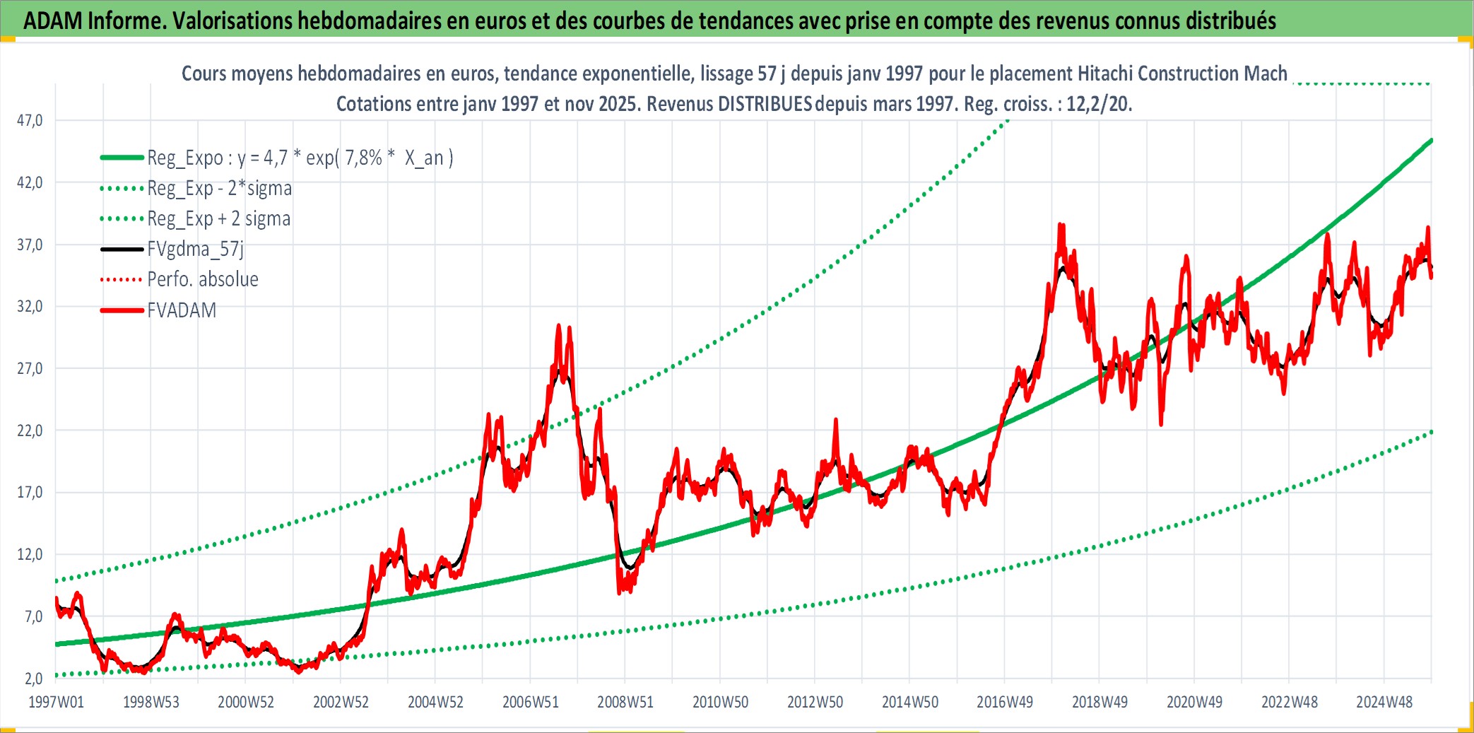 Site dédié aux investisseursPage dédiée sur site financeAnalyse des valorisations hebdomadaires de l'action Hitachi Construction Machinery Co Ltd. Cet actif est cote en JPY. Les valorisations sont en contrevaleur EURO et couvrent les semaines 1997W01 a 2025W48. Les revenus de cet actif financier sont pris en compte depuis la semaine 1997W13. La note ESG de cet actif n'est pas connue.
