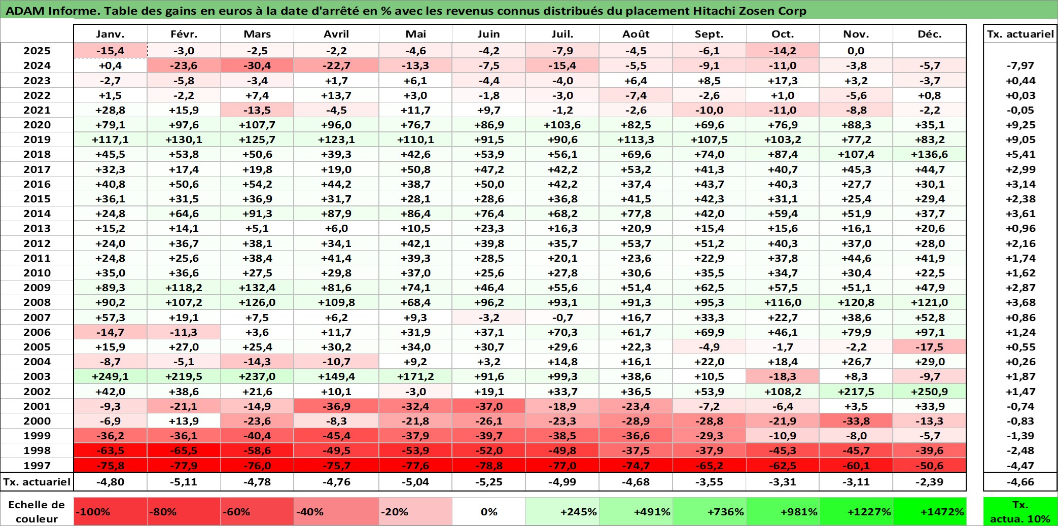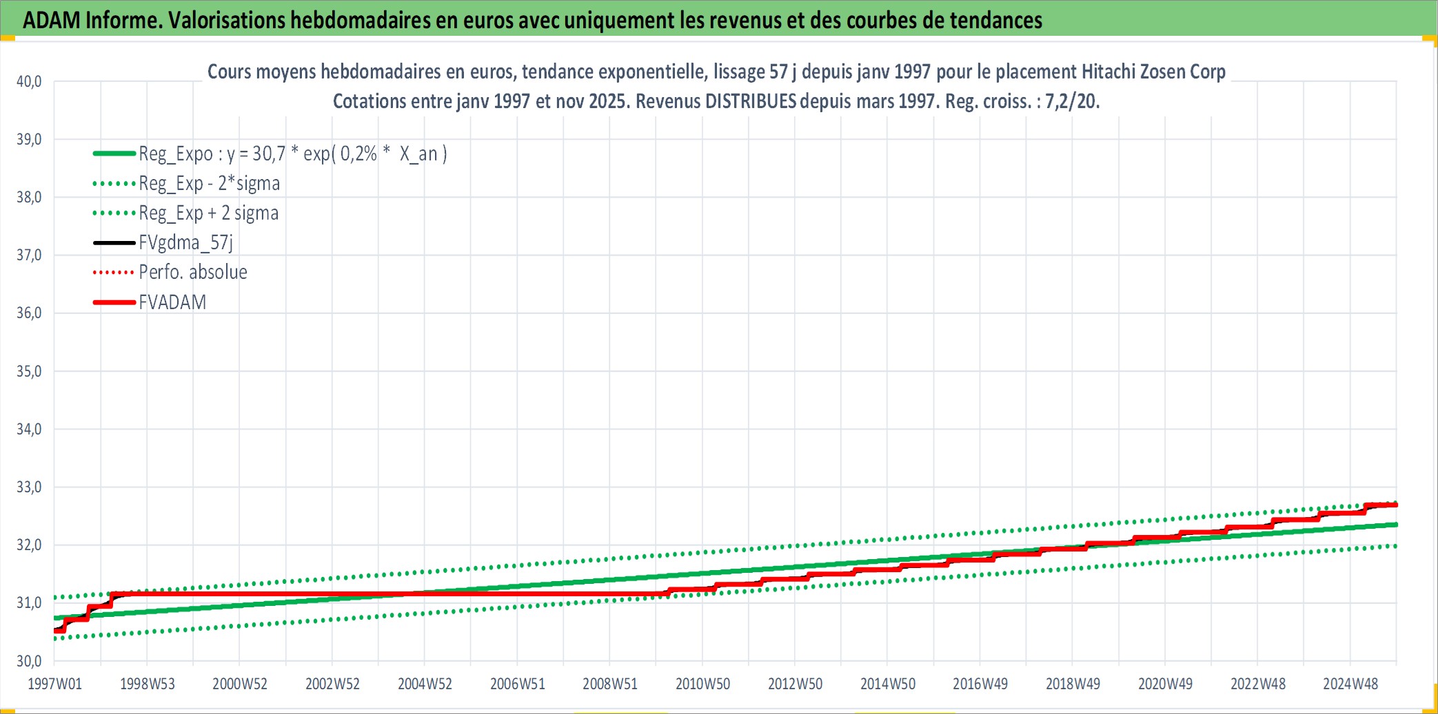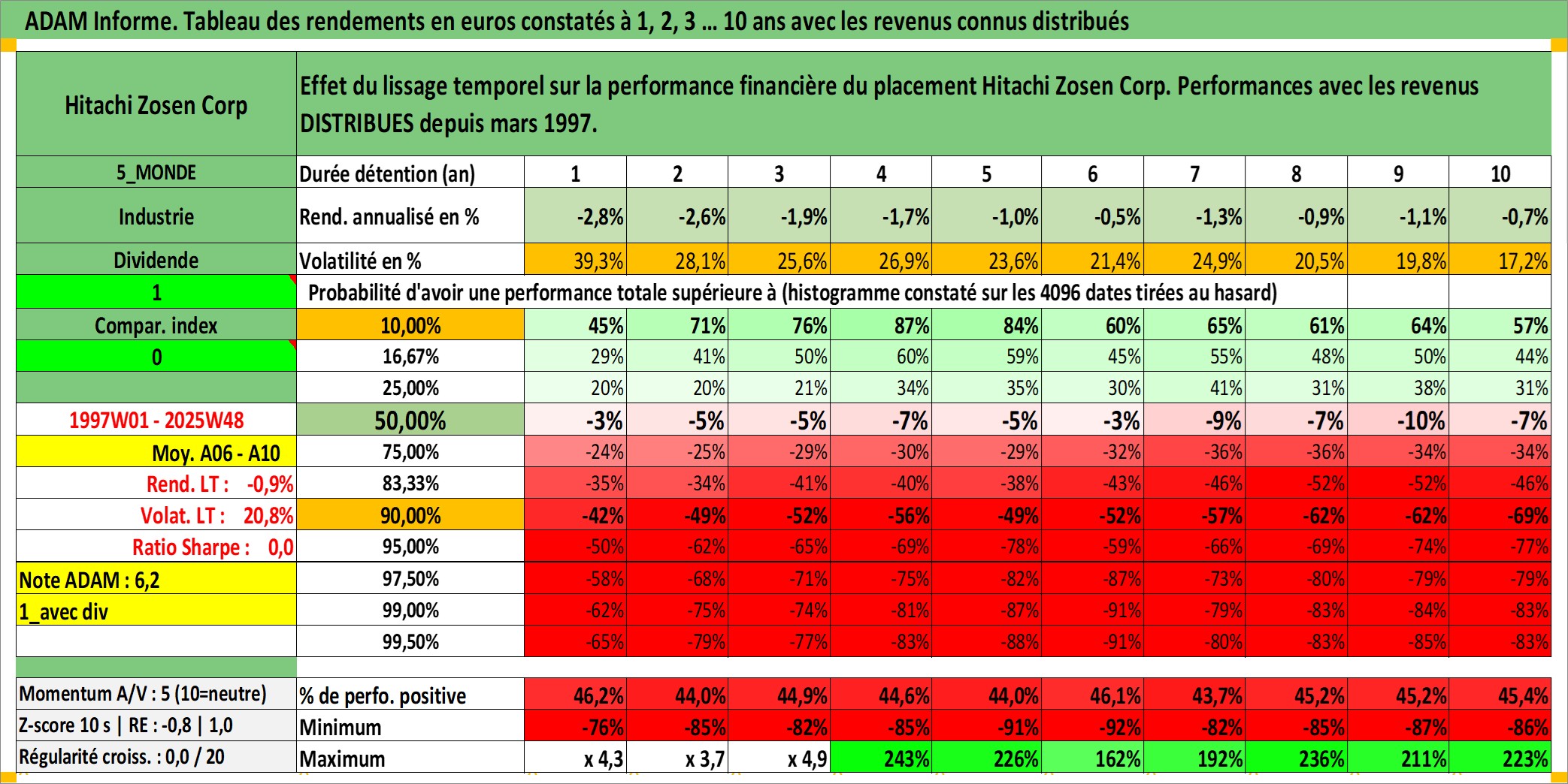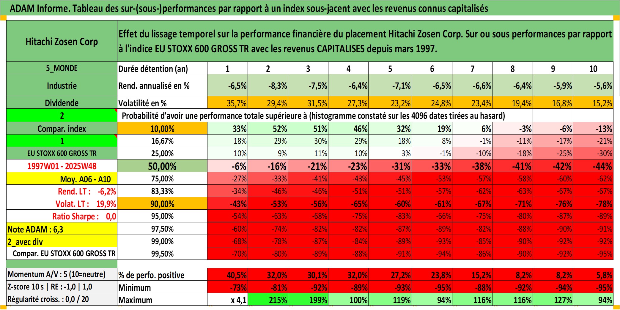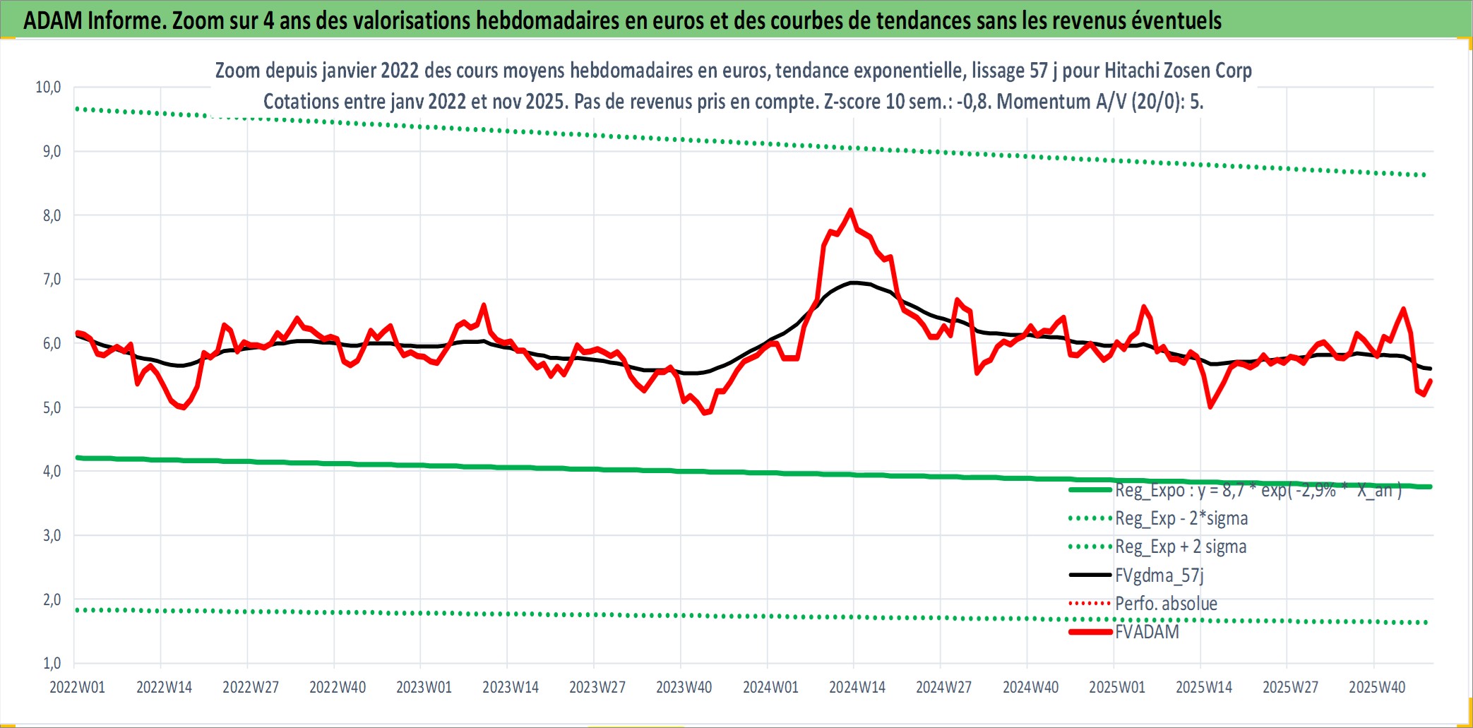 Site dédié aux investisseursPage dédiée sur site financeAnalyse des valorisations hebdomadaires de l'action Hitachi Zosen Corp. Cet actif est cote en JPY. Les valorisations sont en contrevaleur EURO et couvrent les semaines 1997W01 a 2025W48. Les revenus de cet actif financier sont pris en compte depuis la semaine 1997W13. La note ESG de cet actif n'est pas connue.