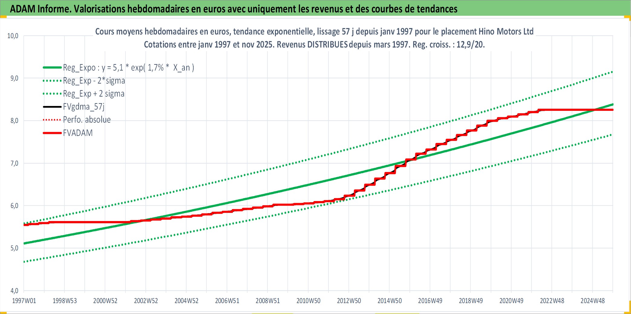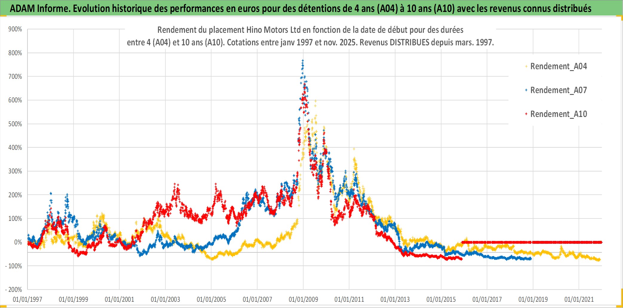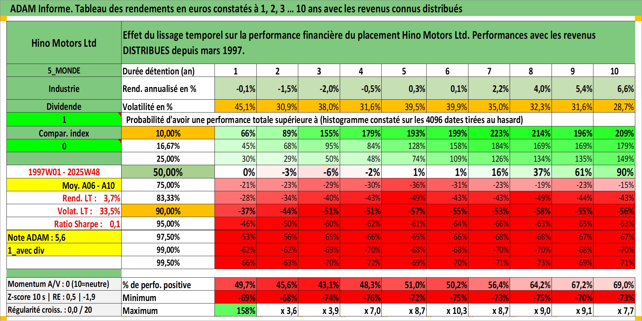 Site dédié aux investisseursPage dédiée sur site financeAnalyse des valorisations hebdomadaires de l'action Hino Motors Ltd. Cet actif est cote en JPY. Les valorisations sont en contrevaleur EURO et couvrent les semaines 1997W01 a 2025W48. Les revenus de cet actif financier sont pris en compte depuis la semaine 1997W13. La note globale ESG de cet actif est estimee a 4.0 (apres rebasage entre 0 et 20).