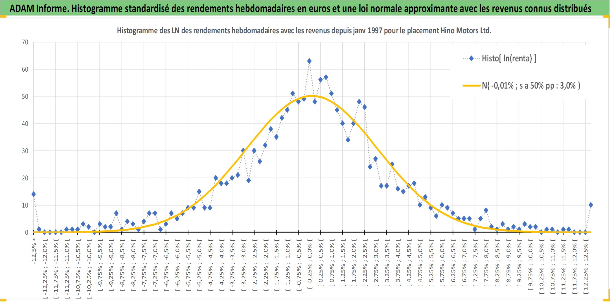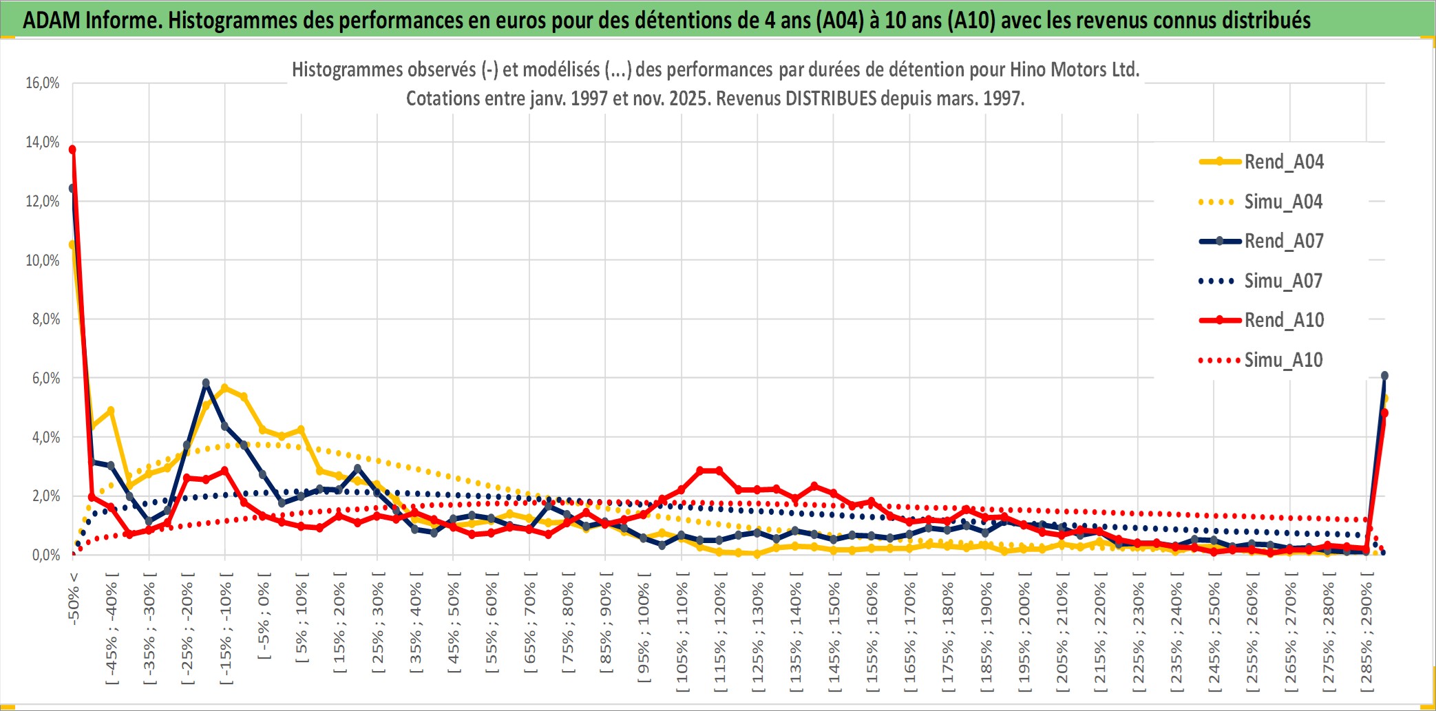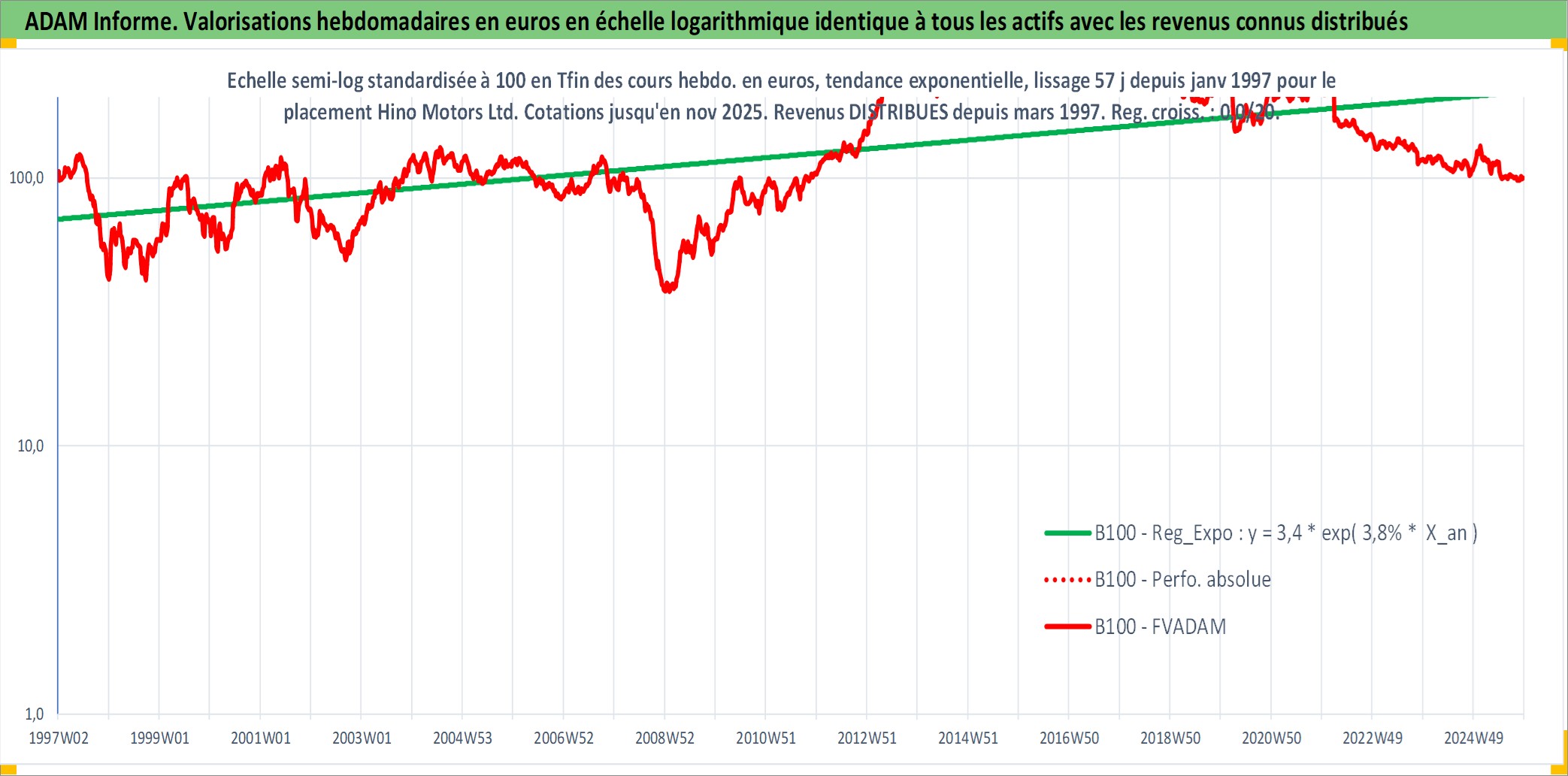 Site dédié aux investisseursPage dédiée sur site financeAnalyse des valorisations hebdomadaires de l'action Hino Motors Ltd. Cet actif est cote en JPY. Les valorisations sont en contrevaleur EURO et couvrent les semaines 1997W01 a 2025W48. Les revenus de cet actif financier sont pris en compte depuis la semaine 1997W13. La note globale ESG de cet actif est estimee a 4.0 (apres rebasage entre 0 et 20).
