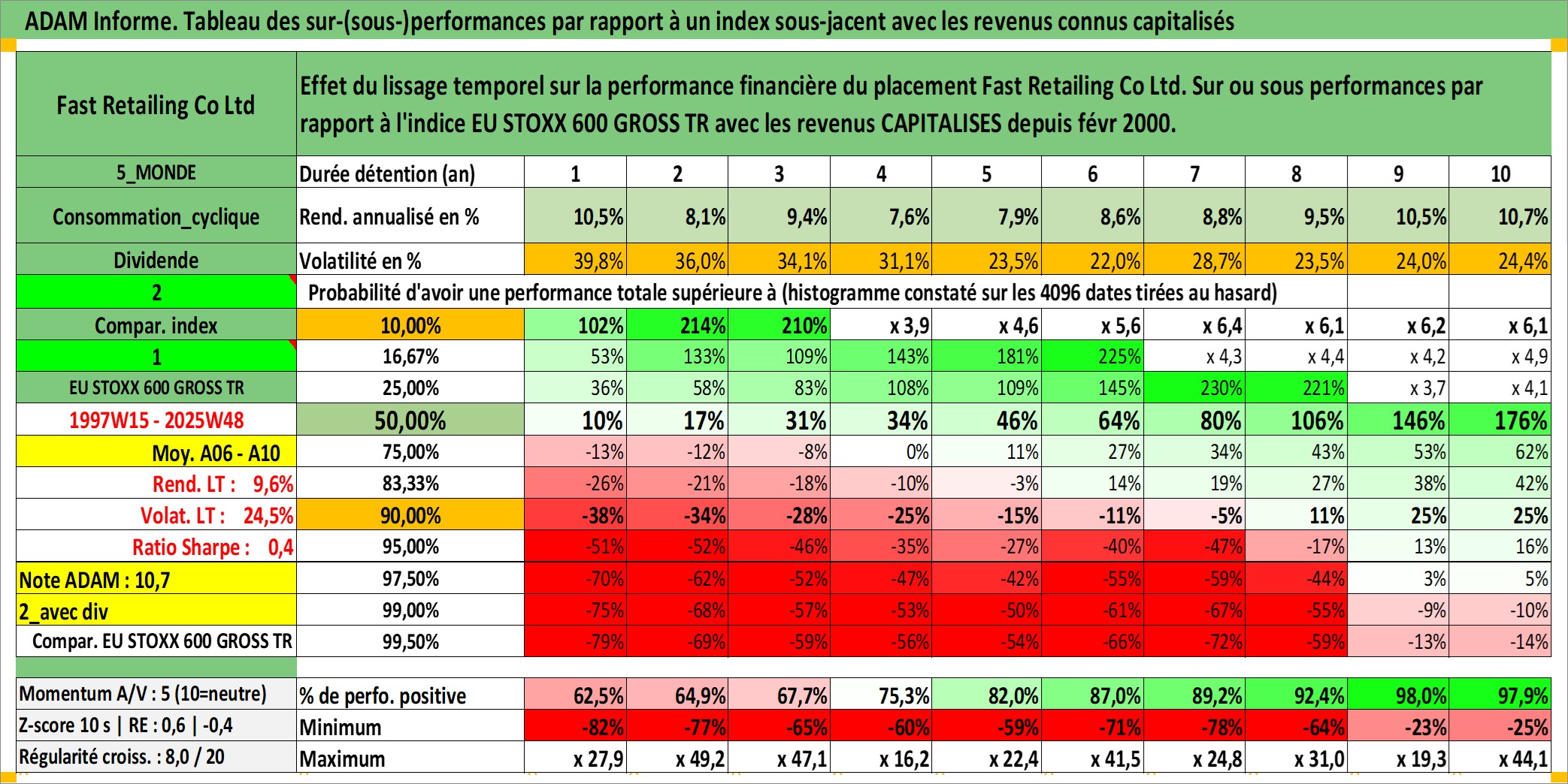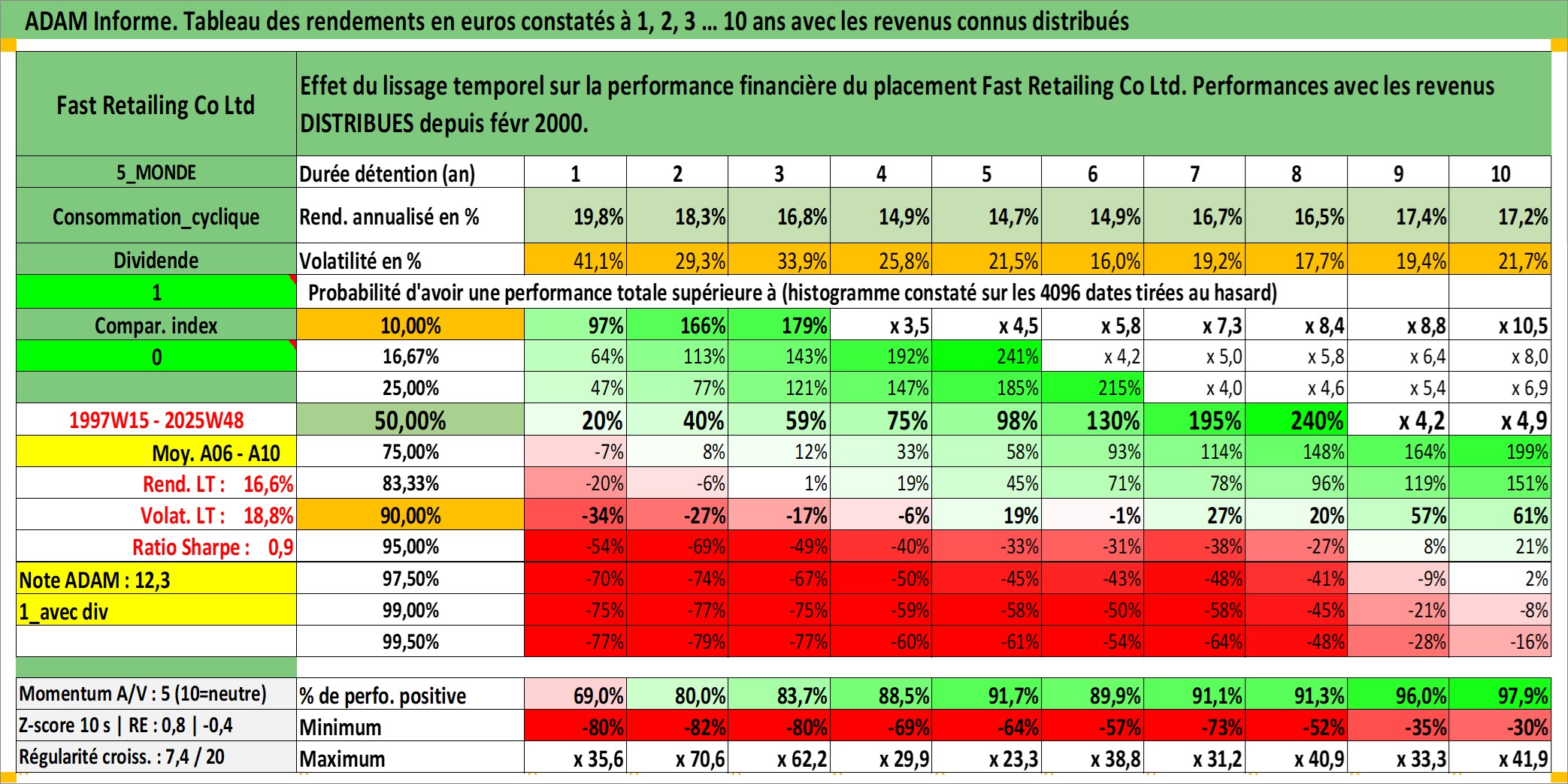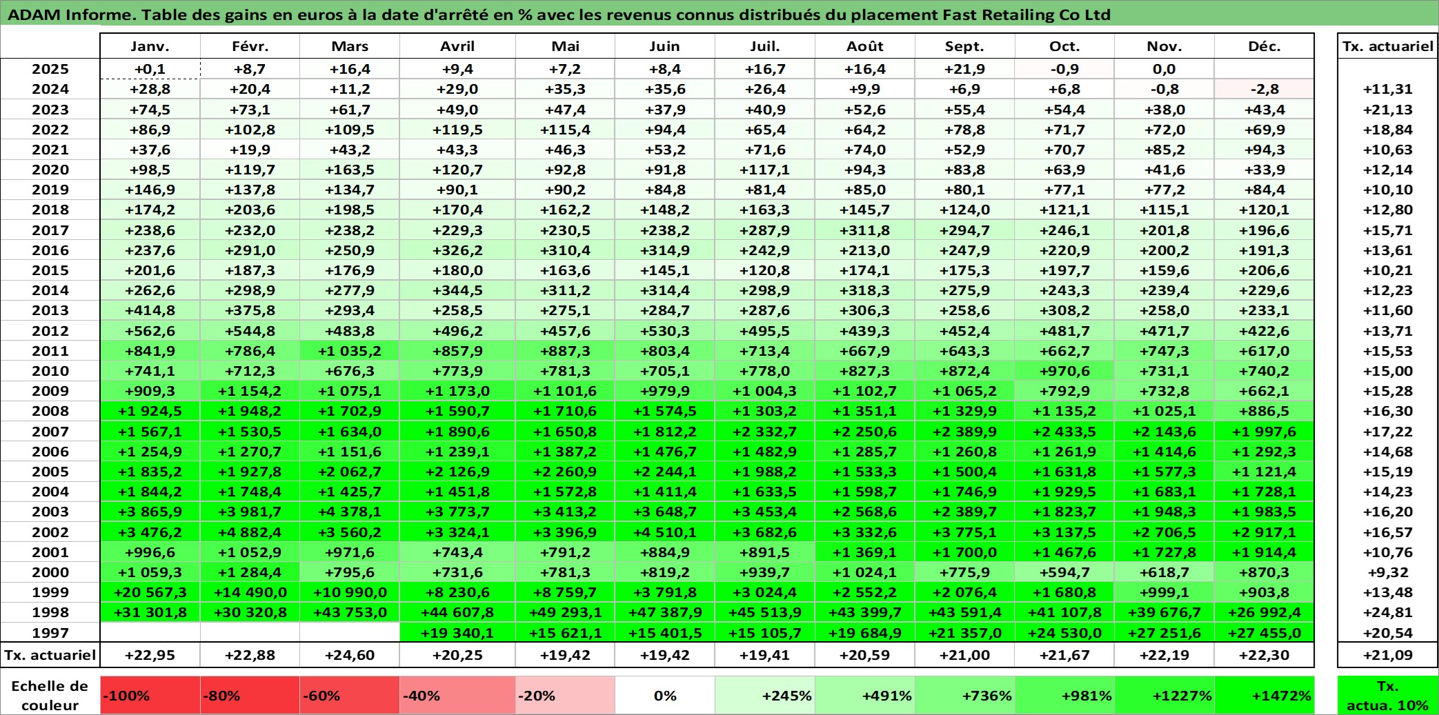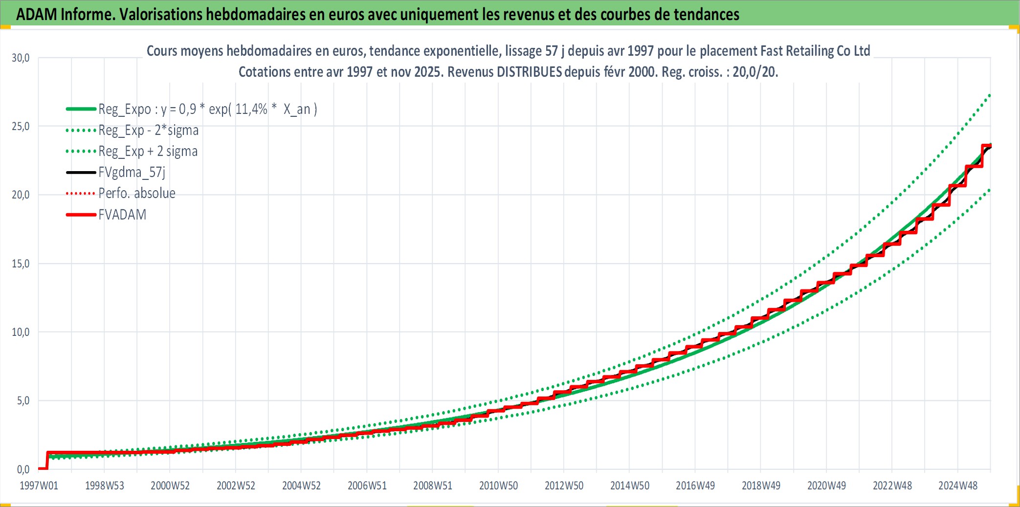 Site dédié aux investisseursPage dédiée sur site financeAnalyse des valorisations hebdomadaires de l'action Fast Retailing Co Ltd. Cet actif est cote en JPY. Les valorisations sont en contrevaleur EURO et couvrent les semaines 1997W15 a 2025W48. Les revenus de cet actif financier sont pris en compte depuis la semaine 2000W08. La note globale ESG de cet actif est estimee a 13.0 (apres rebasage entre 0 et 20).