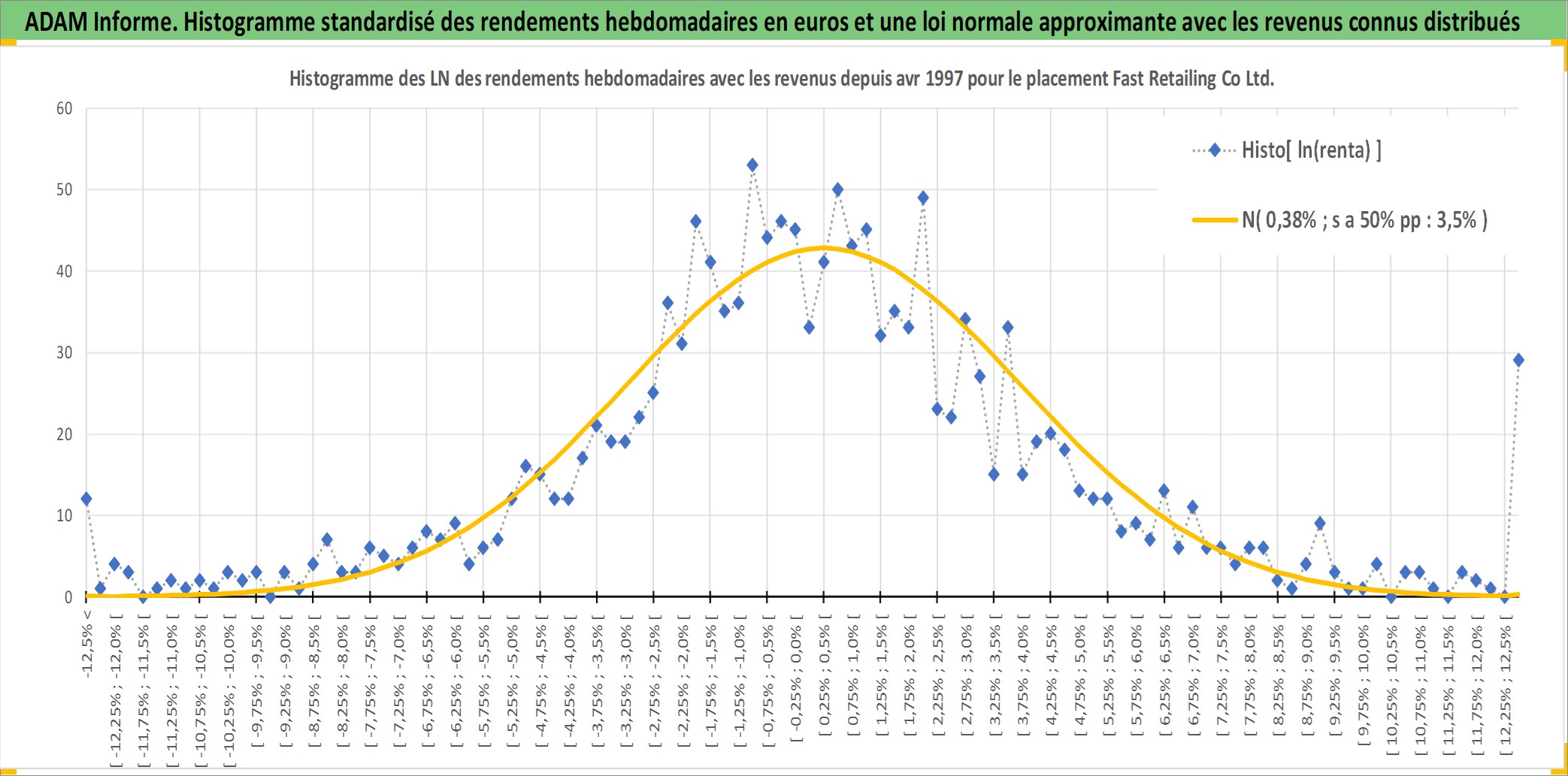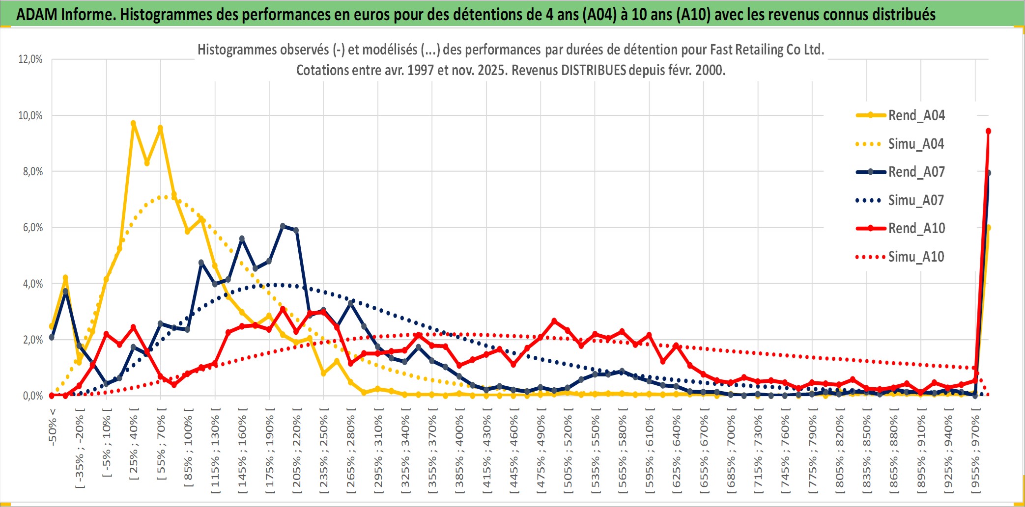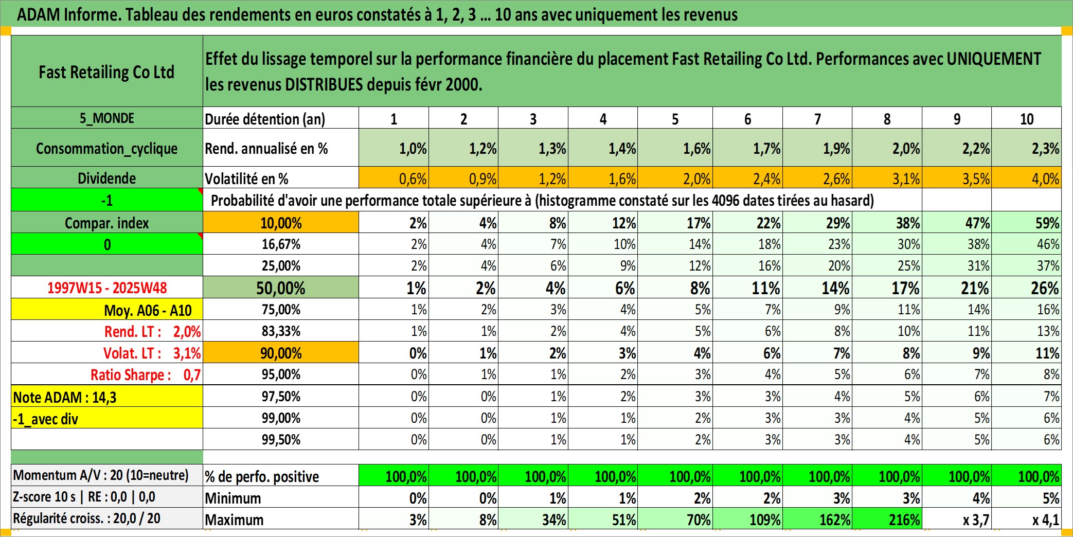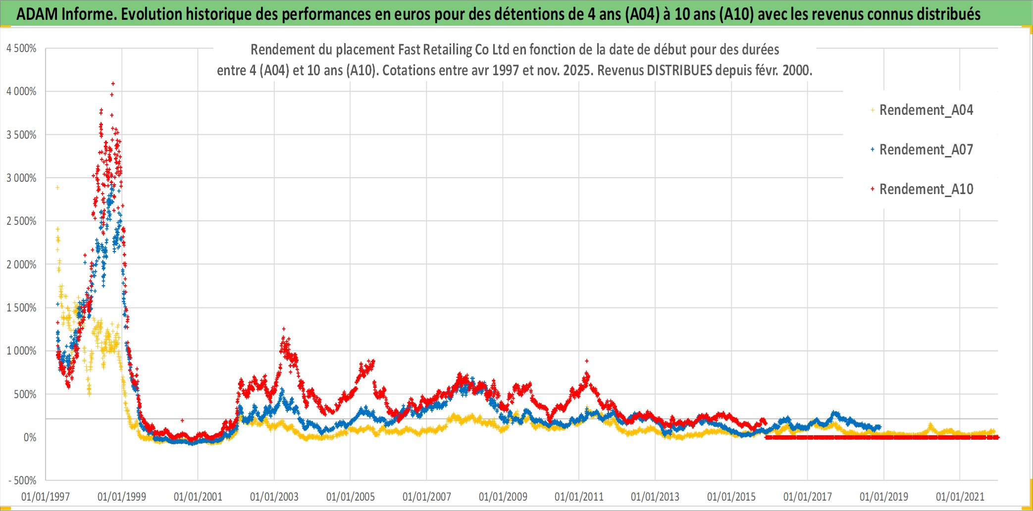 Site dédié aux investisseursPage dédiée sur site financeAnalyse des valorisations hebdomadaires de l'action Fast Retailing Co Ltd. Cet actif est cote en JPY. Les valorisations sont en contrevaleur EURO et couvrent les semaines 1997W15 a 2025W48. Les revenus de cet actif financier sont pris en compte depuis la semaine 2000W08. La note globale ESG de cet actif est estimee a 13.0 (apres rebasage entre 0 et 20).