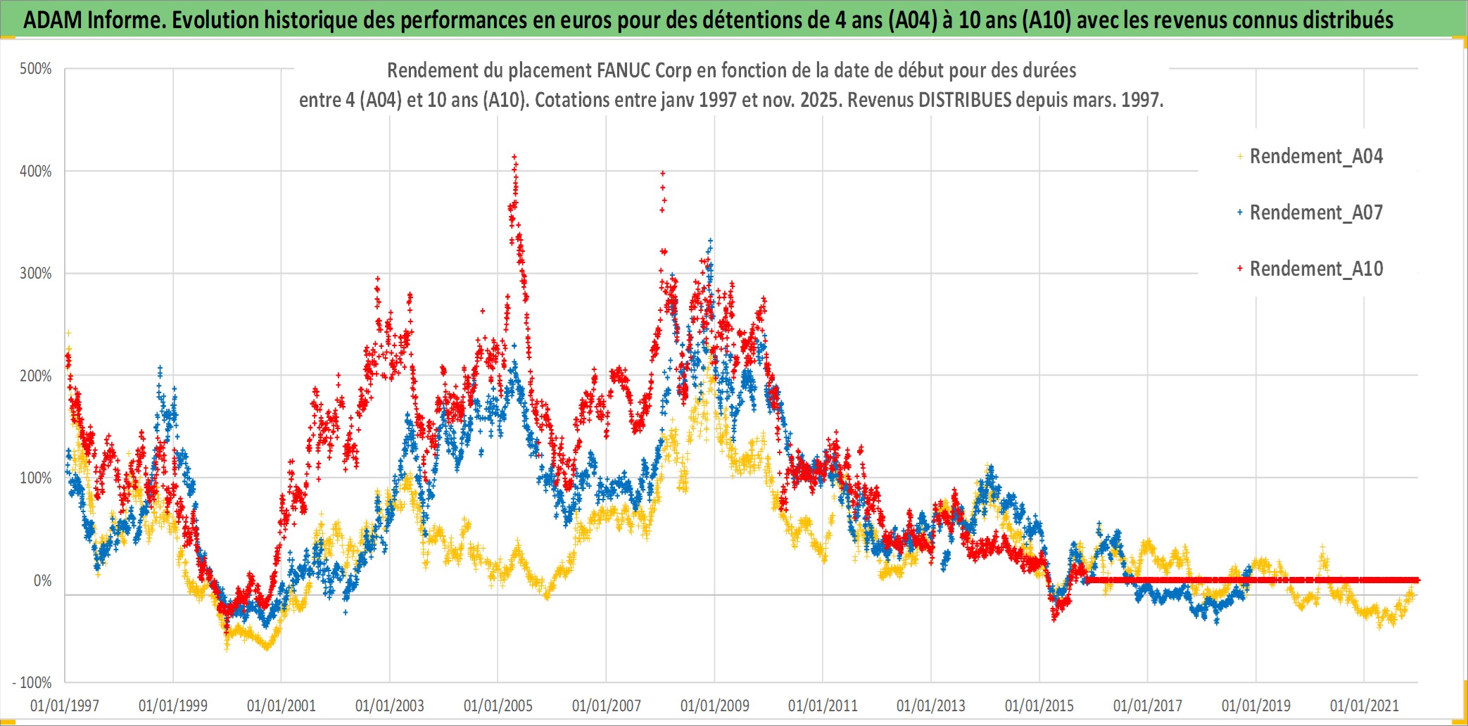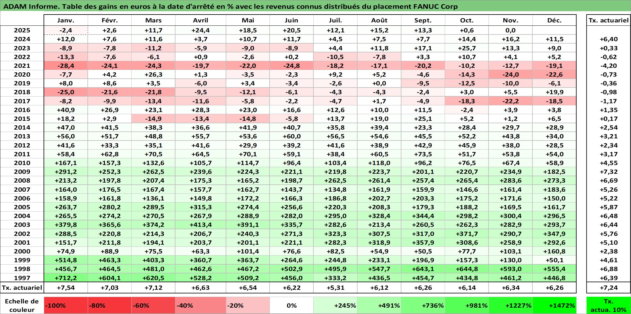 Site dédié aux investisseursPage dédiée sur site financeAnalyse des valorisations hebdomadaires de l'action FANUC Corp. Cet actif est cote en JPY. Les valorisations sont en contrevaleur EURO et couvrent les semaines 1997W01 a 2025W48. Les revenus de cet actif financier sont pris en compte depuis la semaine 1997W13. La note globale ESG de cet actif est estimee a 7.0 (apres rebasage entre 0 et 20).