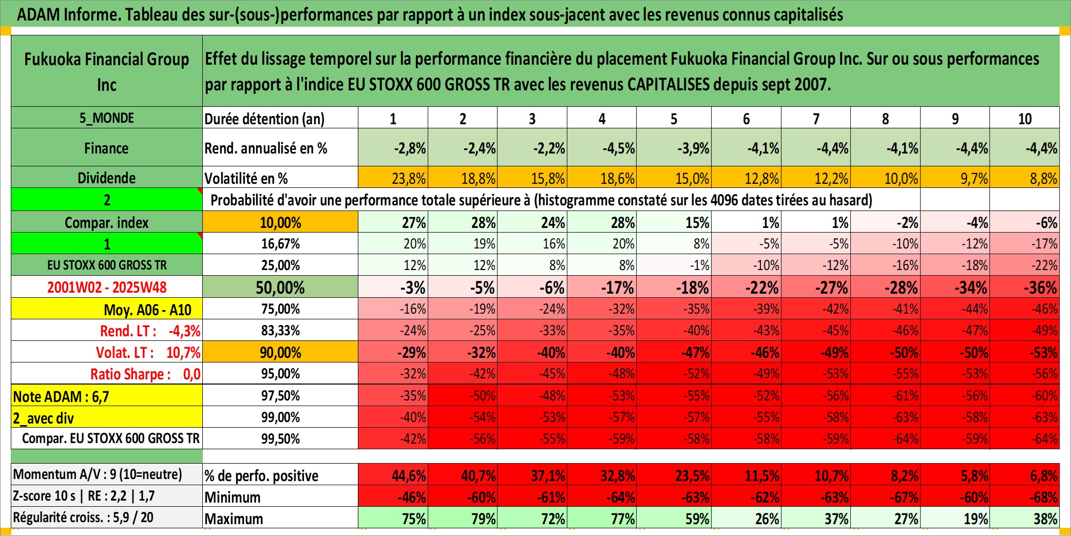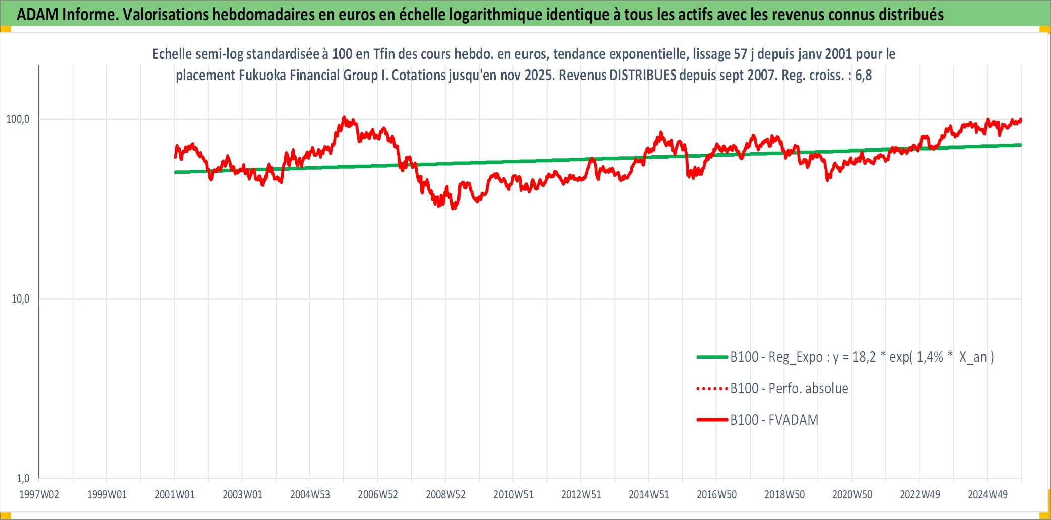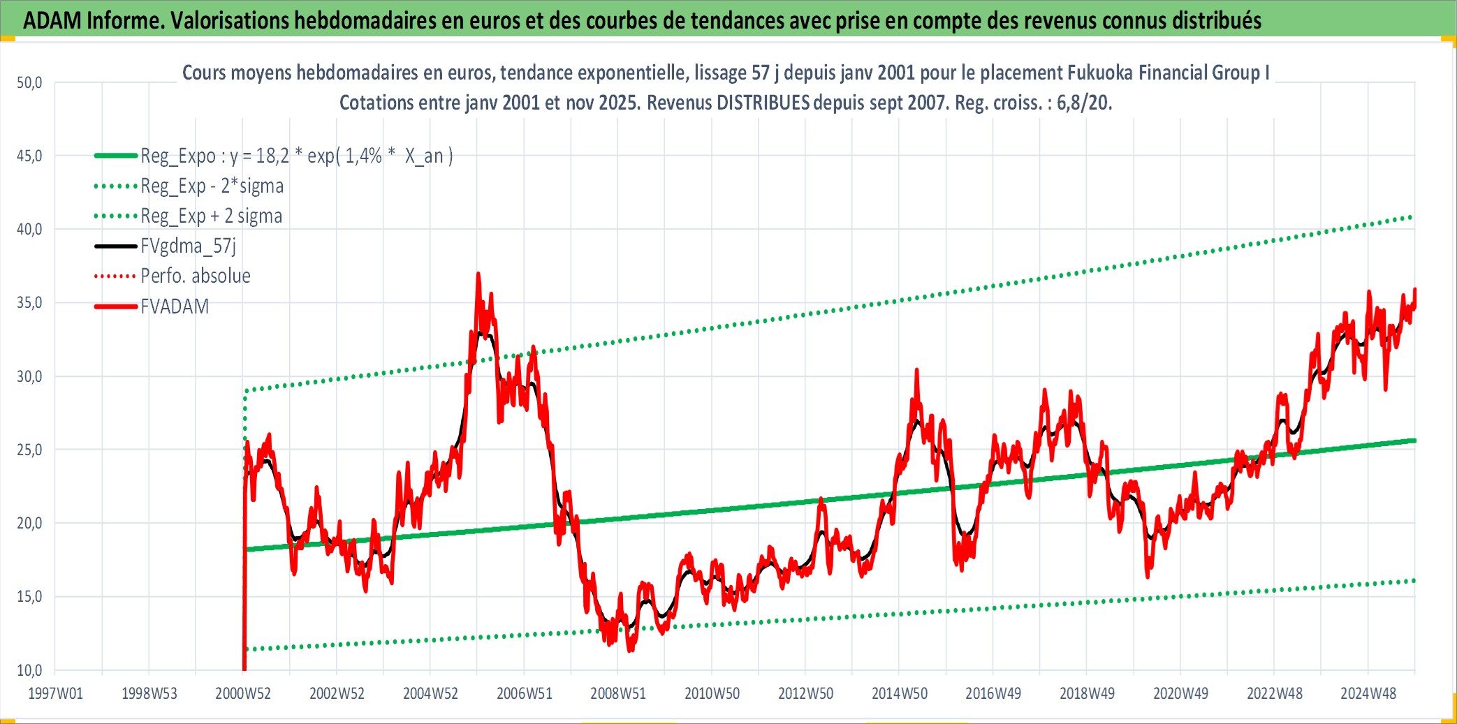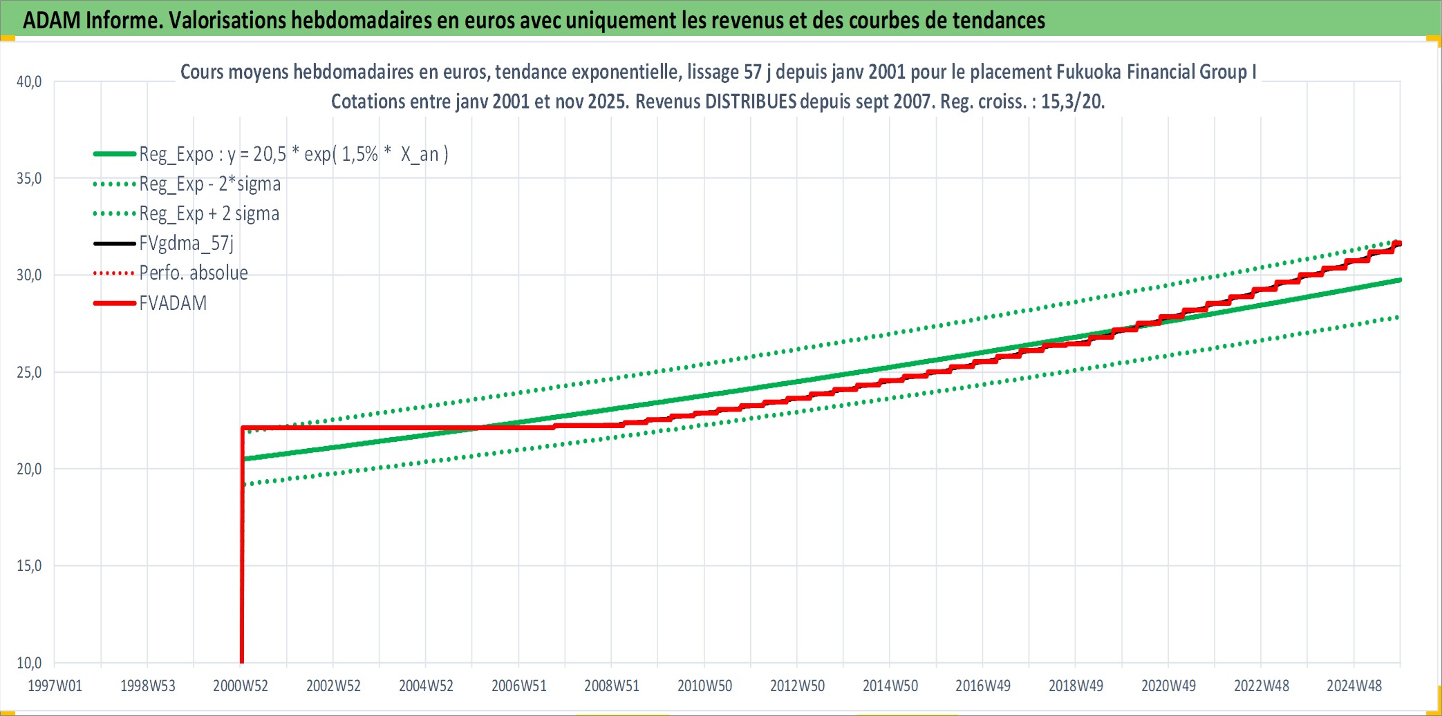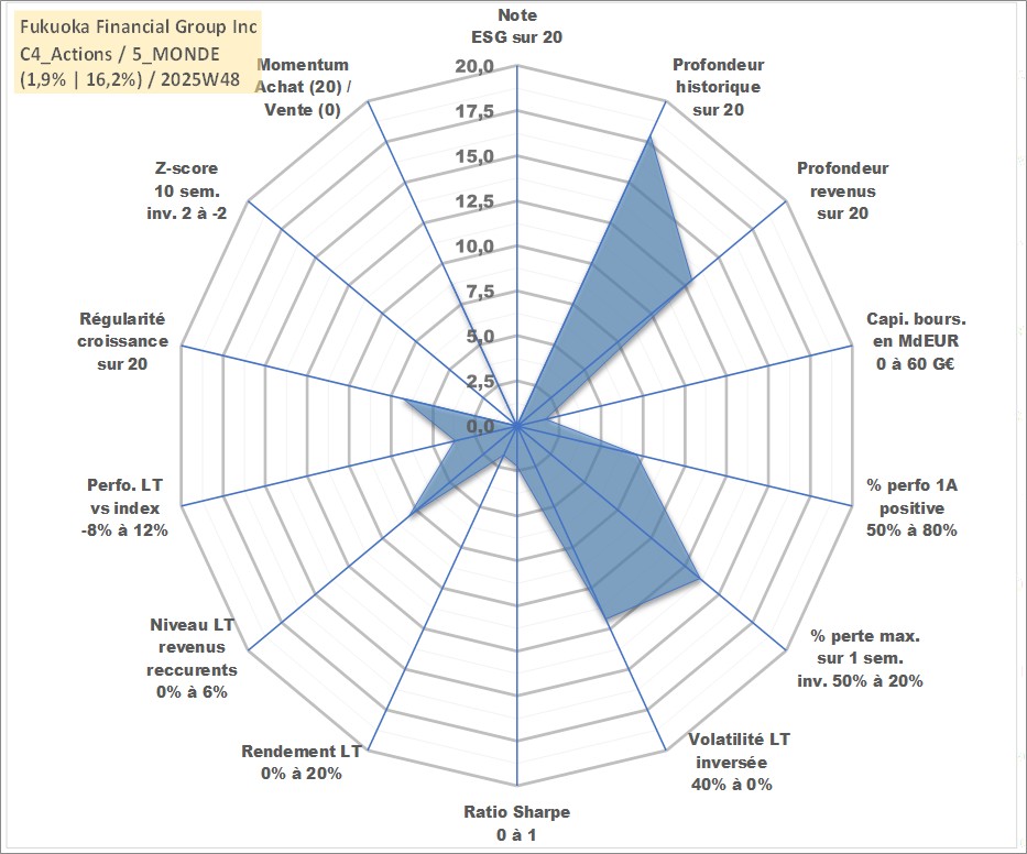 Site dédié aux investisseursPage dédiée sur site financeAnalyse des valorisations hebdomadaires de l'action Fukuoka Financial Group Inc. Cet actif est cote en JPY. Les valorisations sont en contrevaleur EURO et couvrent les semaines 2001W02 a 2025W48. Les revenus de cet actif financier sont pris en compte depuis la semaine 2007W39. La note ESG de cet actif n'est pas connue.
