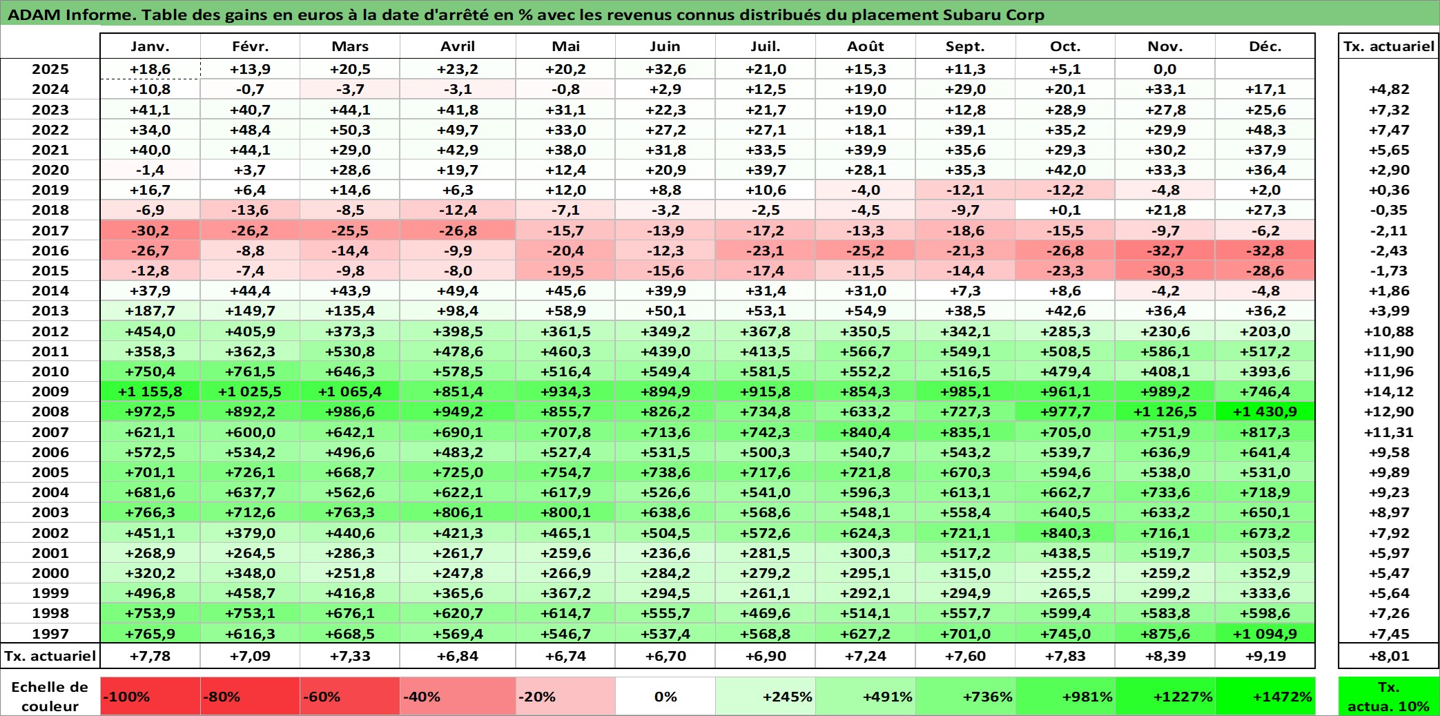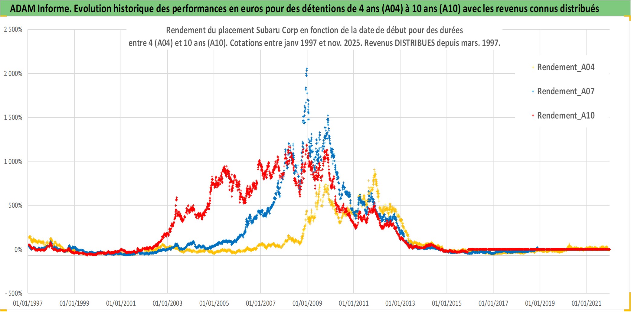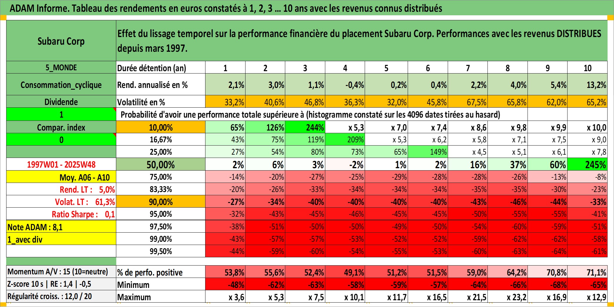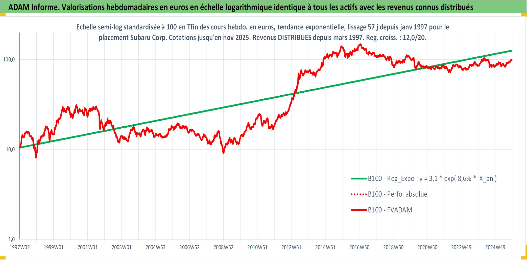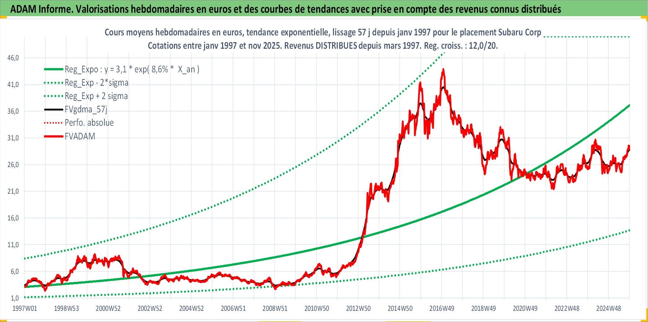 Site dédié aux investisseursPage dédiée sur site financeAnalyse des valorisations hebdomadaires de l'action Subaru Corp. Cet actif est cote en JPY. Les valorisations sont en contrevaleur EURO et couvrent les semaines 1997W01 a 2025W48. Les revenus de cet actif financier sont pris en compte depuis la semaine 1997W13. La note globale ESG de cet actif est estimee a 7.0 (apres rebasage entre 0 et 20).