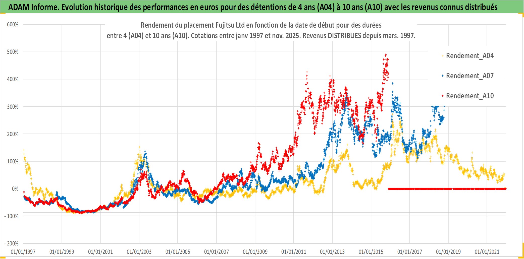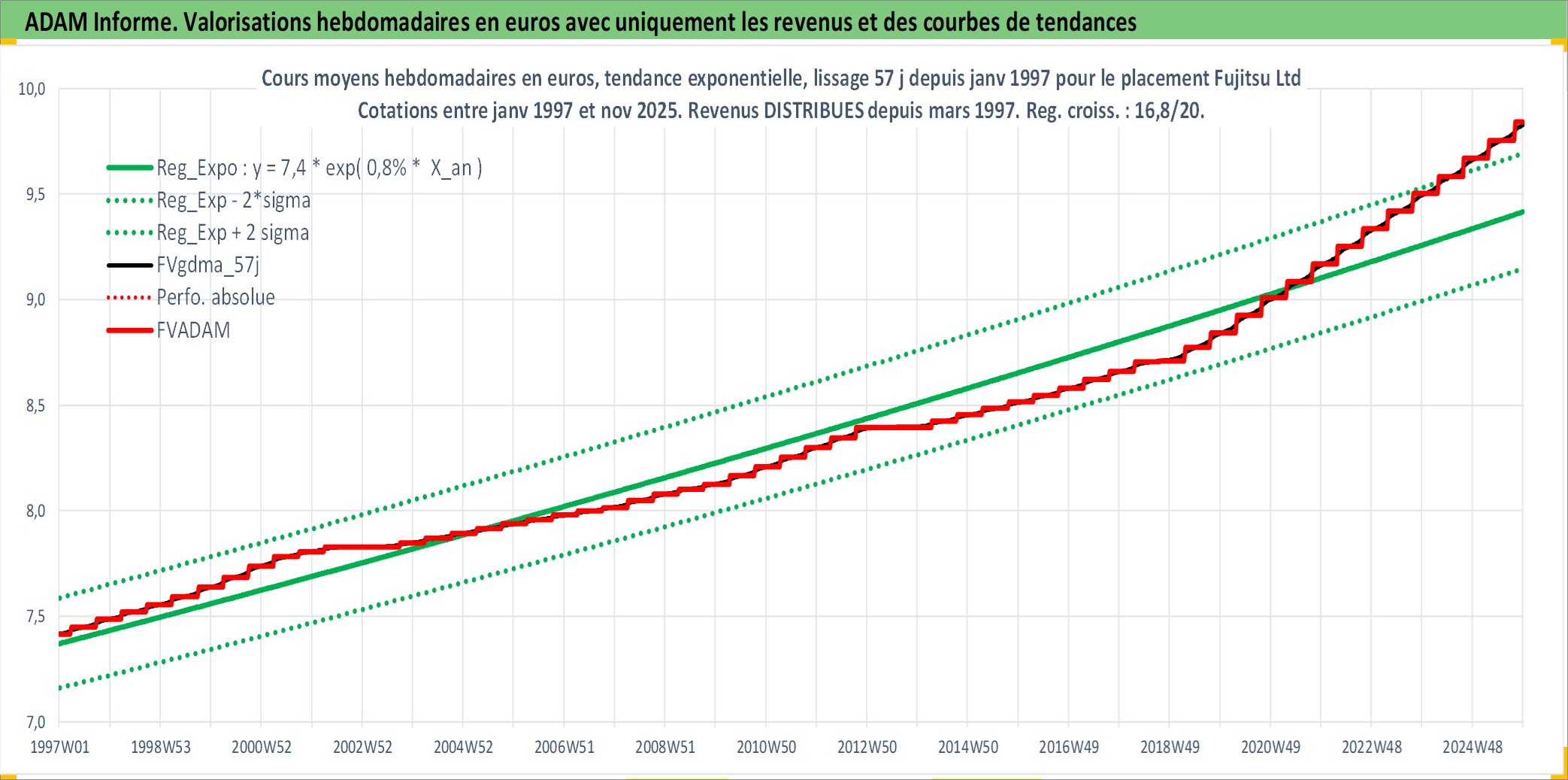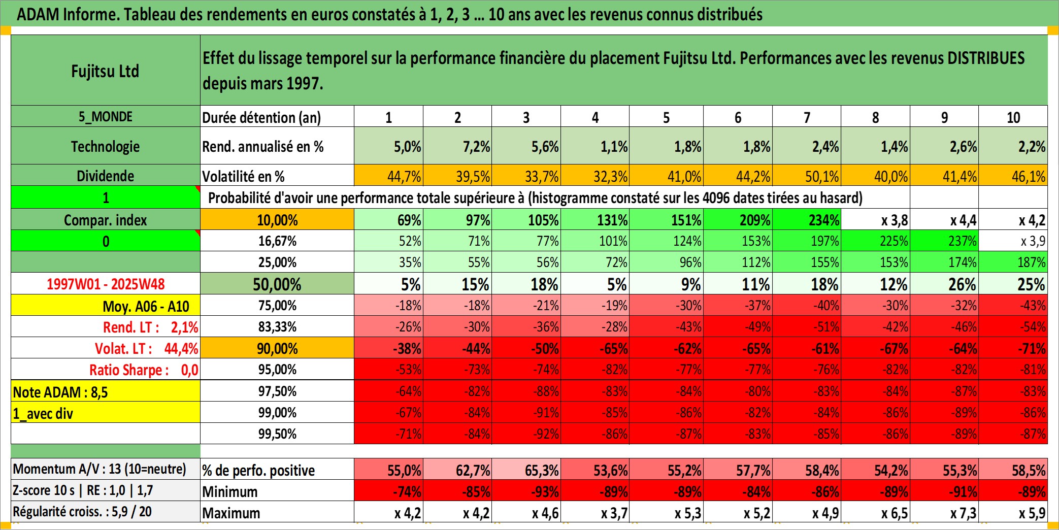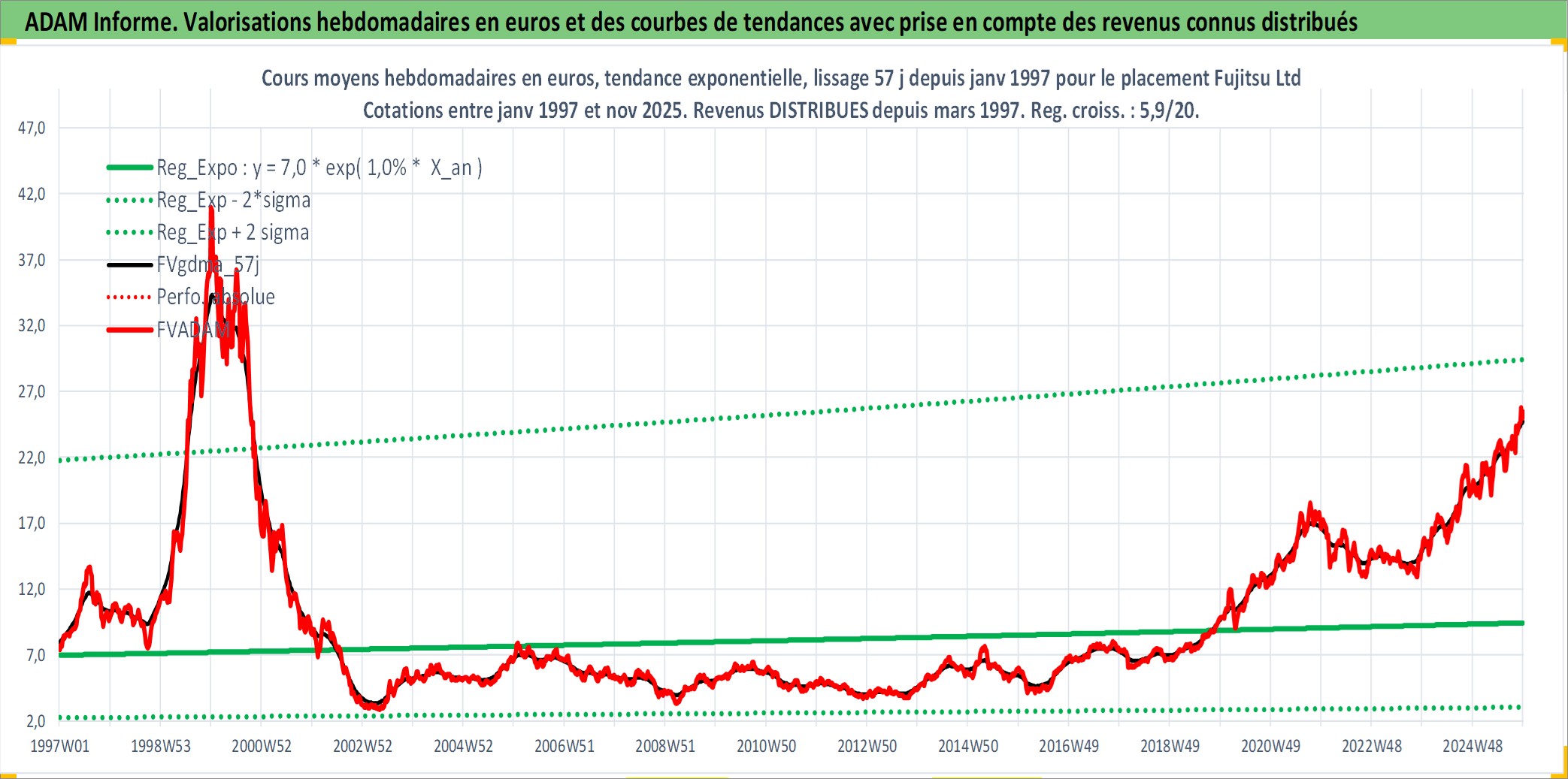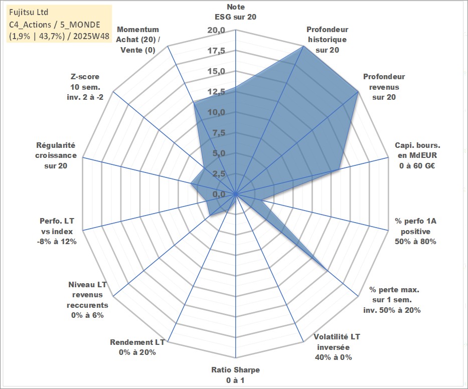 Site dédié aux investisseursPage dédiée sur site financeAnalyse des valorisations hebdomadaires de l'action Fujitsu Ltd. Cet actif est cote en JPY. Les valorisations sont en contrevaleur EURO et couvrent les semaines 1997W01 a 2025W48. Les revenus de cet actif financier sont pris en compte depuis la semaine 1997W13. La note globale ESG de cet actif est estimee a 13.0 (apres rebasage entre 0 et 20).