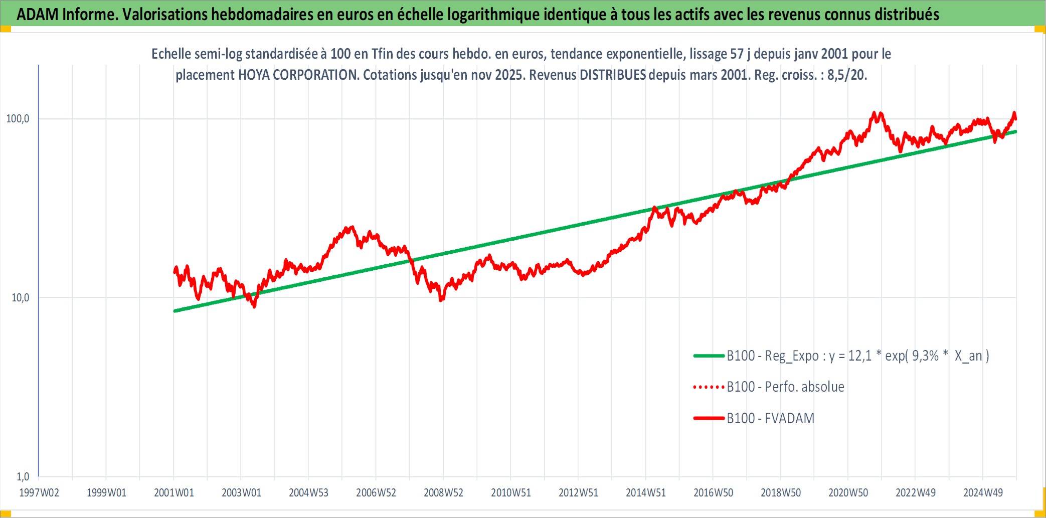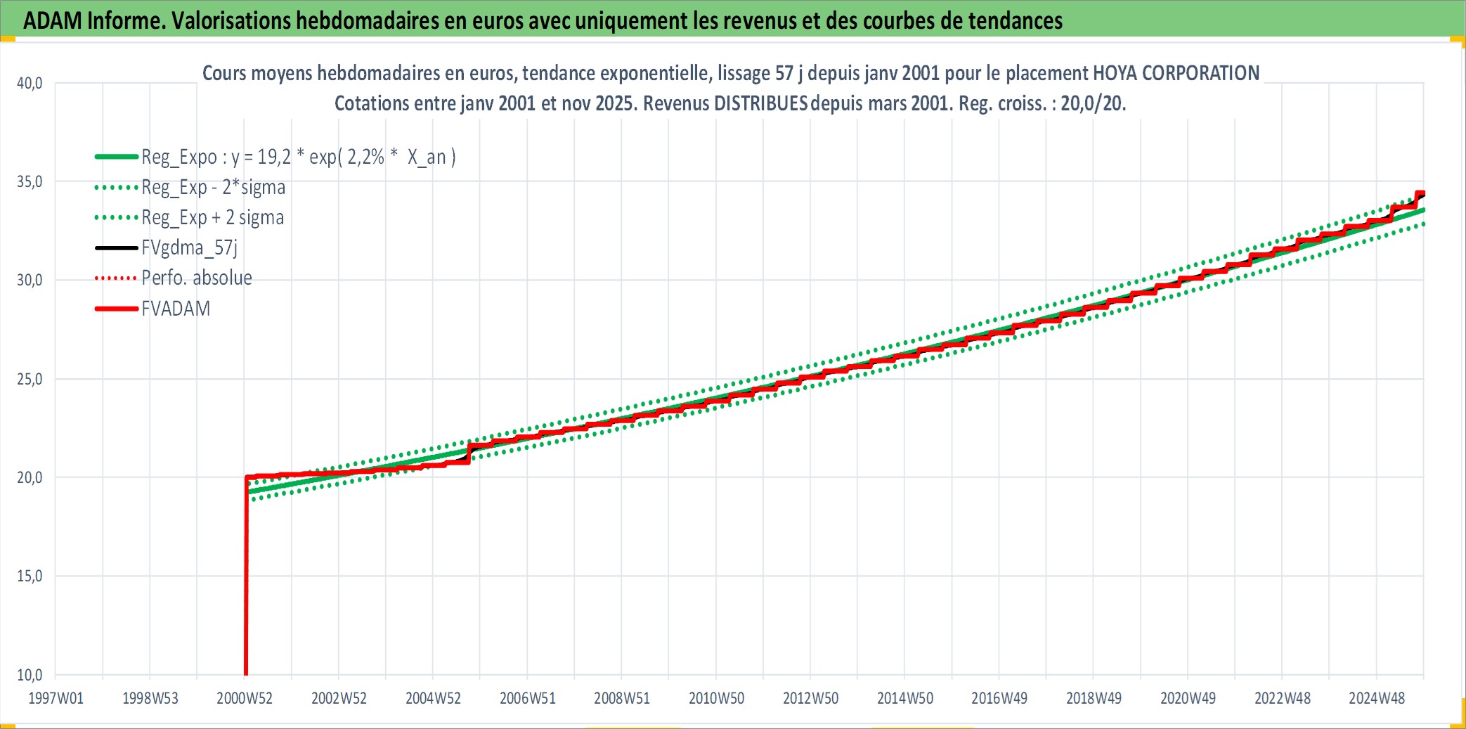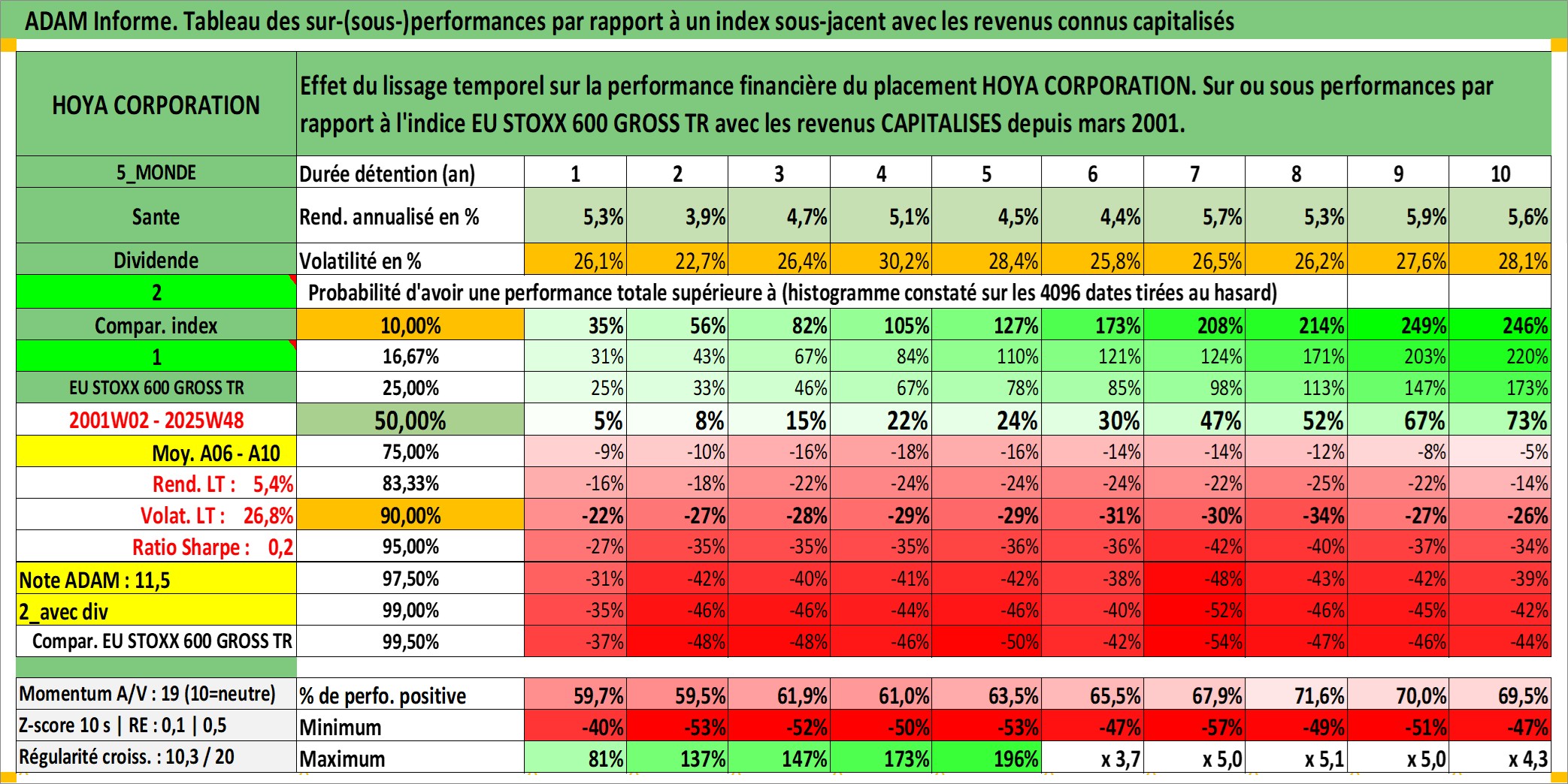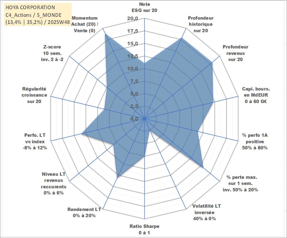 Site dédié aux investisseursPage dédiée sur site financeAnalyse des valorisations hebdomadaires de l'action HOYA CORPORATION. Cet actif est cote en JPY. Les valorisations sont en contrevaleur EURO et couvrent les semaines 2001W02 a 2025W48. Les revenus de cet actif financier sont pris en compte depuis la semaine 2001W13. La note globale ESG de cet actif est estimee a 11.0 (apres rebasage entre 0 et 20).