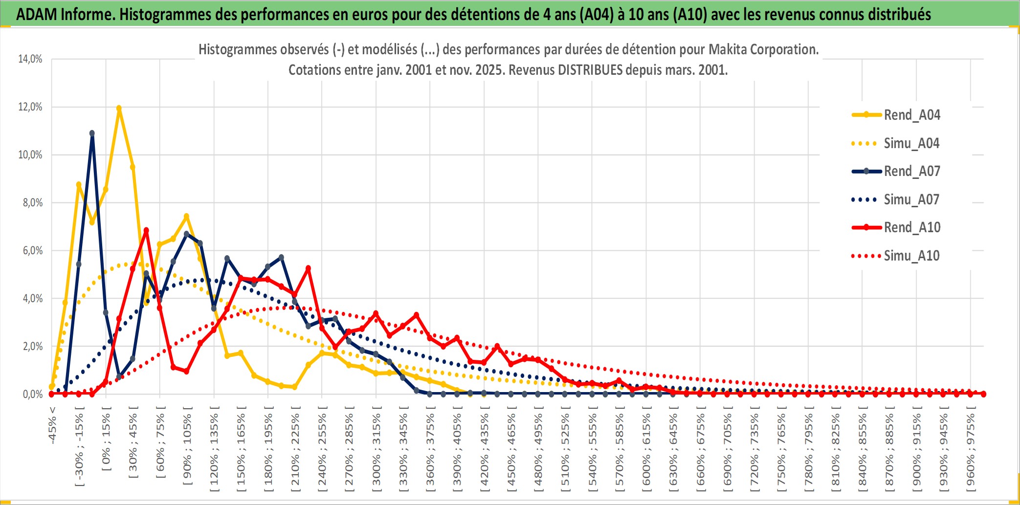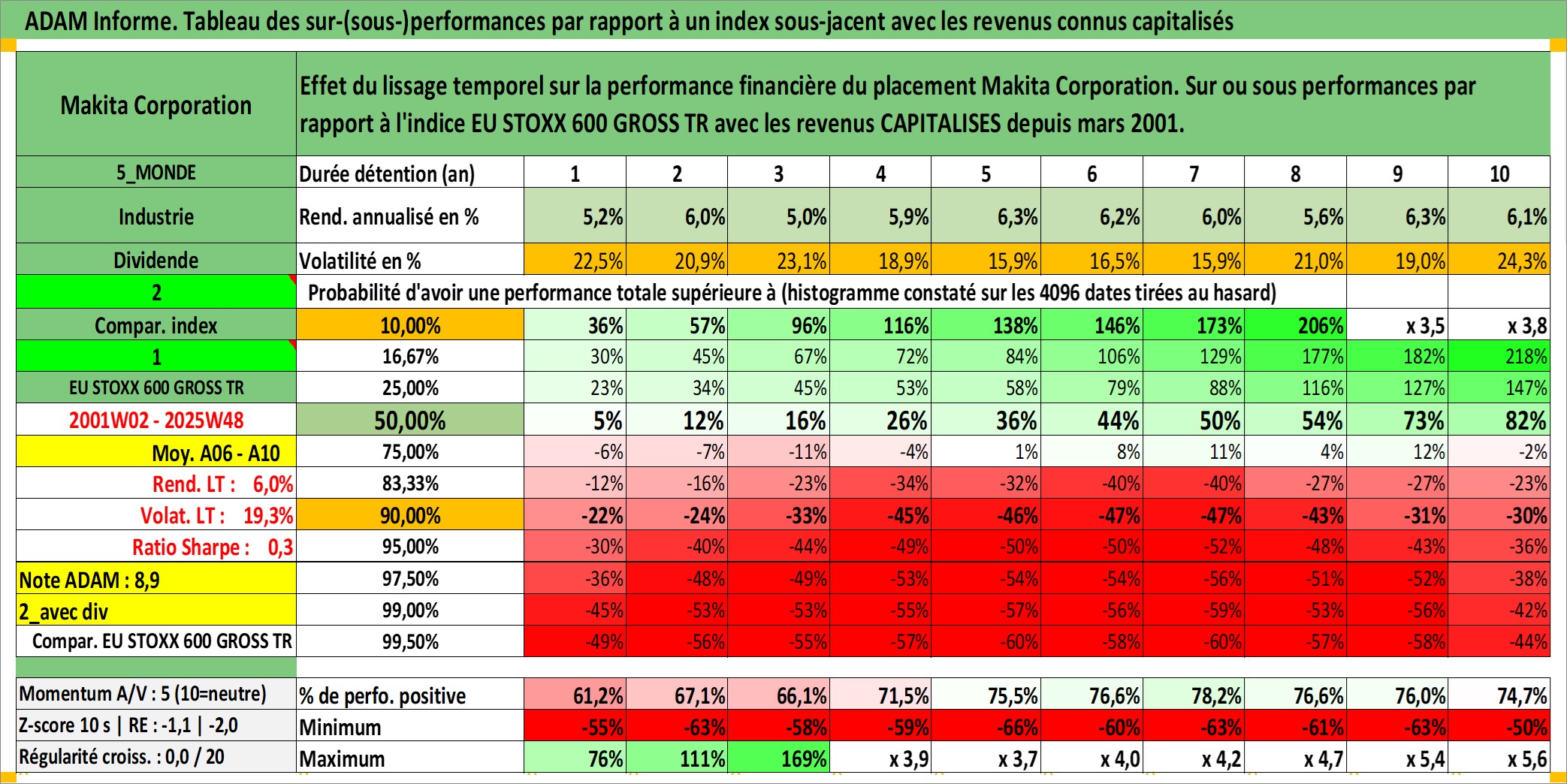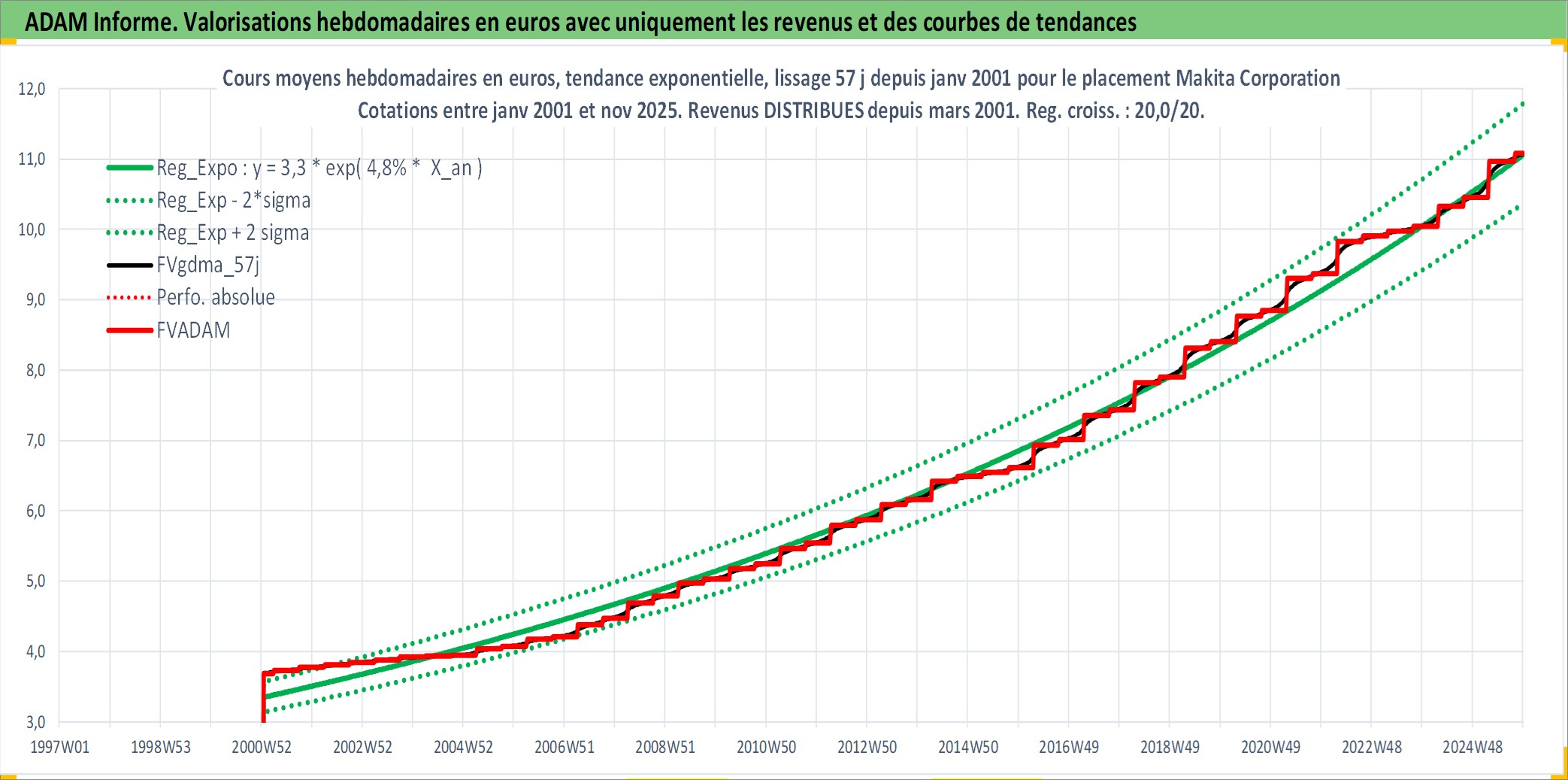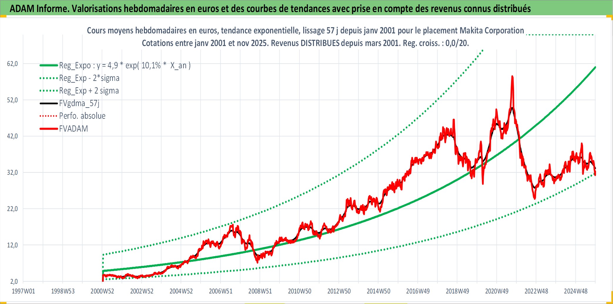 Site dédié aux investisseursPage dédiée sur site financeAnalyse des valorisations hebdomadaires de l'action Makita Corporation. Cet actif est cote en JPY. Les valorisations sont en contrevaleur EURO et couvrent les semaines 2001W02 a 2025W48. Les revenus de cet actif financier sont pris en compte depuis la semaine 2001W13. La note globale ESG de cet actif est estimee a 7.0 (apres rebasage entre 0 et 20).