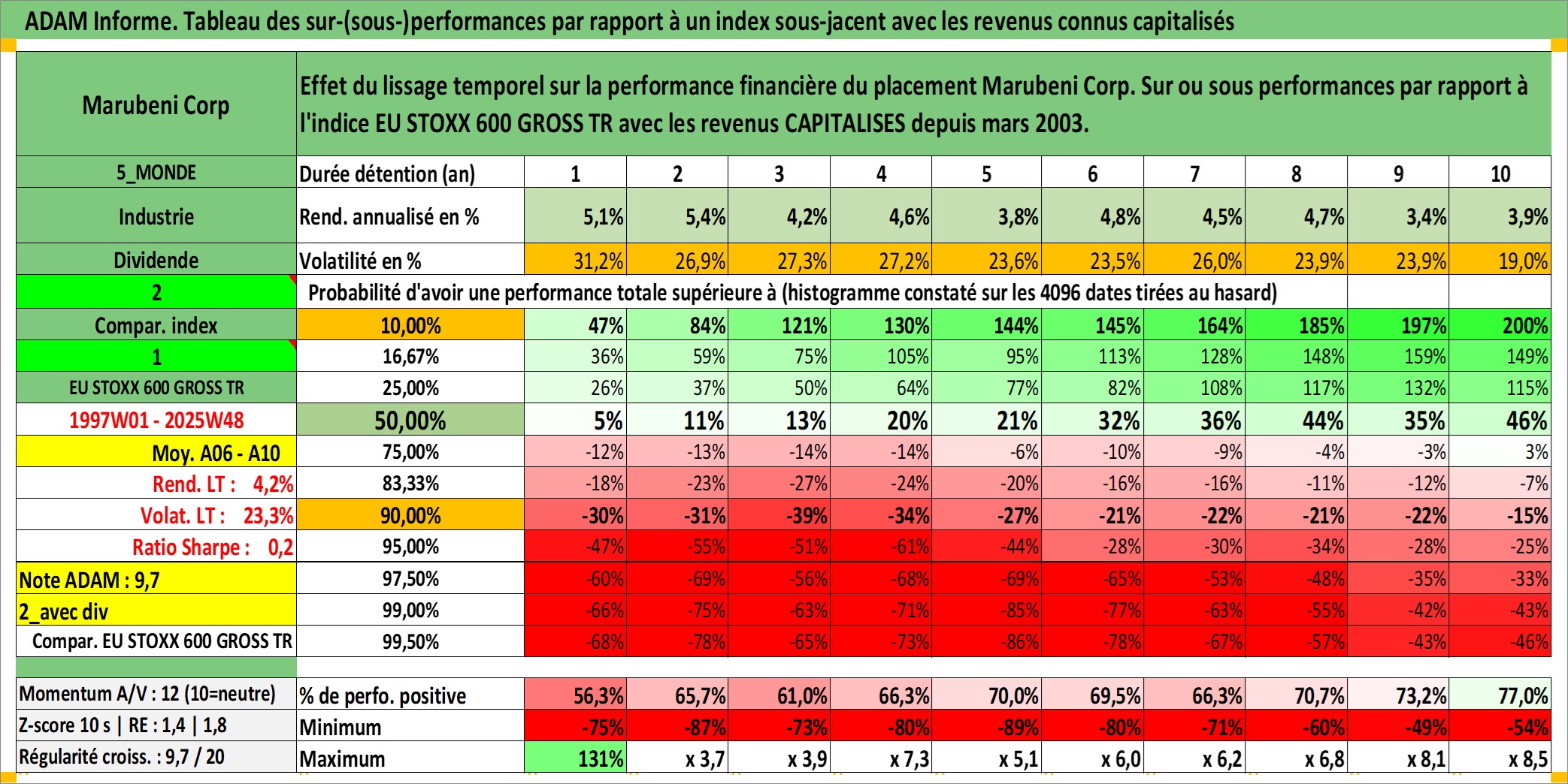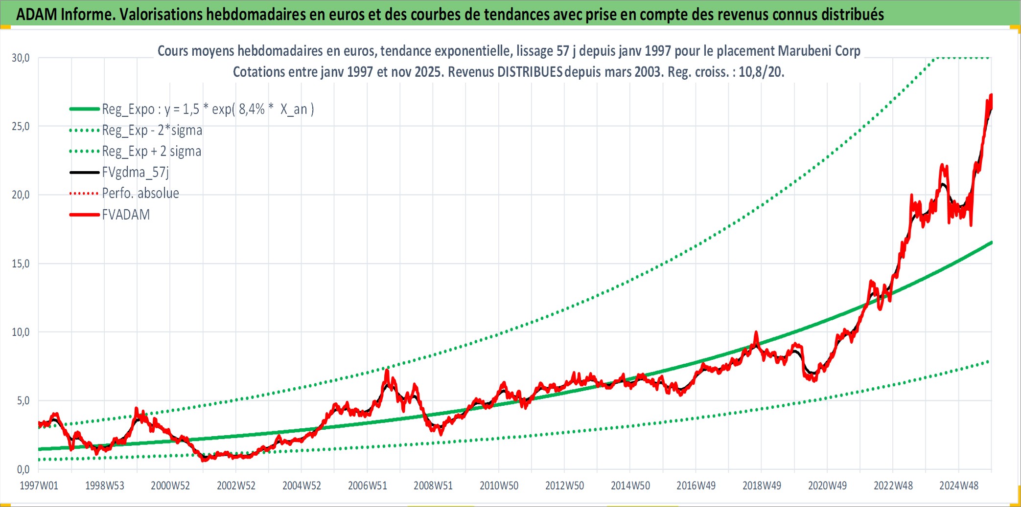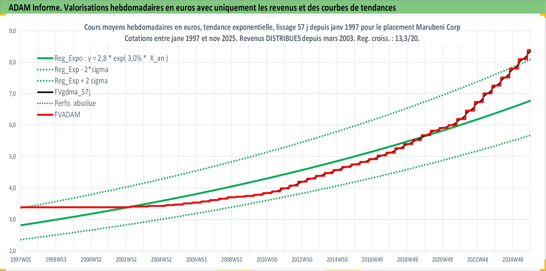 Site dédié aux investisseursPage dédiée sur site financeAnalyse des valorisations hebdomadaires de l'action Marubeni Corp. Cet actif est cote en JPY. Les valorisations sont en contrevaleur EURO et couvrent les semaines 1997W01 a 2025W48. Les revenus de cet actif financier sont pris en compte depuis la semaine 2003W13. La note globale ESG de cet actif est estimee a 7.0 (apres rebasage entre 0 et 20).