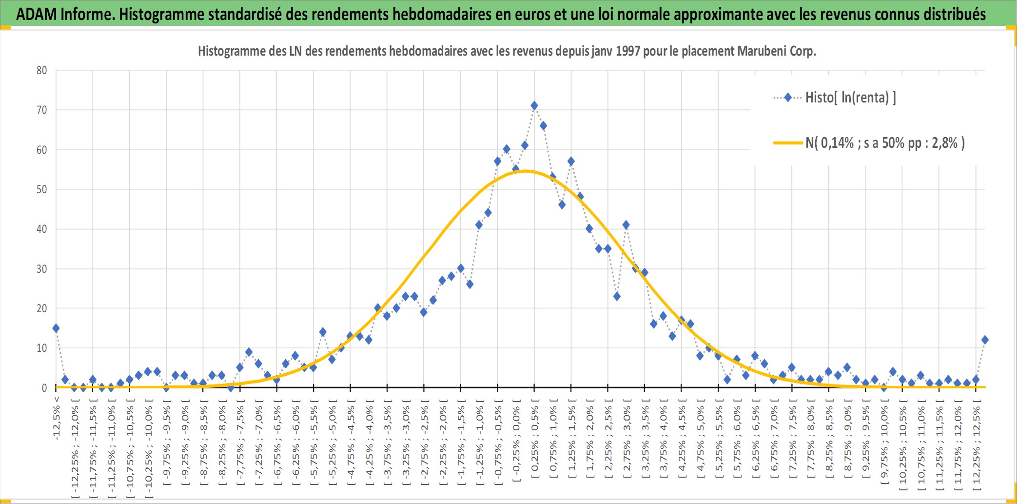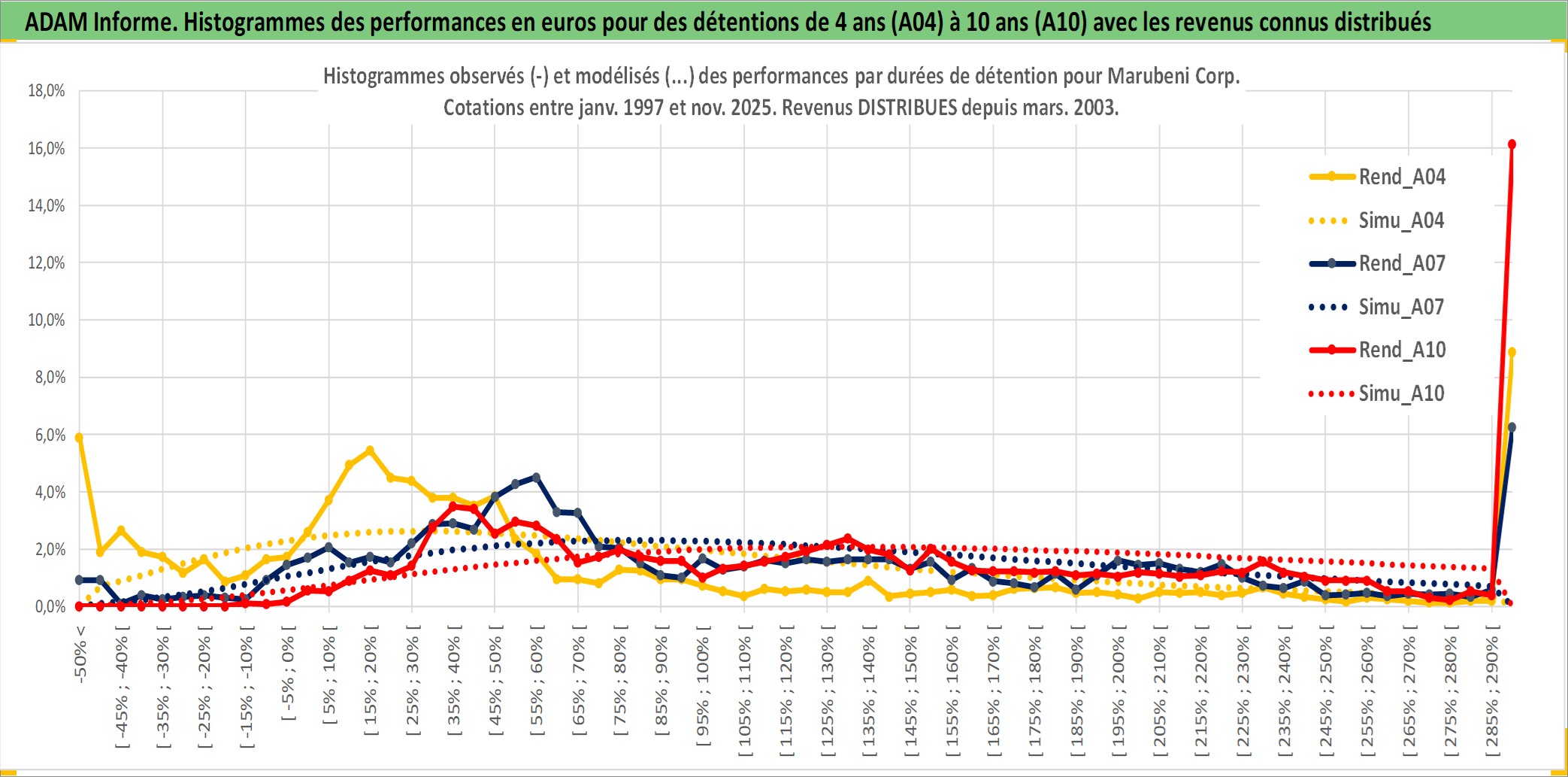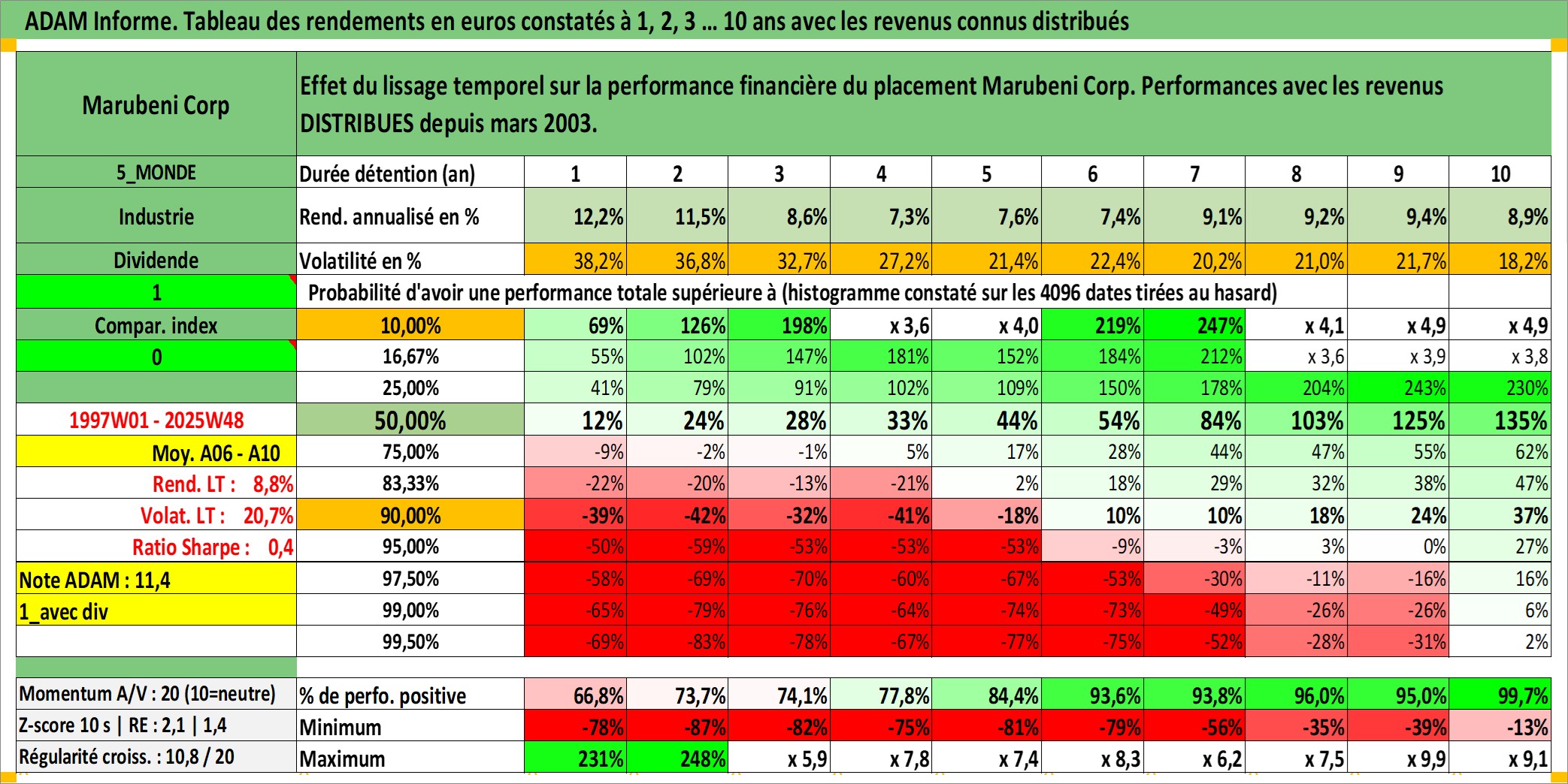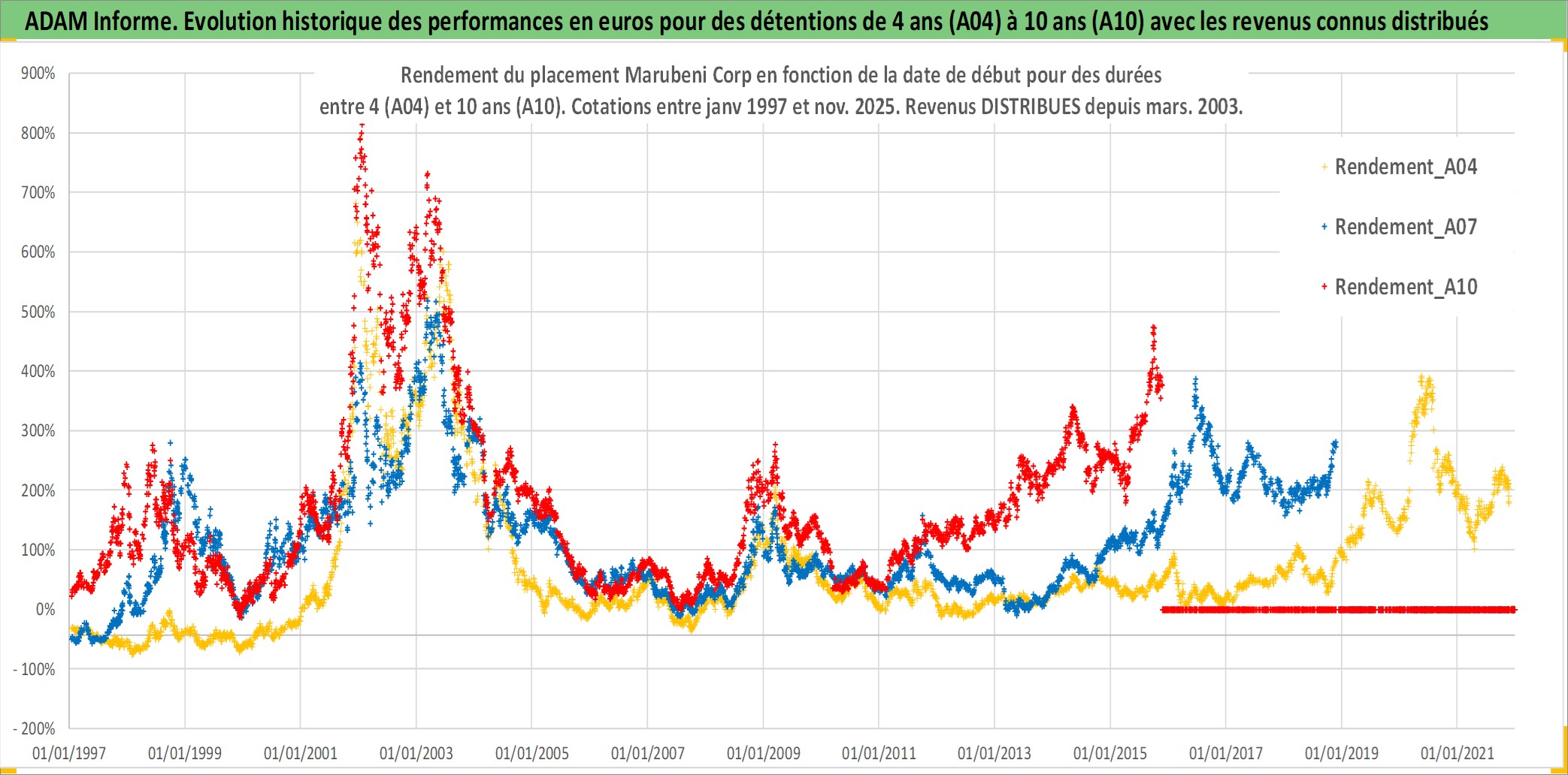 Site dédié aux investisseursPage dédiée sur site financeAnalyse des valorisations hebdomadaires de l'action Marubeni Corp. Cet actif est cote en JPY. Les valorisations sont en contrevaleur EURO et couvrent les semaines 1997W01 a 2025W48. Les revenus de cet actif financier sont pris en compte depuis la semaine 2003W13. La note globale ESG de cet actif est estimee a 7.0 (apres rebasage entre 0 et 20).