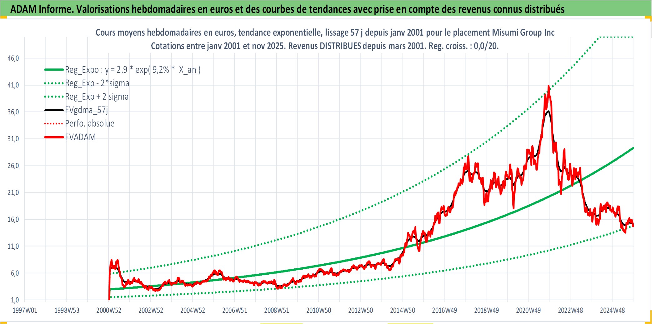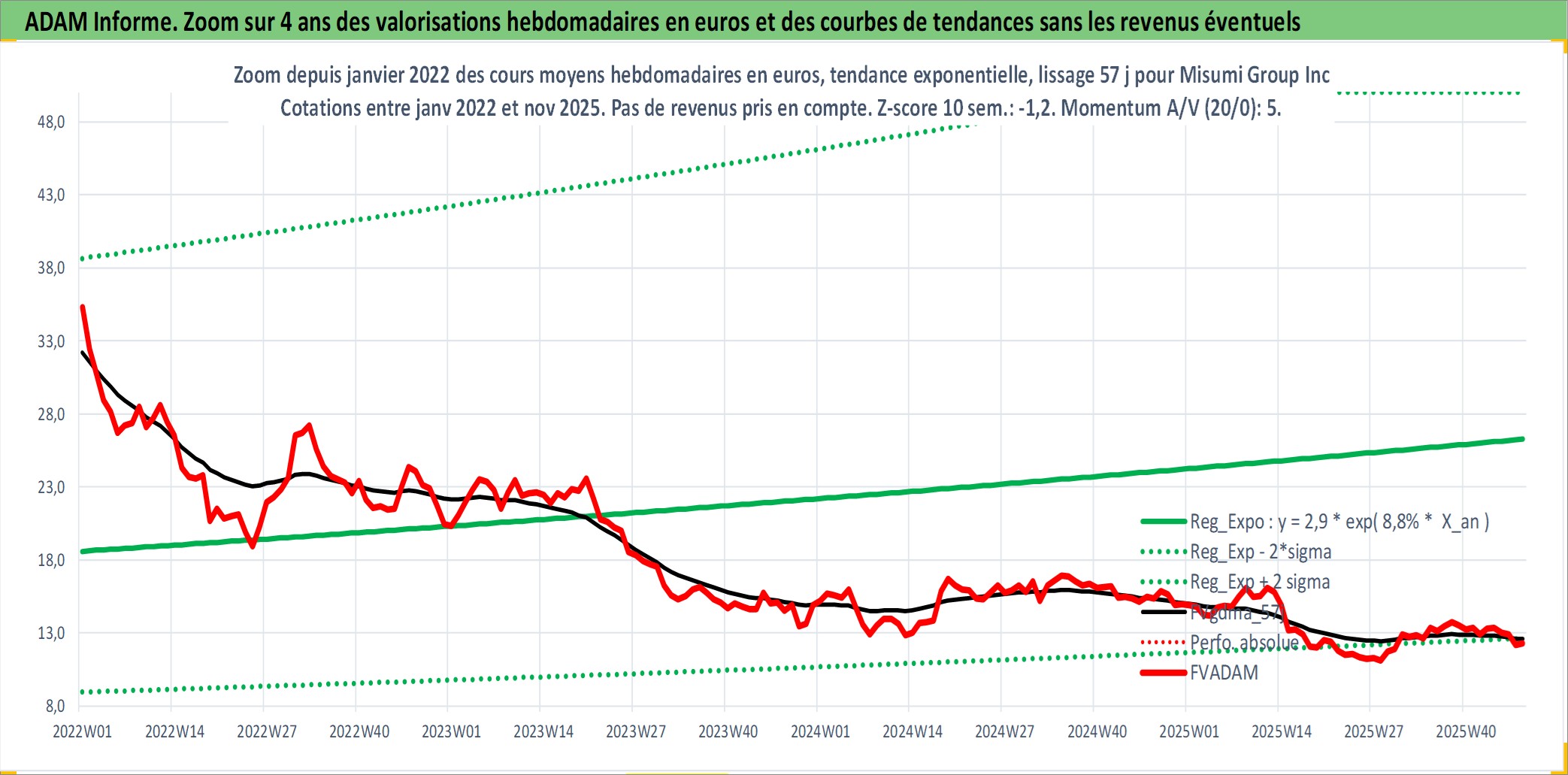 Site dédié aux investisseursPage dédiée sur site financeAnalyse des valorisations hebdomadaires de l'action Misumi Group Inc. Cet actif est cote en JPY. Les valorisations sont en contrevaleur EURO et couvrent les semaines 2001W02 a 2025W48. Les revenus de cet actif financier sont pris en compte depuis la semaine 2001W13. La note ESG de cet actif n'est pas connue.