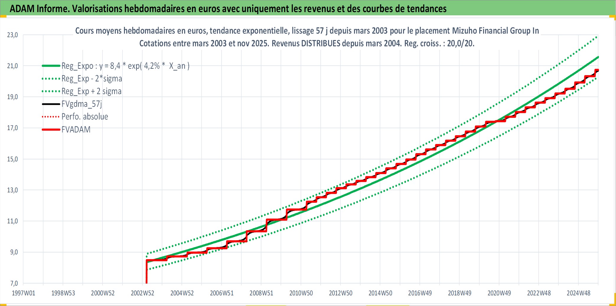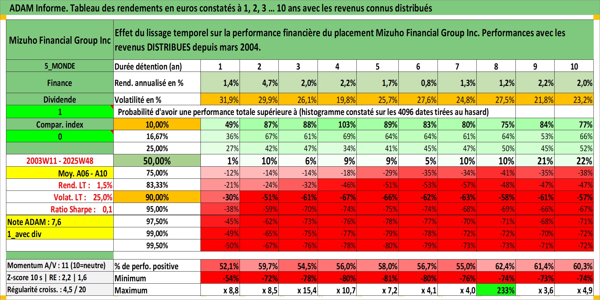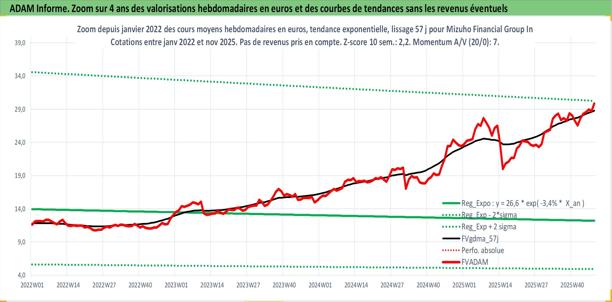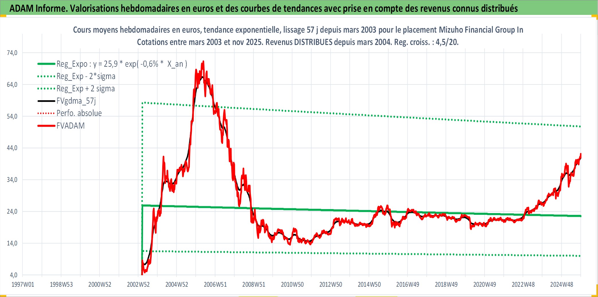 Site dédié aux investisseursPage dédiée sur site financeAnalyse des valorisations hebdomadaires de l'action Mizuho Financial Group Inc. Cet actif est cote en JPY. Les valorisations sont en contrevaleur EURO et couvrent les semaines 2003W11 a 2025W48. Les revenus de cet actif financier sont pris en compte depuis la semaine 2004W13. La note globale ESG de cet actif est estimee a 10.0 (apres rebasage entre 0 et 20).