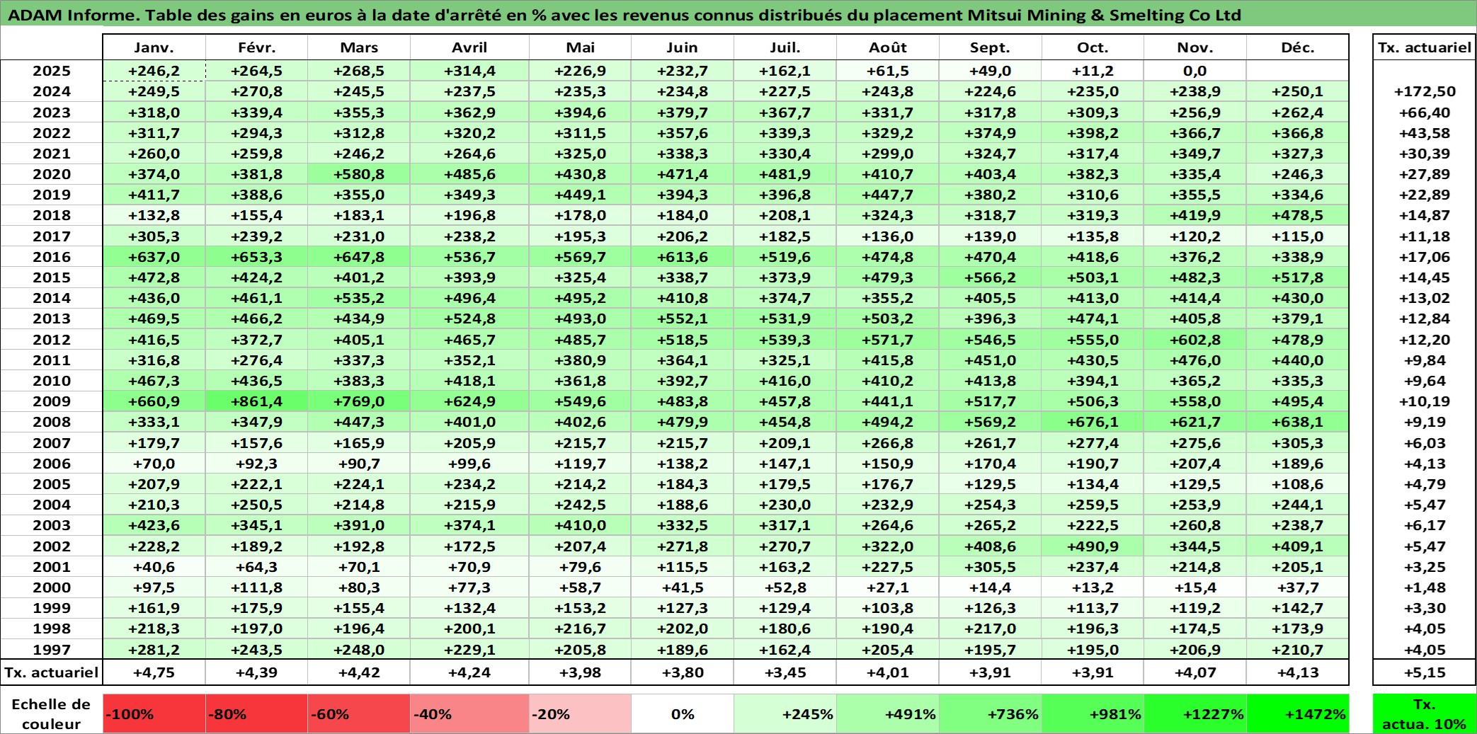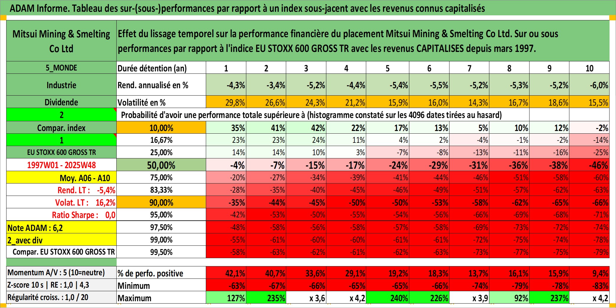Site dédié aux investisseursPage dédiée sur site financeAnalyse des valorisations hebdomadaires de l'action Mitsui Mining & Smelting Co Ltd. Cet actif est cote en JPY. Les valorisations sont en contrevaleur EURO et couvrent les semaines 1997W01 a 2025W48. Les revenus de cet actif financier sont pris en compte depuis la semaine 1997W13. La note ESG de cet actif n'est pas connue.