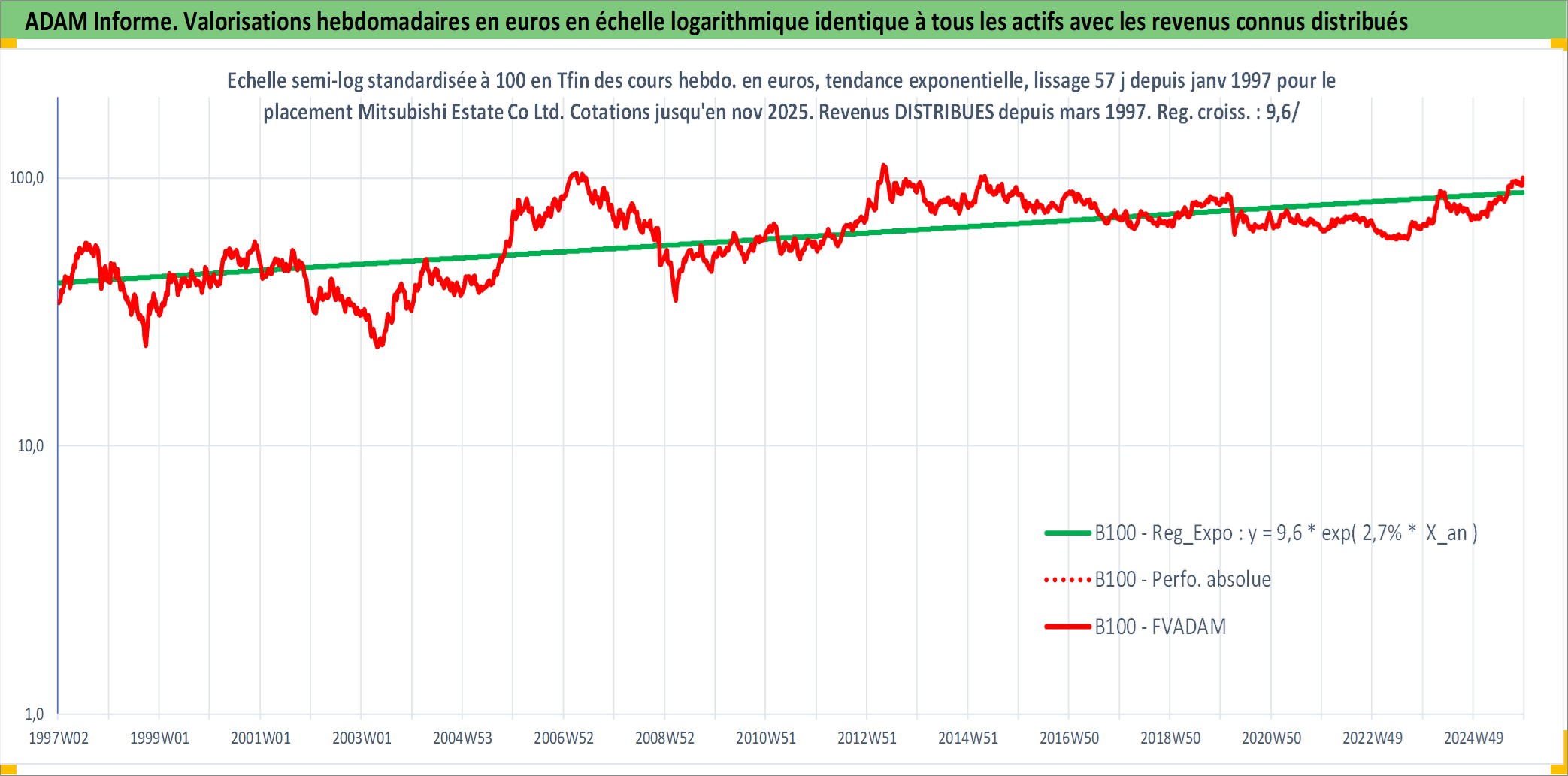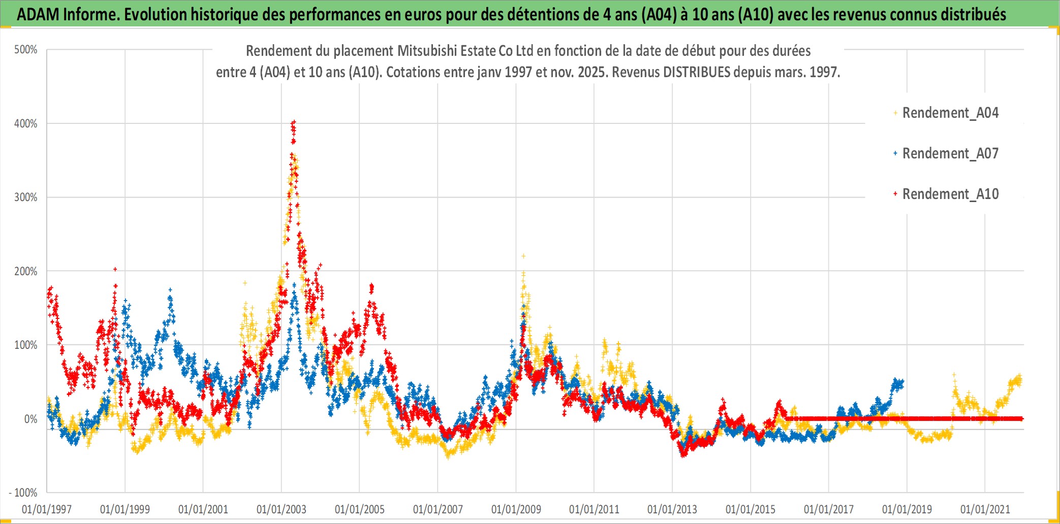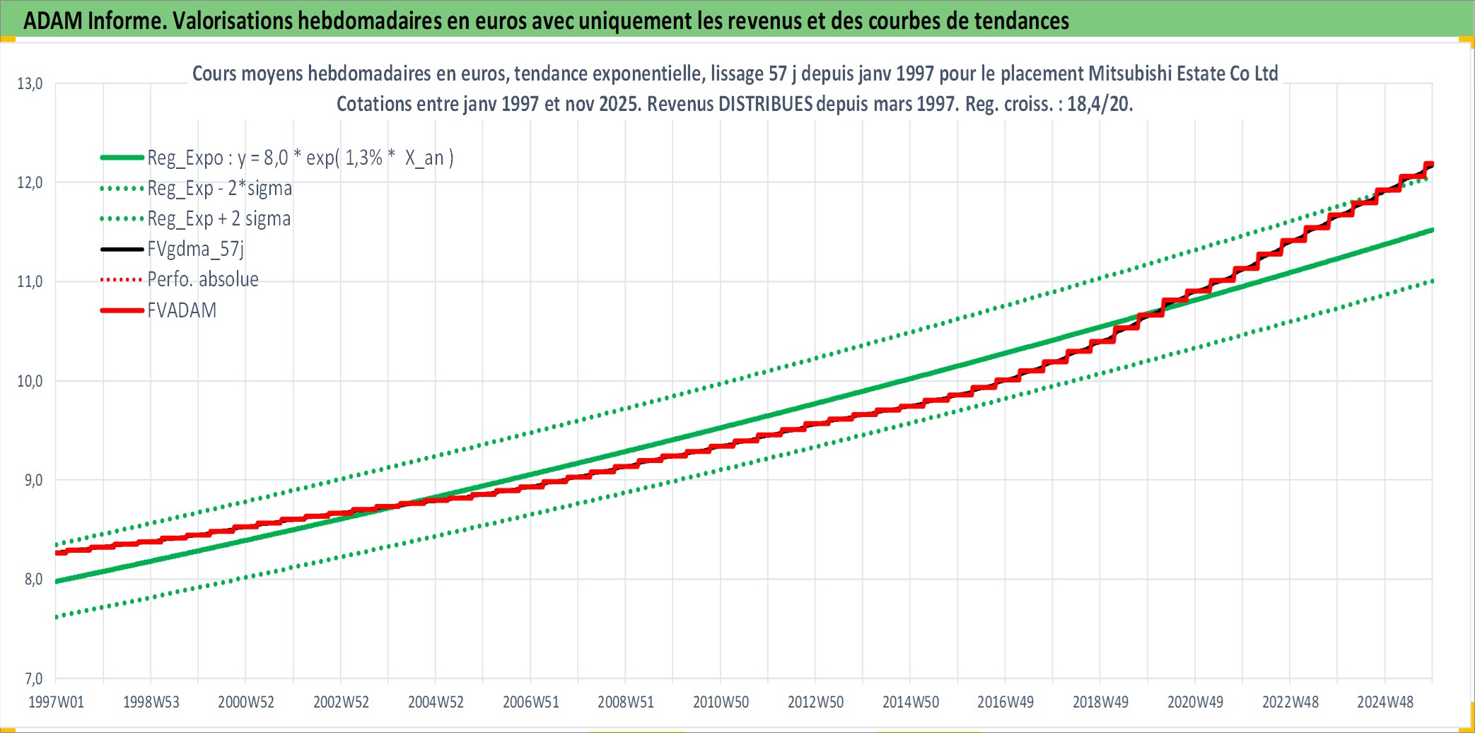 Site dédié aux investisseursPage dédiée sur site financeAnalyse des valorisations hebdomadaires de l'action Mitsubishi Estate Co Ltd. Cet actif est cote en JPY. Les valorisations sont en contrevaleur EURO et couvrent les semaines 1997W01 a 2025W48. Les revenus de cet actif financier sont pris en compte depuis la semaine 1997W13. La note globale ESG de cet actif est estimee a 12.0 (apres rebasage entre 0 et 20).