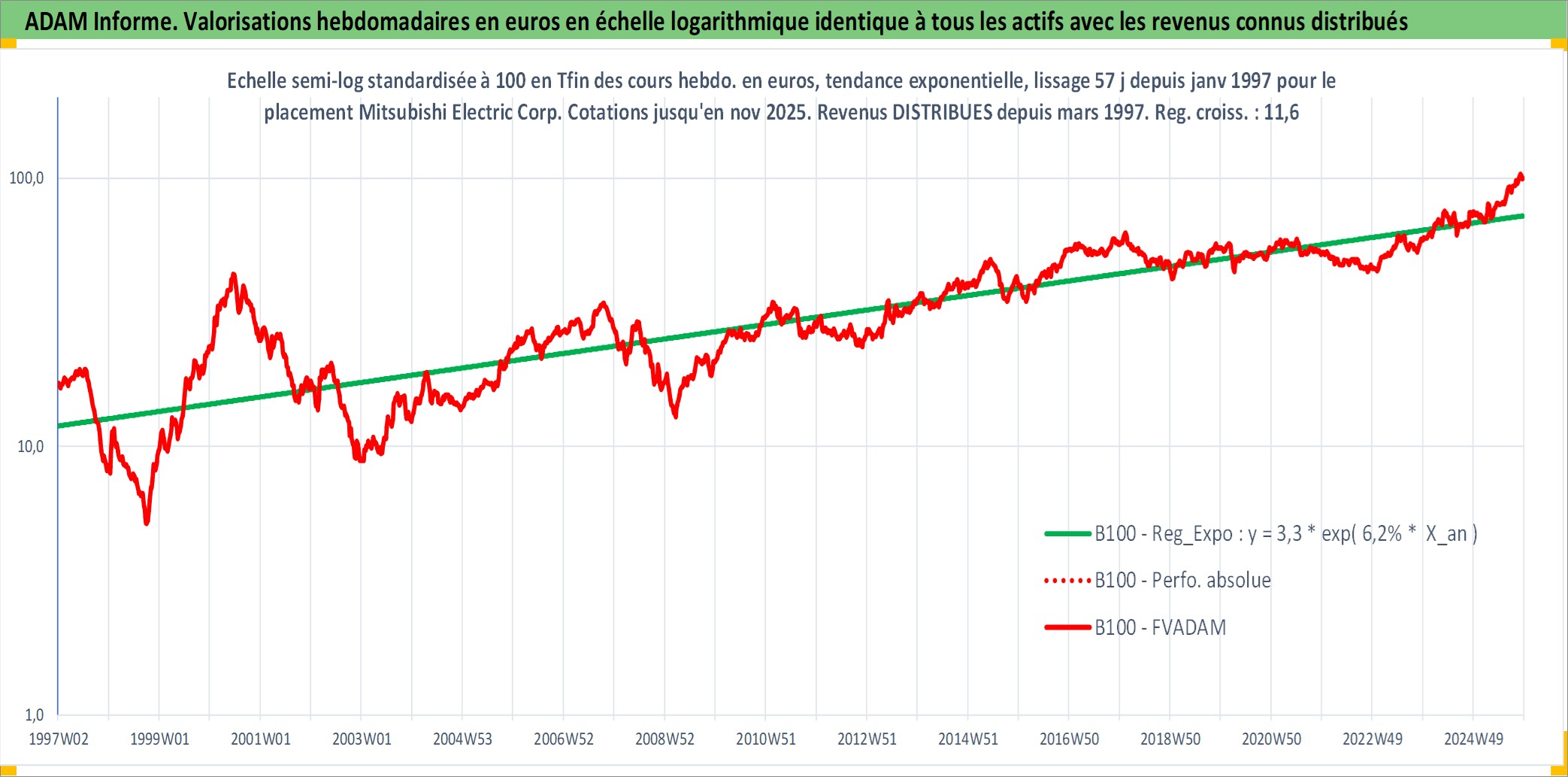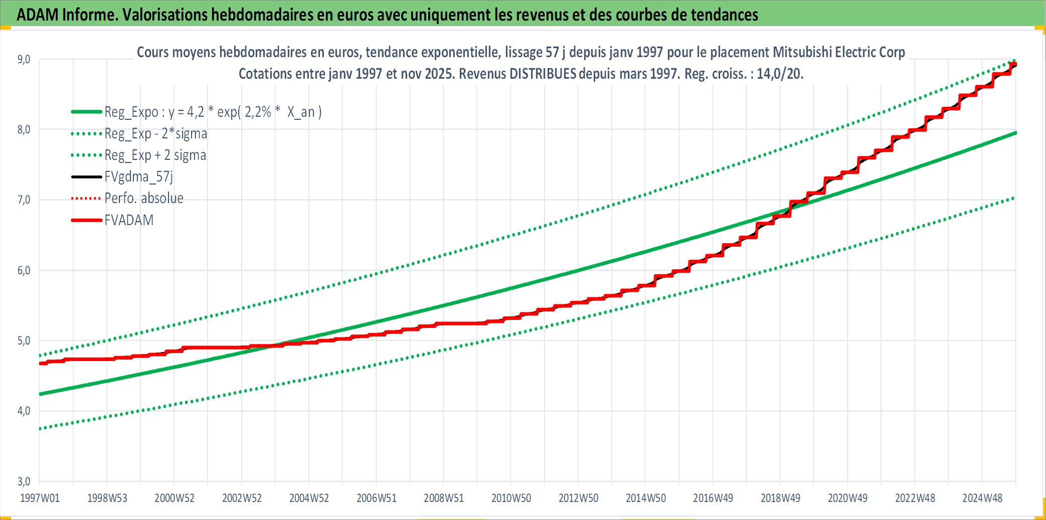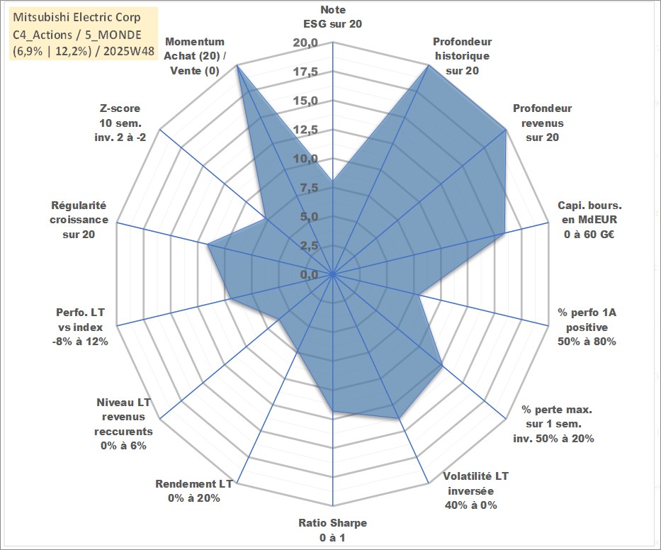 Site dédié aux investisseursPage dédiée sur site financeAnalyse des valorisations hebdomadaires de l'action Mitsubishi Electric Corp. Cet actif est cote en JPY. Les valorisations sont en contrevaleur EURO et couvrent les semaines 1997W01 a 2025W48. Les revenus de cet actif financier sont pris en compte depuis la semaine 1997W13. La note globale ESG de cet actif est estimee a 8.0 (apres rebasage entre 0 et 20).