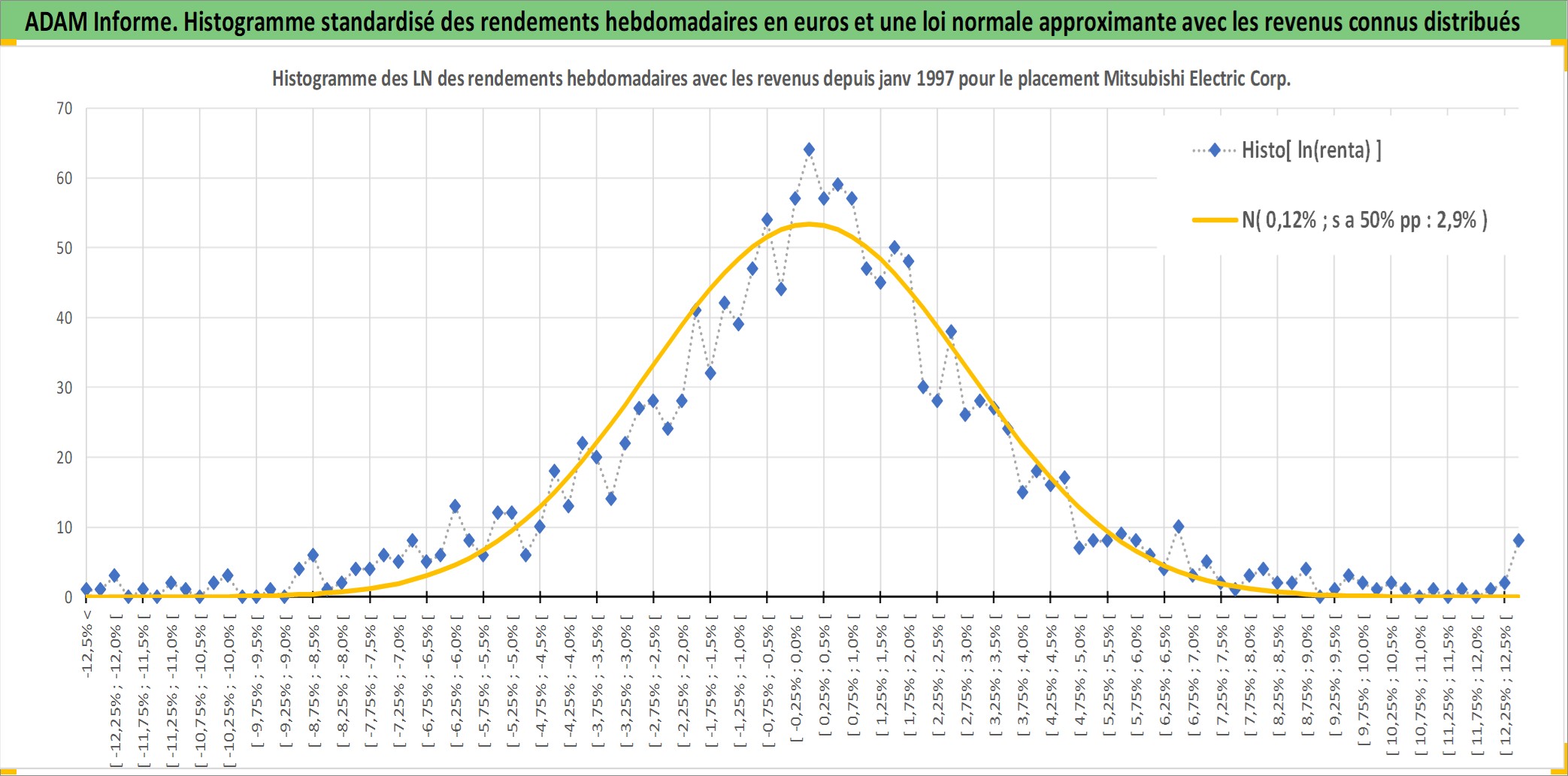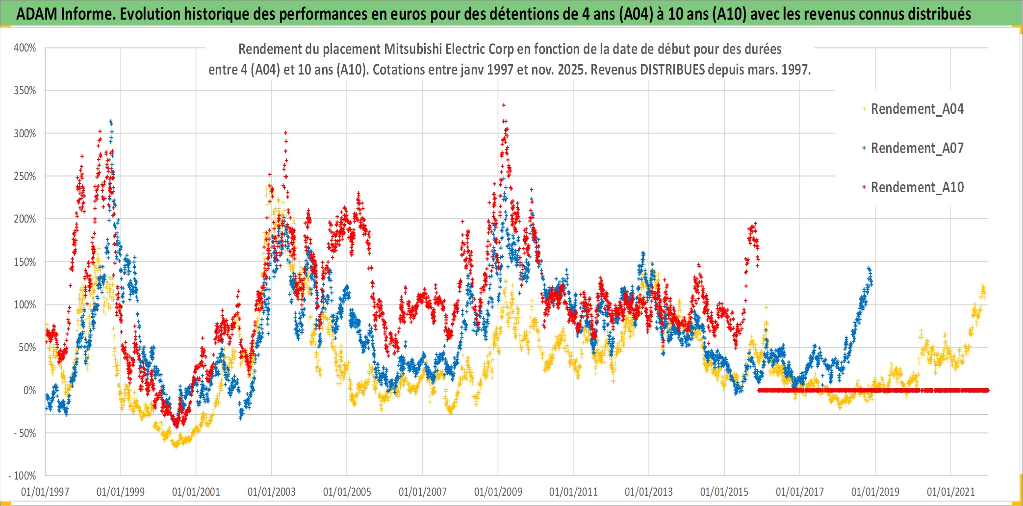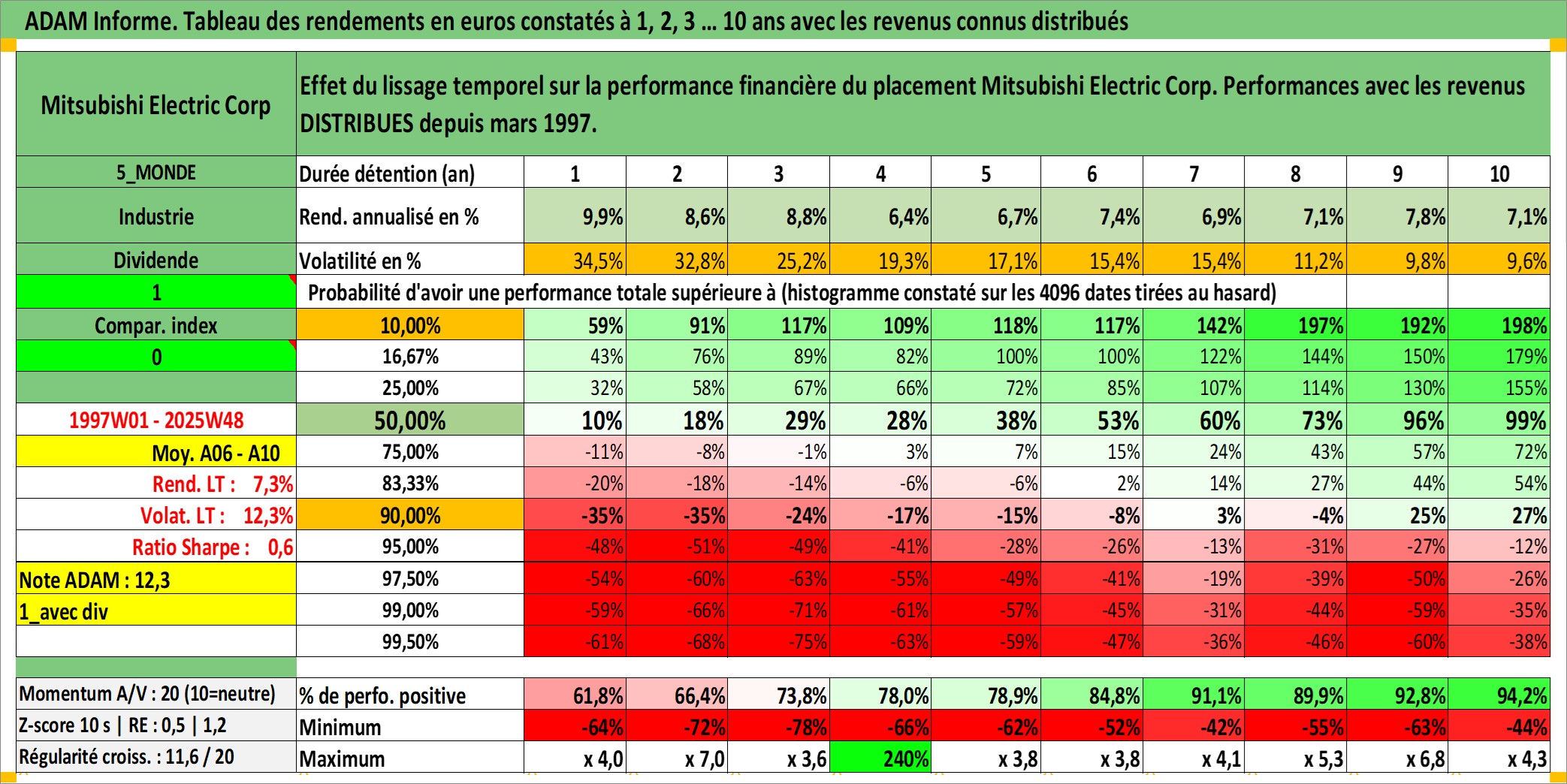 Site dédié aux investisseursPage dédiée sur site financeAnalyse des valorisations hebdomadaires de l'action Mitsubishi Electric Corp. Cet actif est cote en JPY. Les valorisations sont en contrevaleur EURO et couvrent les semaines 1997W01 a 2025W48. Les revenus de cet actif financier sont pris en compte depuis la semaine 1997W13. La note globale ESG de cet actif est estimee a 8.0 (apres rebasage entre 0 et 20).