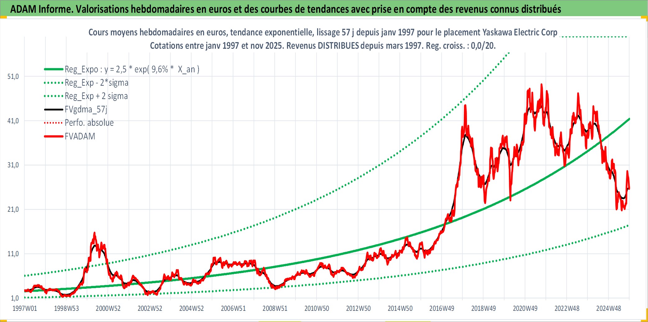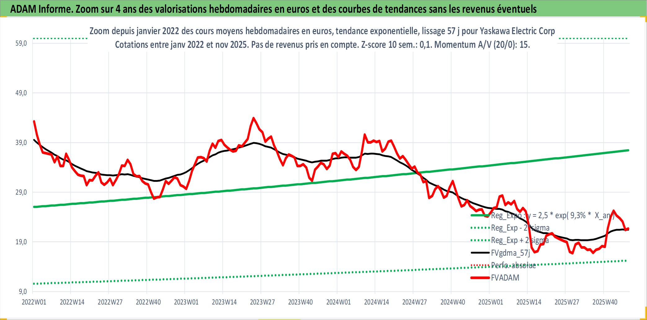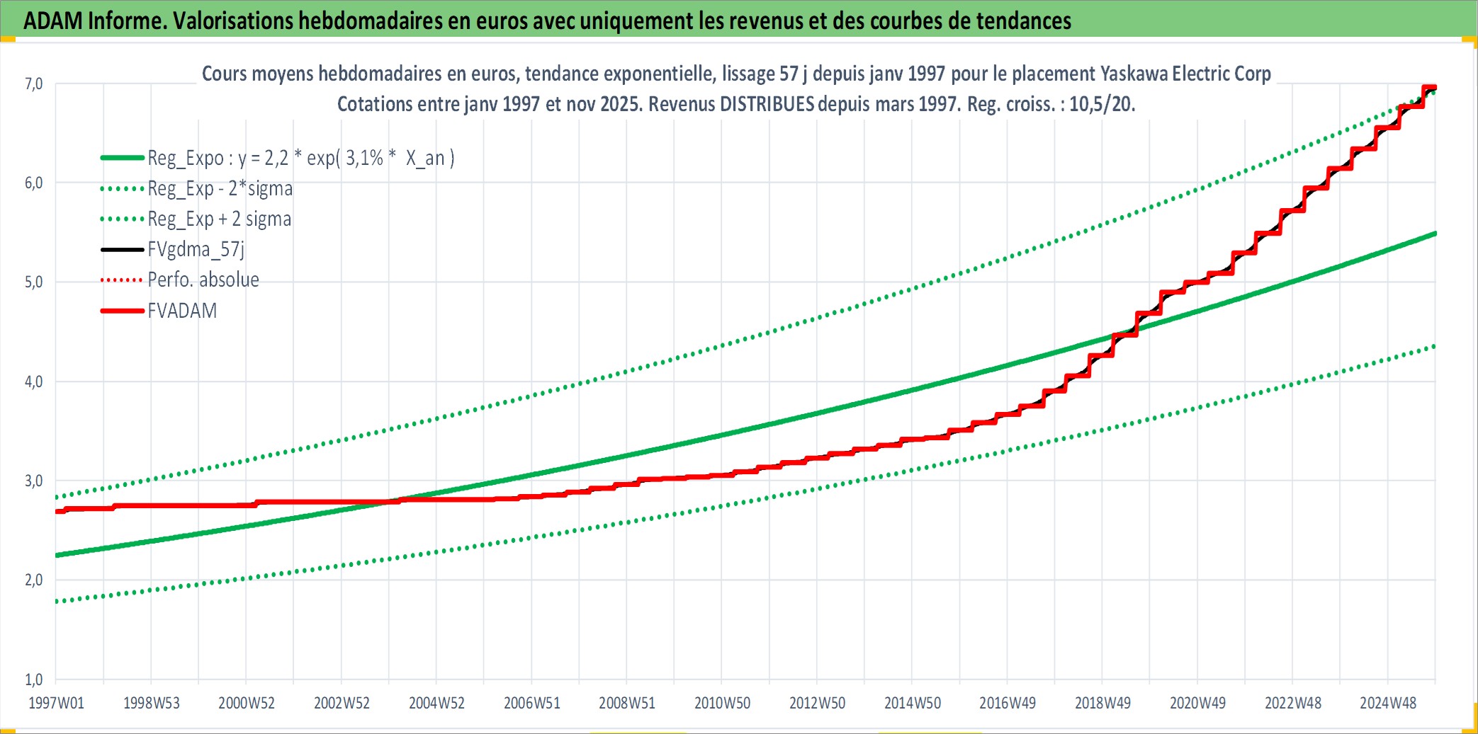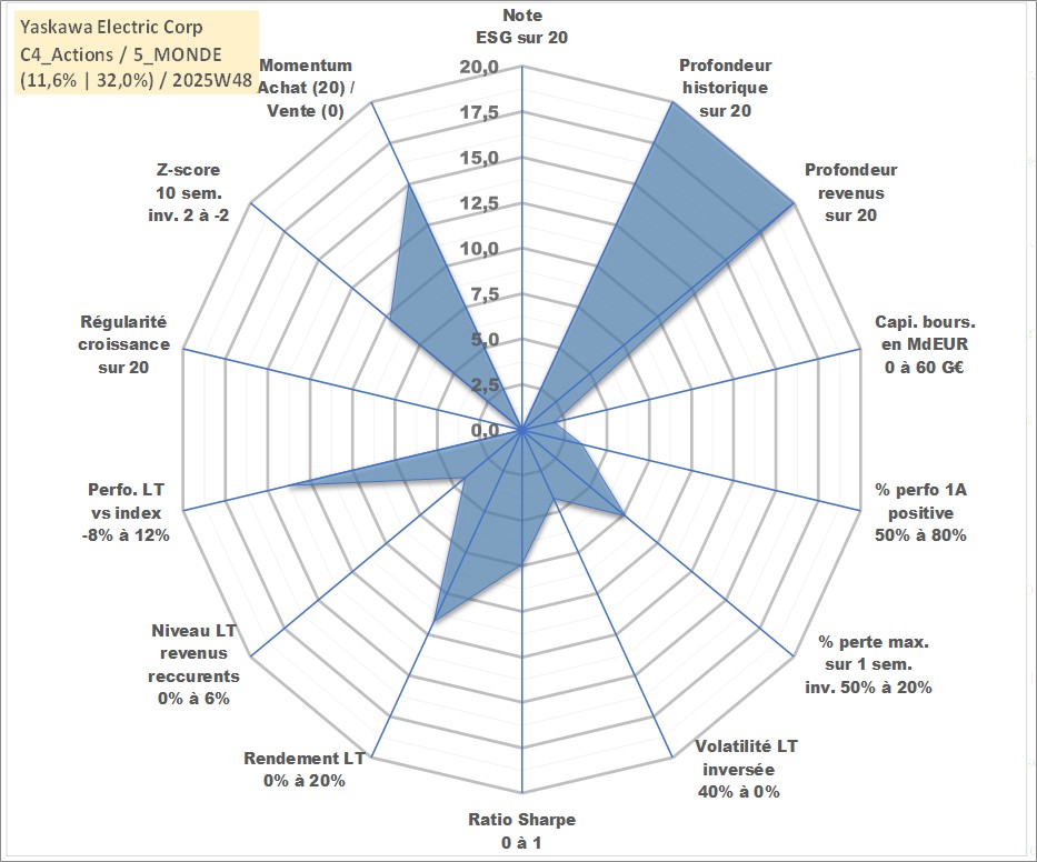Site dédié aux investisseursPage dédiée sur site financeAnalyse des valorisations hebdomadaires de l'action Yaskawa Electric Corp. Cet actif est cote en JPY. Les valorisations sont en contrevaleur EURO et couvrent les semaines 1997W01 a 2025W48. Les revenus de cet actif financier sont pris en compte depuis la semaine 1997W11. La note ESG de cet actif n'est pas connue.