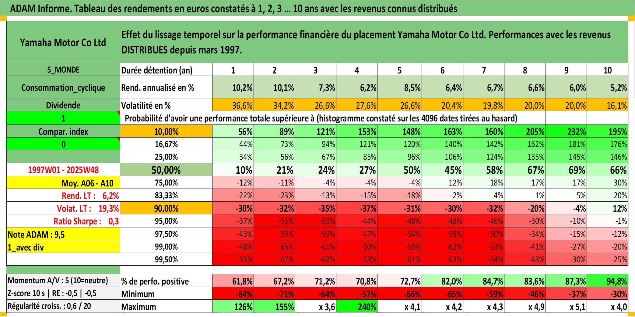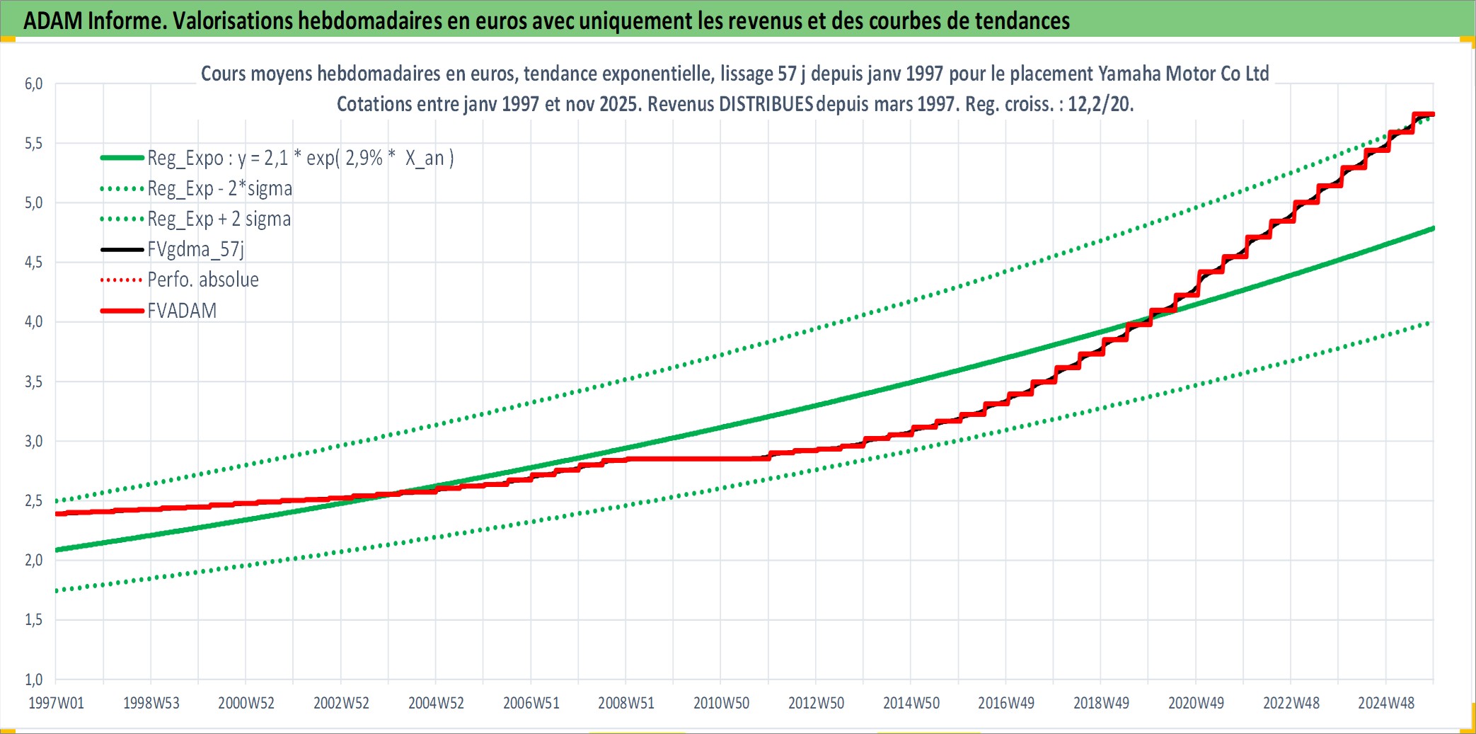 Site dédié aux investisseursPage dédiée sur site financeAnalyse des valorisations hebdomadaires de l'action Yamaha Motor Co Ltd. Cet actif est cote en JPY. Les valorisations sont en contrevaleur EURO et couvrent les semaines 1997W01 a 2025W48. Les revenus de cet actif financier sont pris en compte depuis la semaine 1997W13. La note globale ESG de cet actif est estimee a 15.0 (apres rebasage entre 0 et 20).