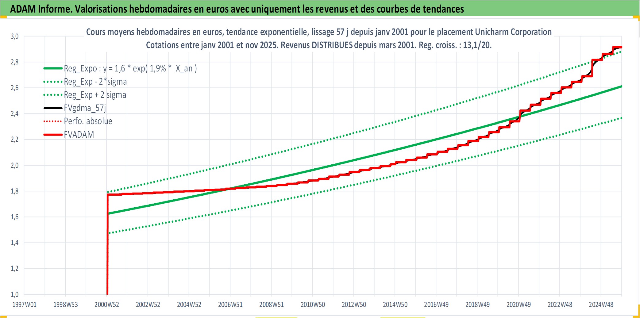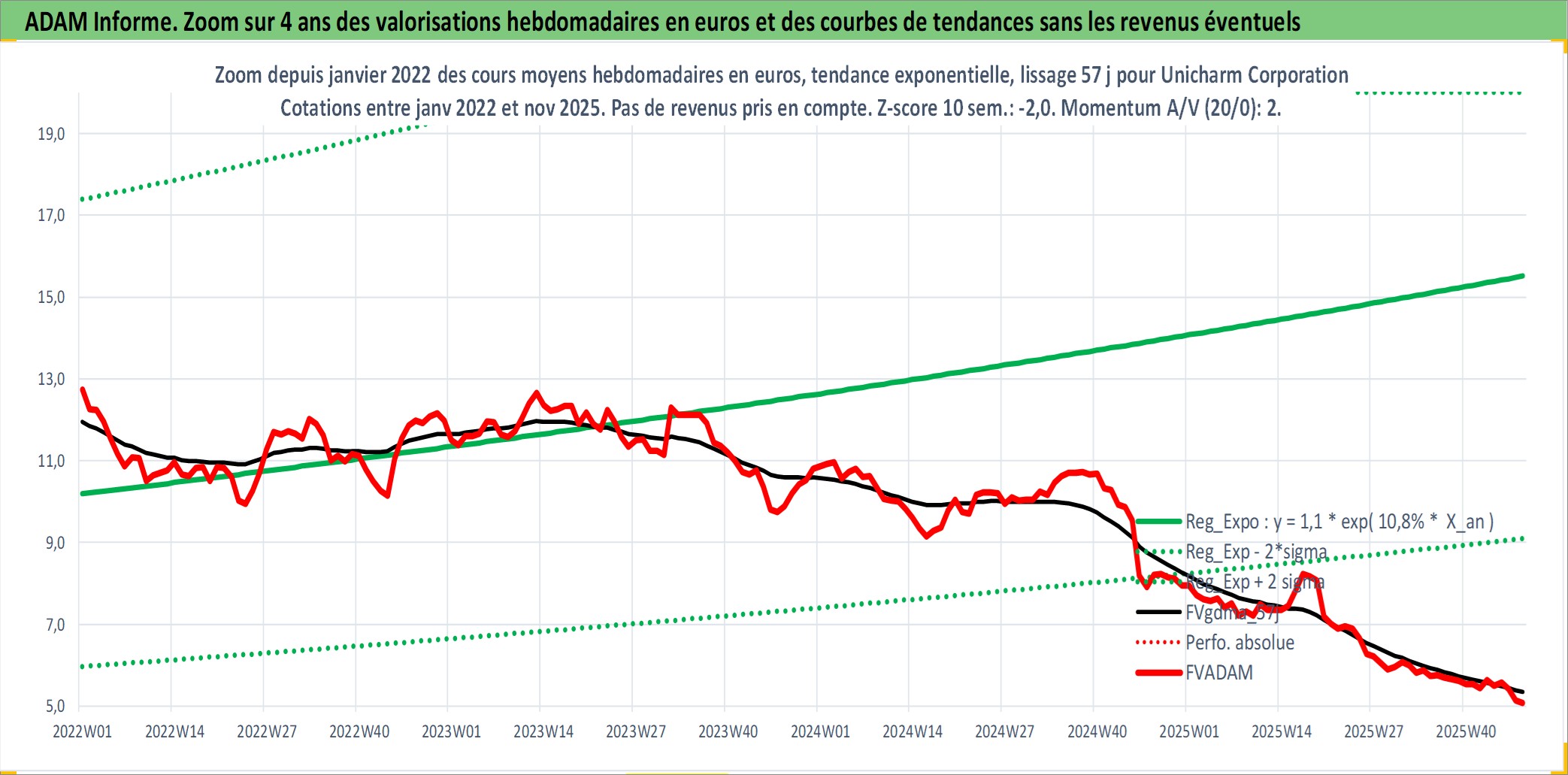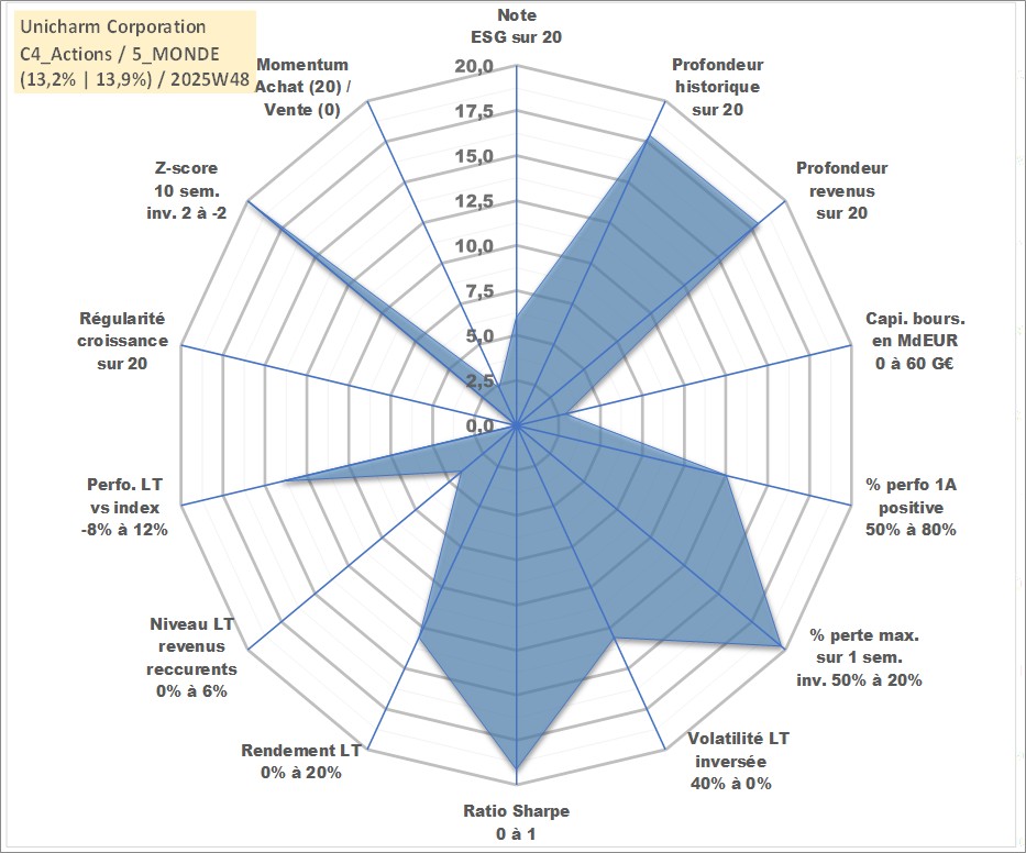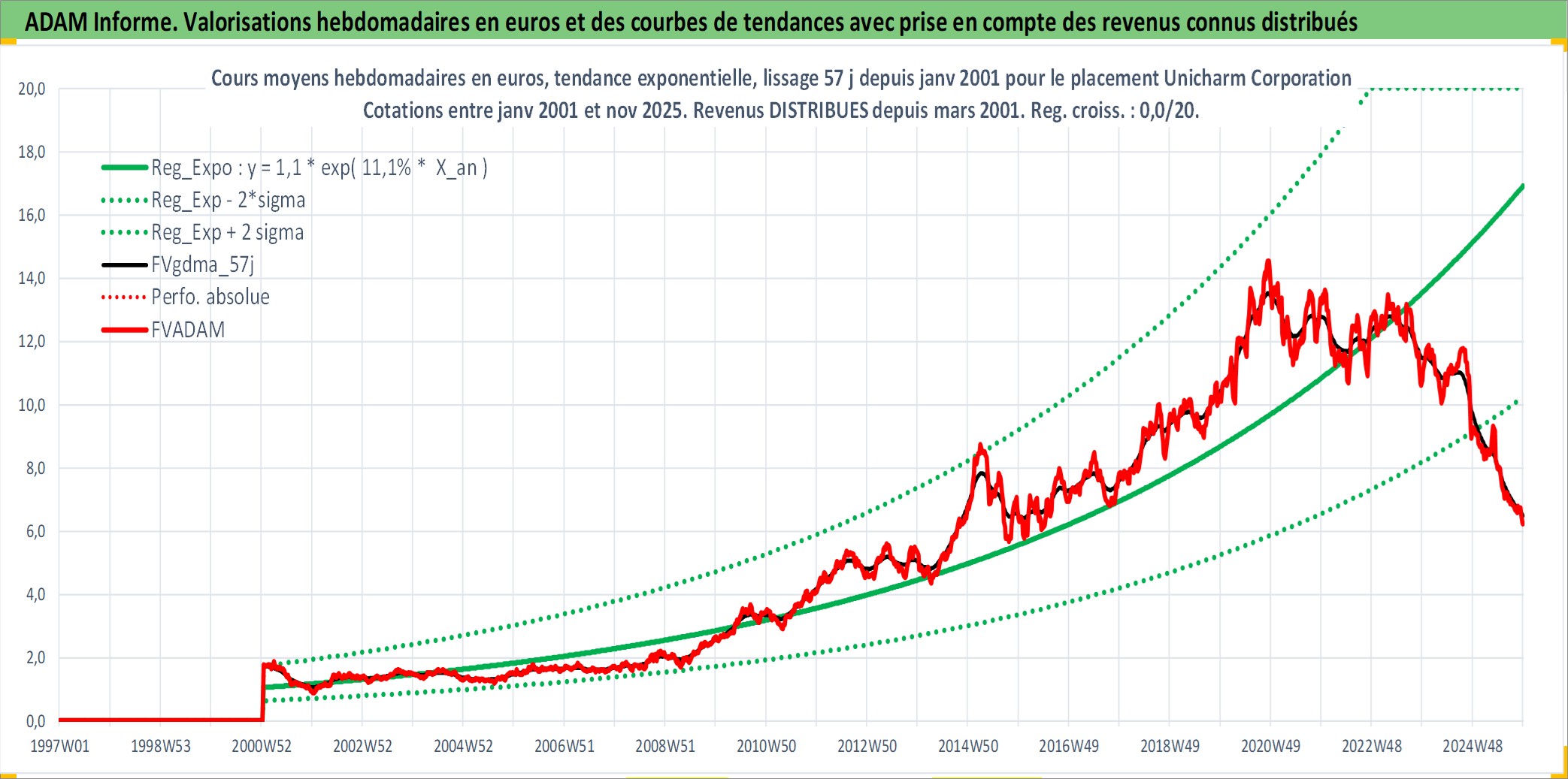Site dédié aux investisseursPage dédiée sur site financeAnalyse des valorisations hebdomadaires de l'action Unicharm Corporation. Cet actif est cote en JPY. Les valorisations sont en contrevaleur EURO et couvrent les semaines 2001W02 a 2025W48. Les revenus de cet actif financier sont pris en compte depuis la semaine 2001W13. La note globale ESG de cet actif est estimee a 6.0 (apres rebasage entre 0 et 20).