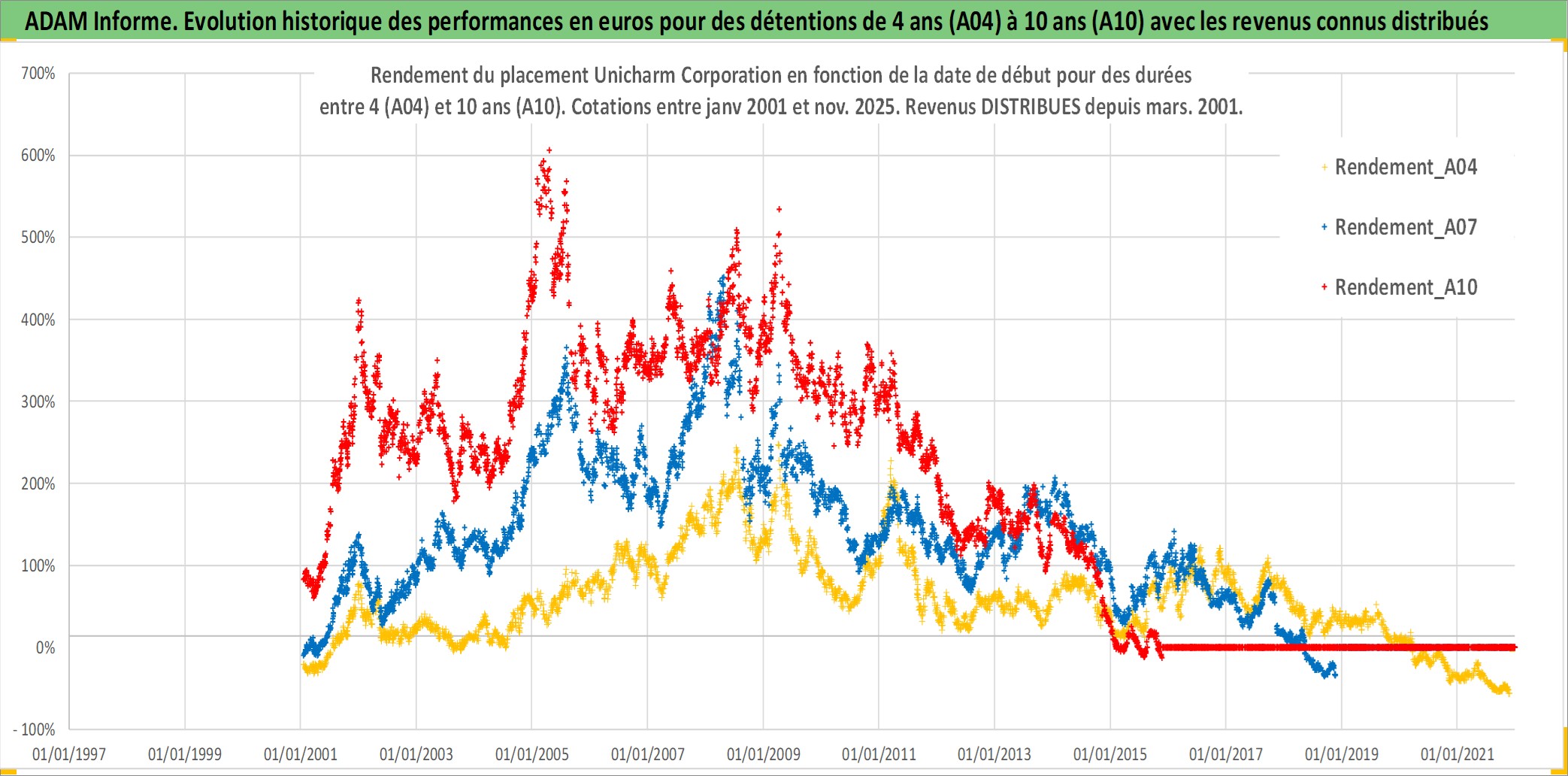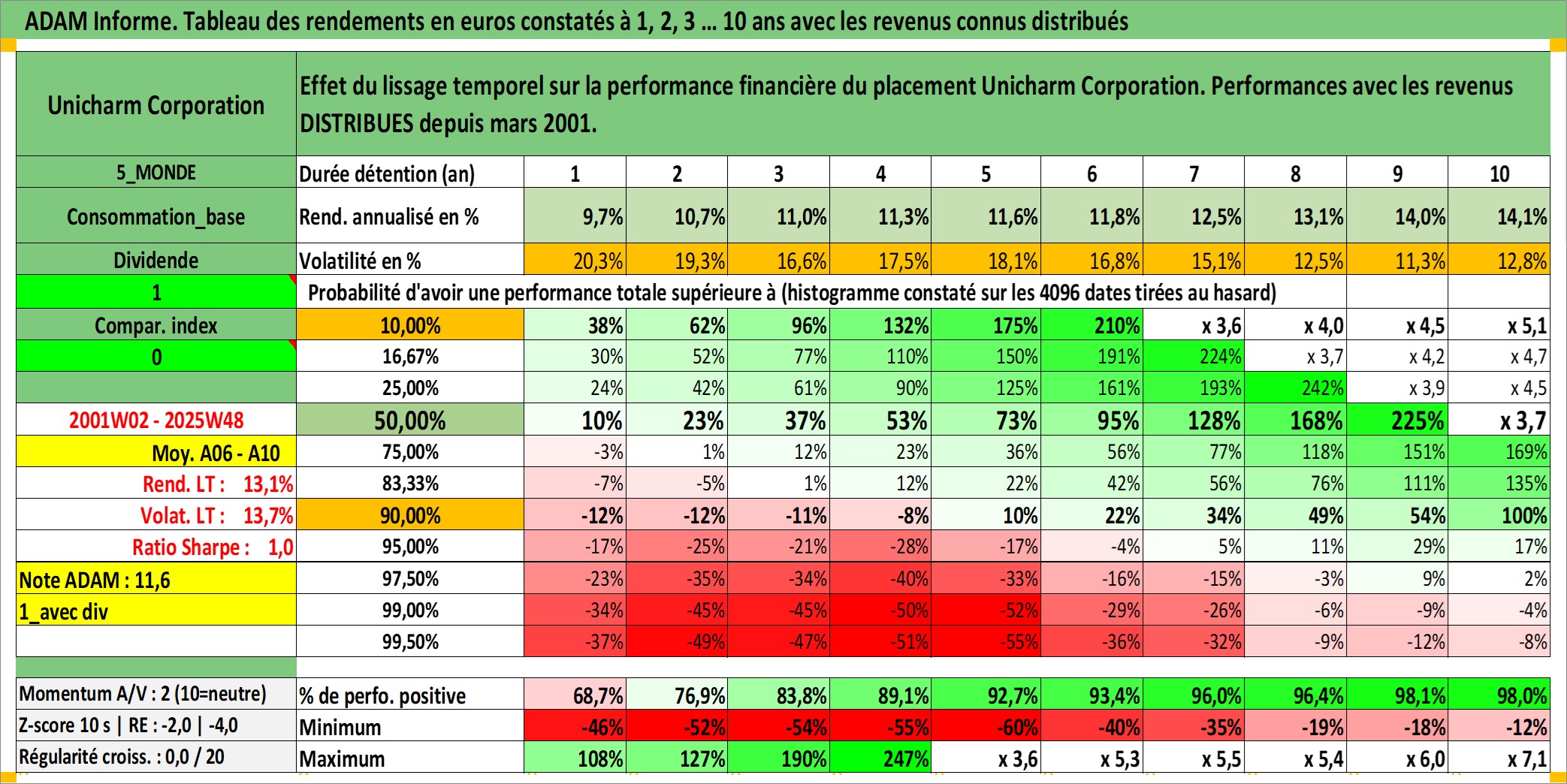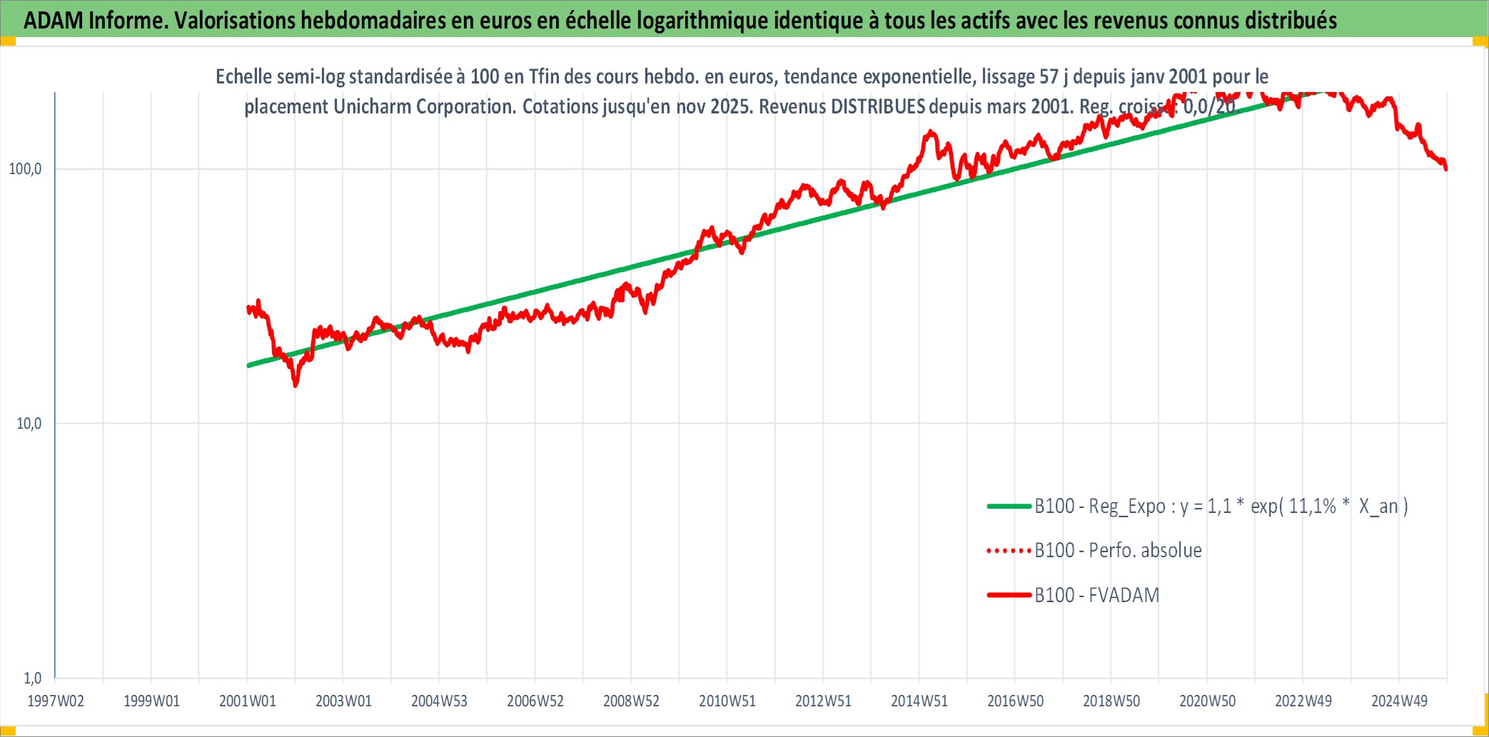 Site dédié aux investisseursPage dédiée sur site financeAnalyse des valorisations hebdomadaires de l'action Unicharm Corporation. Cet actif est cote en JPY. Les valorisations sont en contrevaleur EURO et couvrent les semaines 2001W02 a 2025W48. Les revenus de cet actif financier sont pris en compte depuis la semaine 2001W13. La note globale ESG de cet actif est estimee a 6.0 (apres rebasage entre 0 et 20).