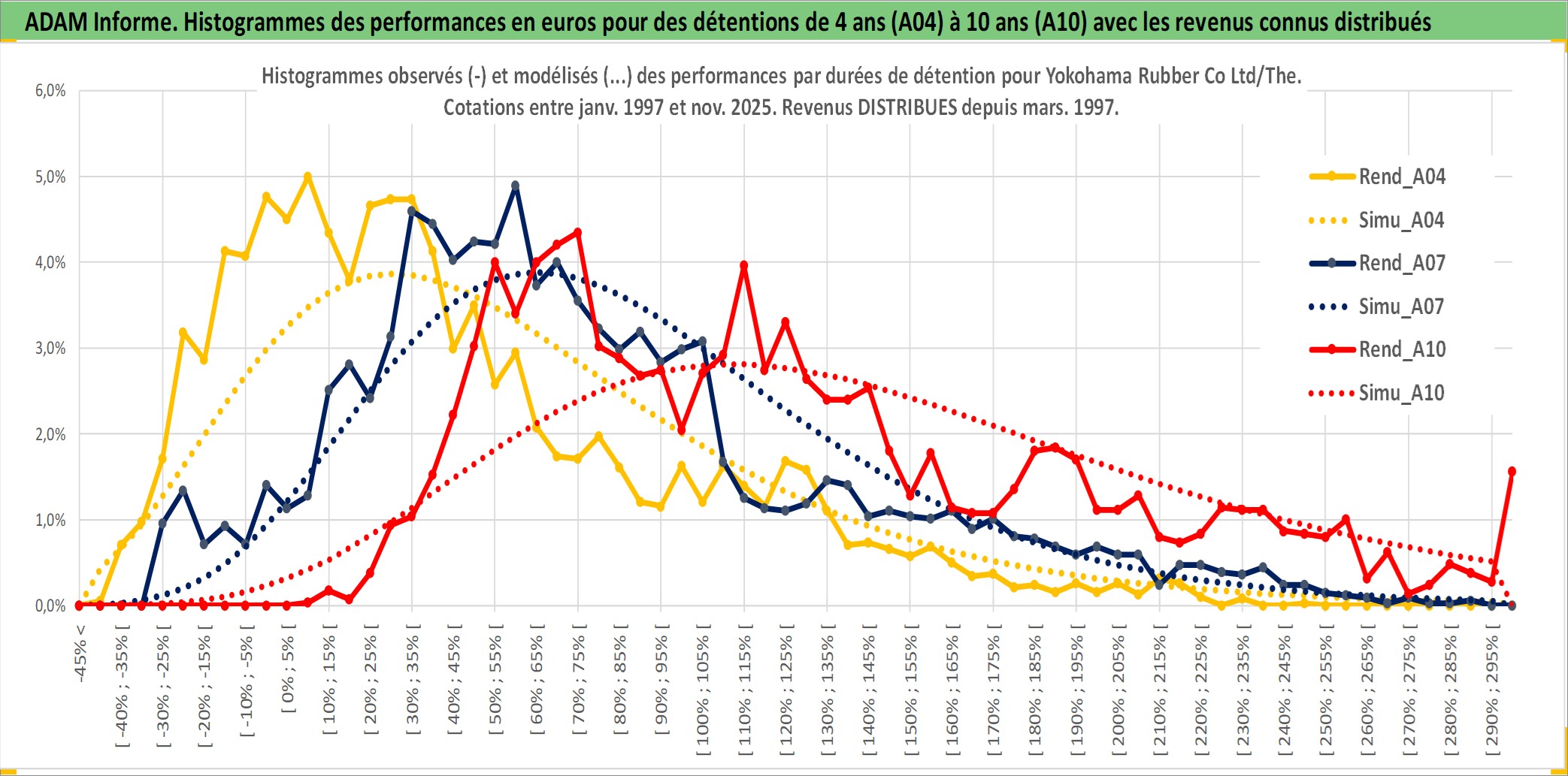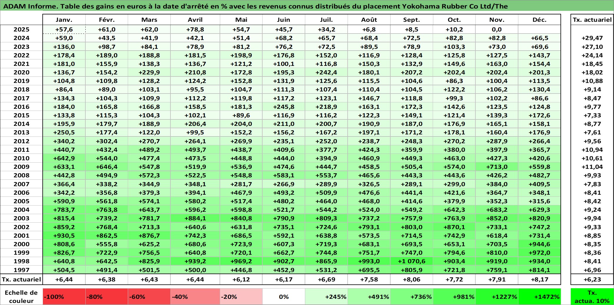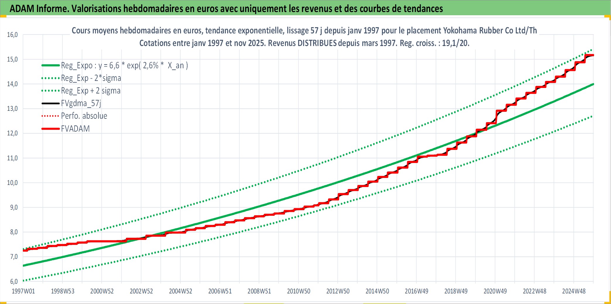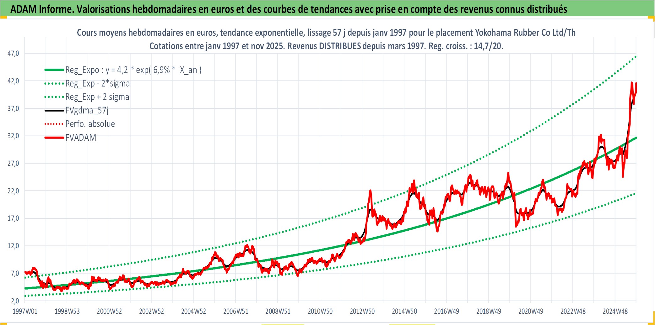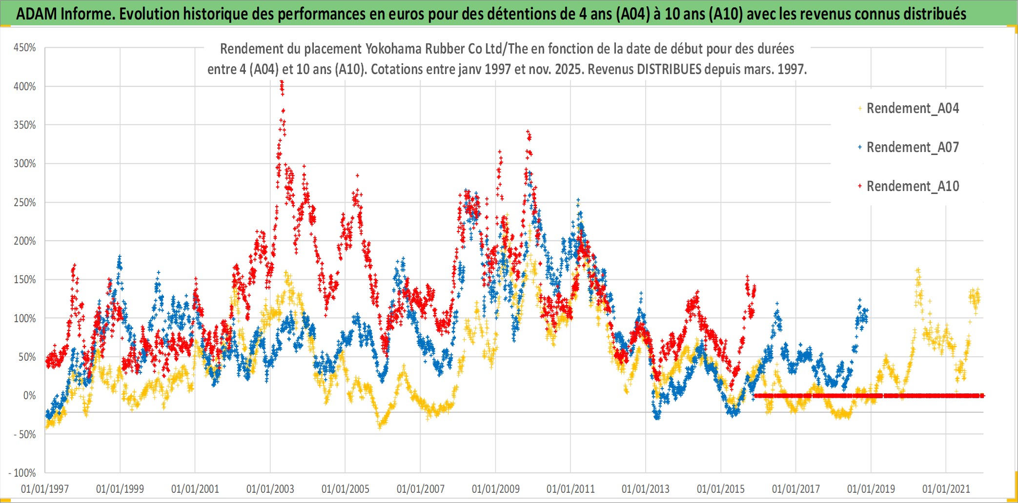 Site dédié aux investisseursPage dédiée sur site financeAnalyse des valorisations hebdomadaires de l'action Yokohama Rubber Co Ltd/The. Cet actif est cote en JPY. Les valorisations sont en contrevaleur EURO et couvrent les semaines 1997W01 a 2025W48. Les revenus de cet actif financier sont pris en compte depuis la semaine 1997W13. La note ESG de cet actif n'est pas connue.