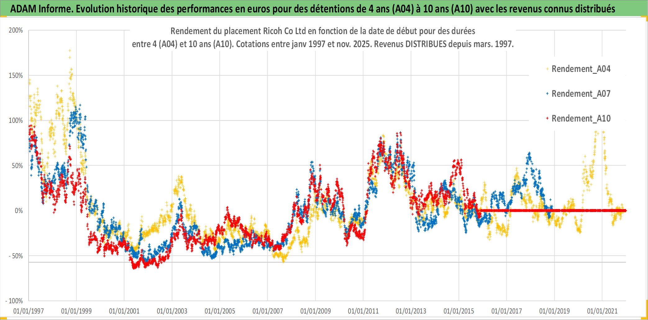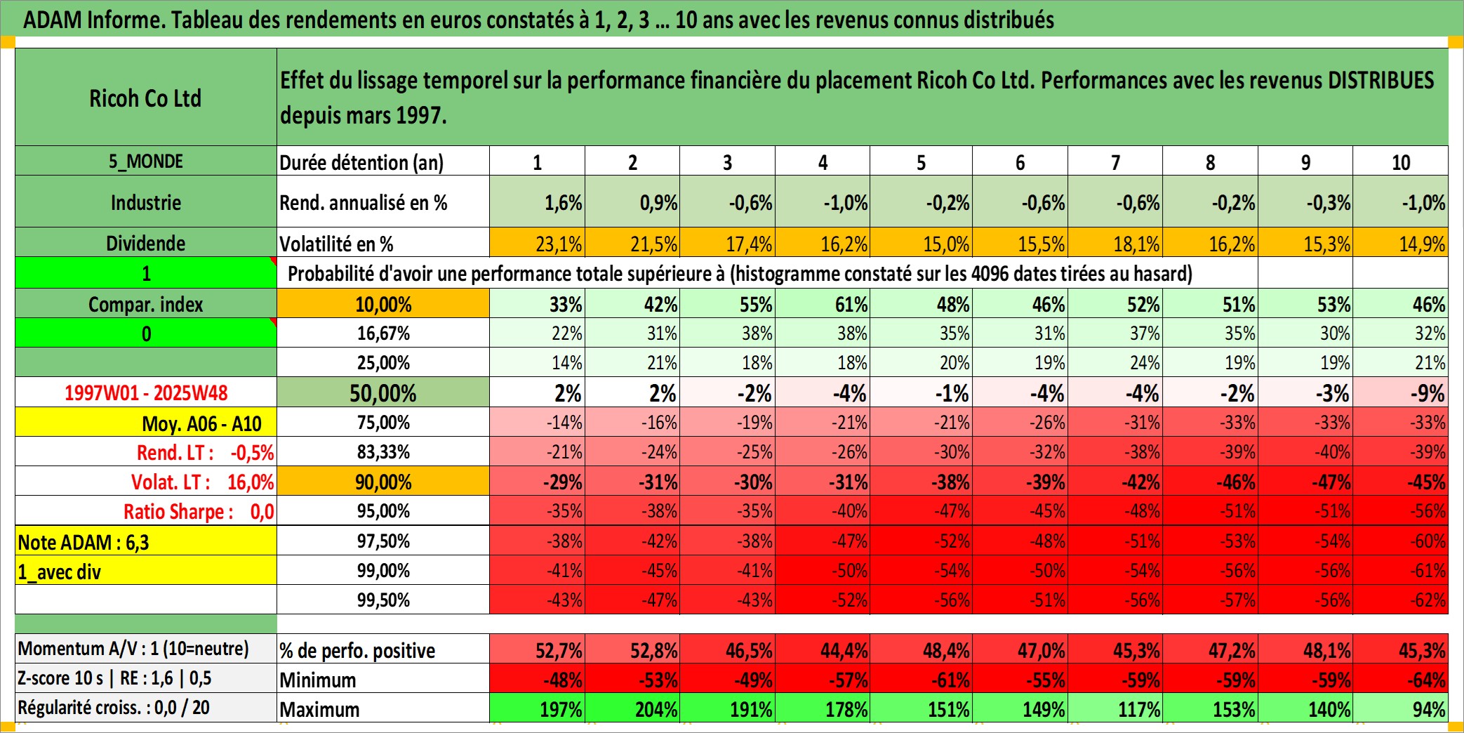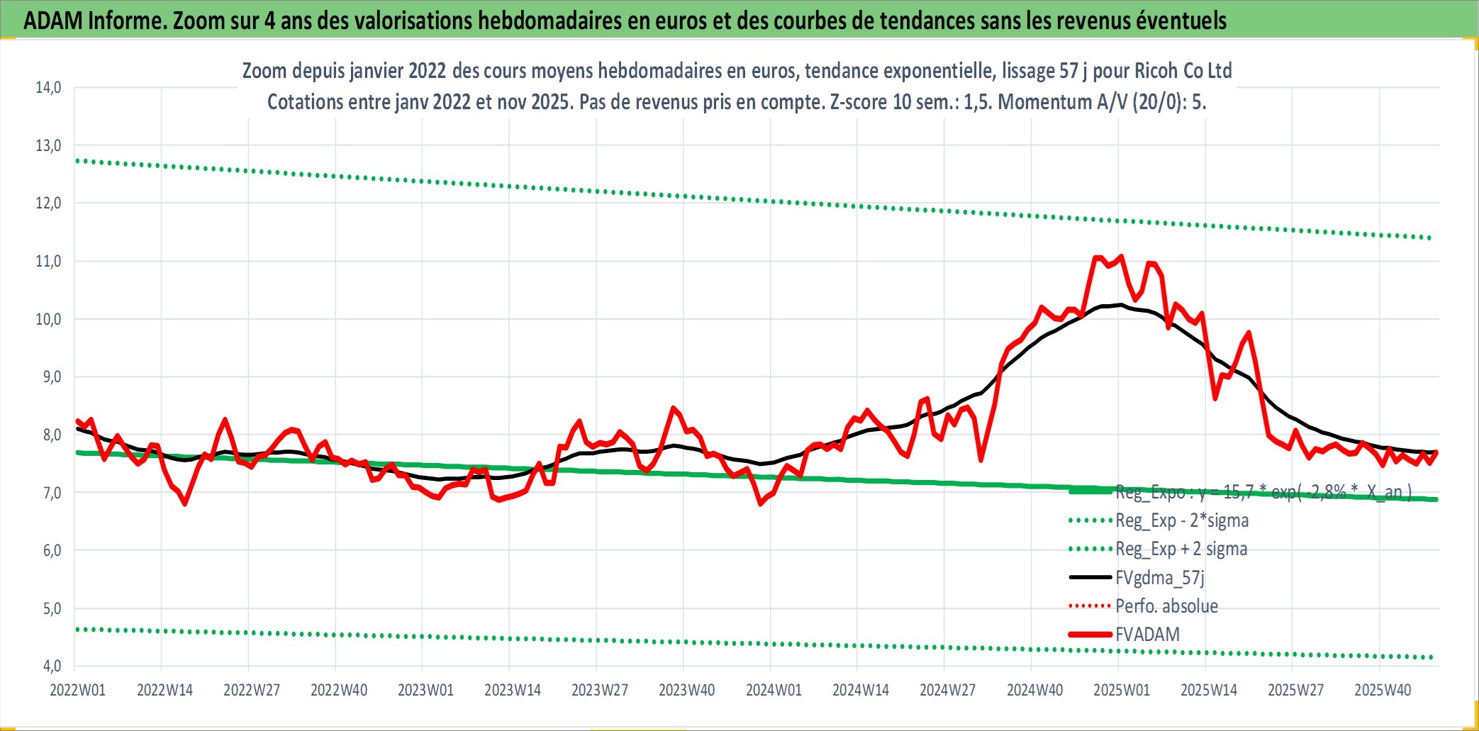 Site dédié aux investisseursPage dédiée sur site financeAnalyse des valorisations hebdomadaires de l'action Ricoh Co Ltd. Cet actif est cote en JPY. Les valorisations sont en contrevaleur EURO et couvrent les semaines 1997W01 a 2025W48. Les revenus de cet actif financier sont pris en compte depuis la semaine 1997W13. La note globale ESG de cet actif est estimee a 11.0 (apres rebasage entre 0 et 20).
