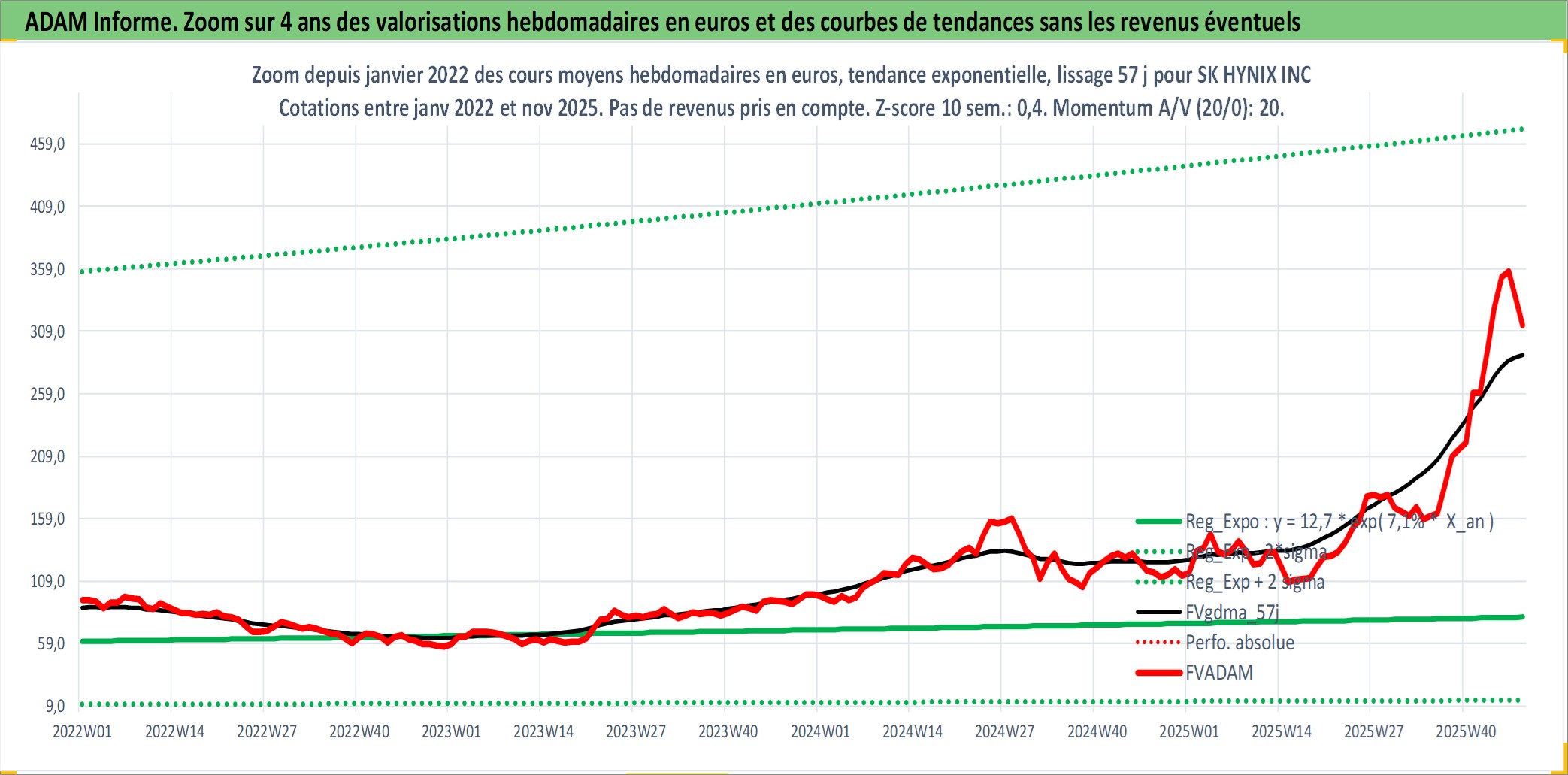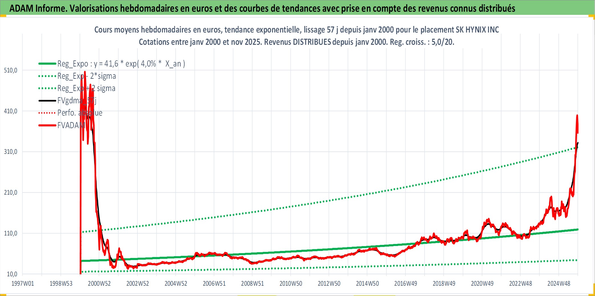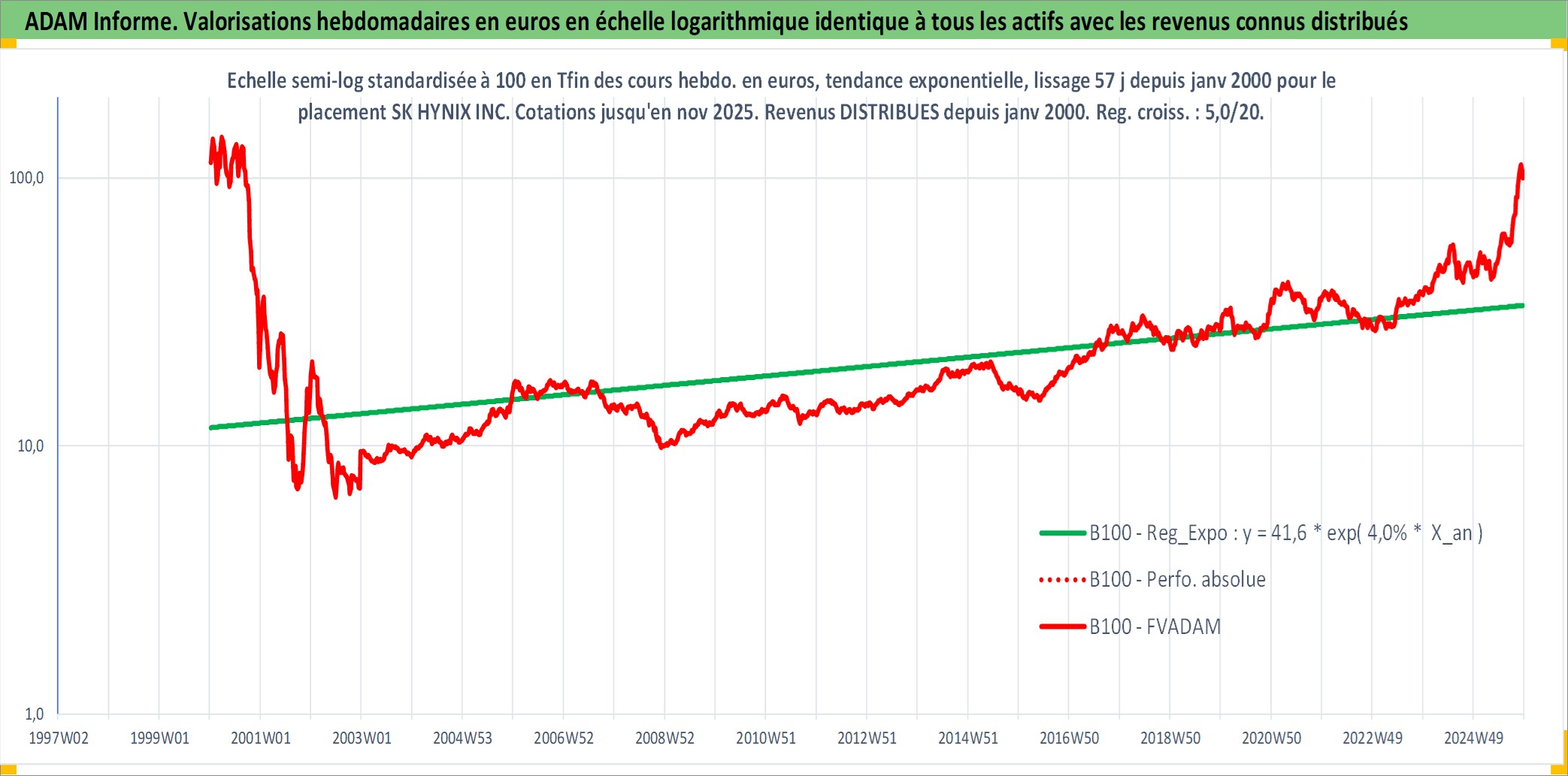 Site dédié aux investisseursPage dédiée sur site financeAnalyse des valorisations hebdomadaires de l'action SK HYNIX INC. Cet actif est cote en KRW. Les valorisations sont en contrevaleur EURO et couvrent les semaines 2000W02 a 2025W48. Les revenus de cet actif financier sont pris en compte depuis la semaine 2000W01. La note globale ESG de cet actif est estimee a 11.0 (apres rebasage entre 0 et 20).